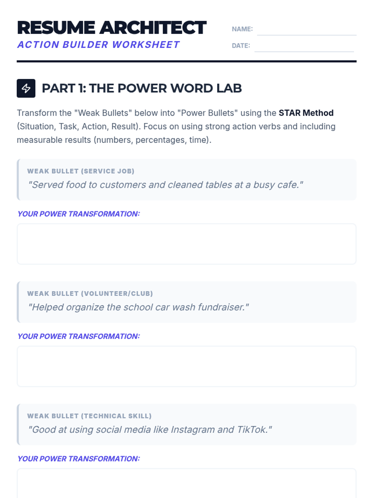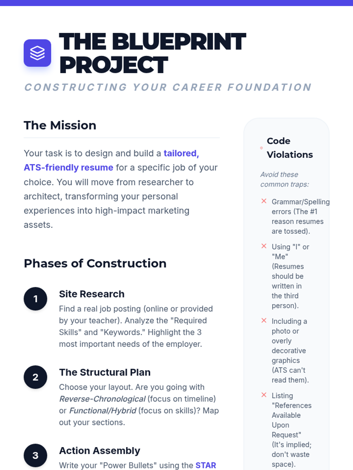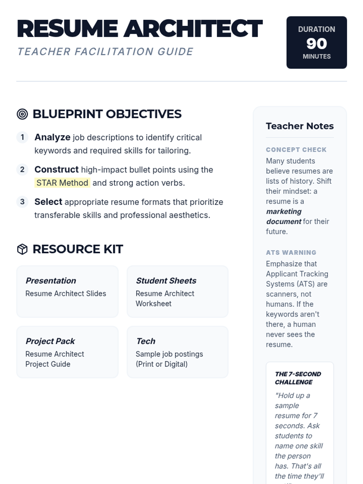 This lesson guides students through the process of building a professional resume from scratch, focusing on translating high school experiences into compelling professional bullet points.