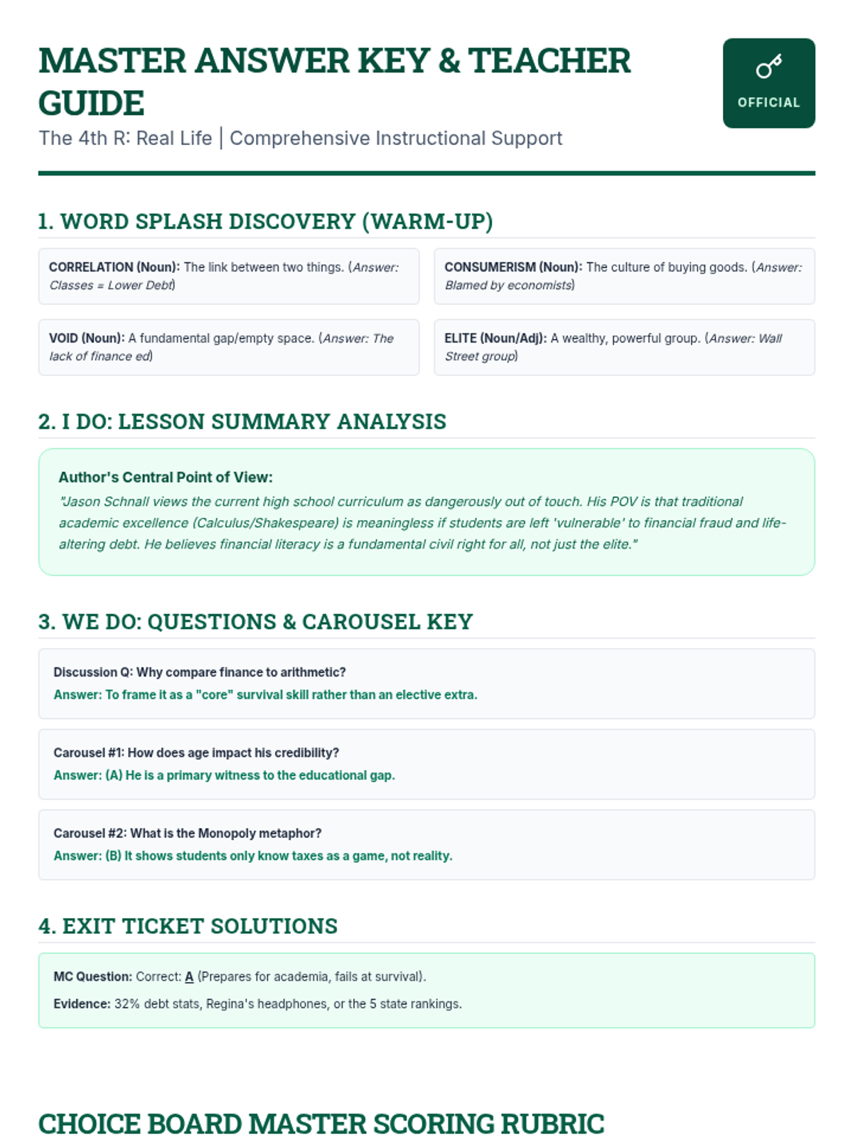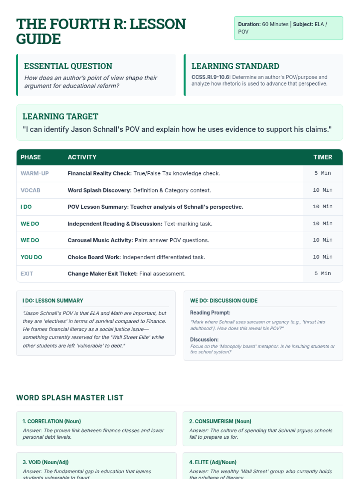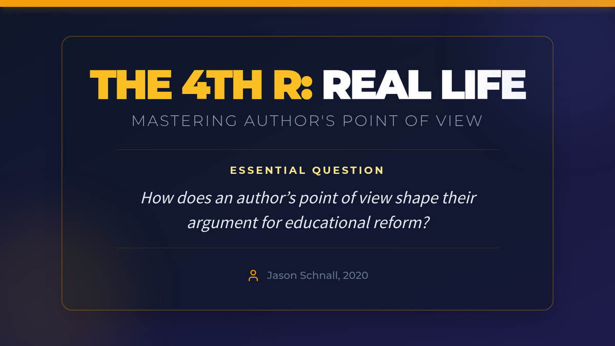 A 60-minute lesson on analyzing author's point of view using the text "The 4th R: Real Life," featuring a word splash, carousel activity, and choice board.
