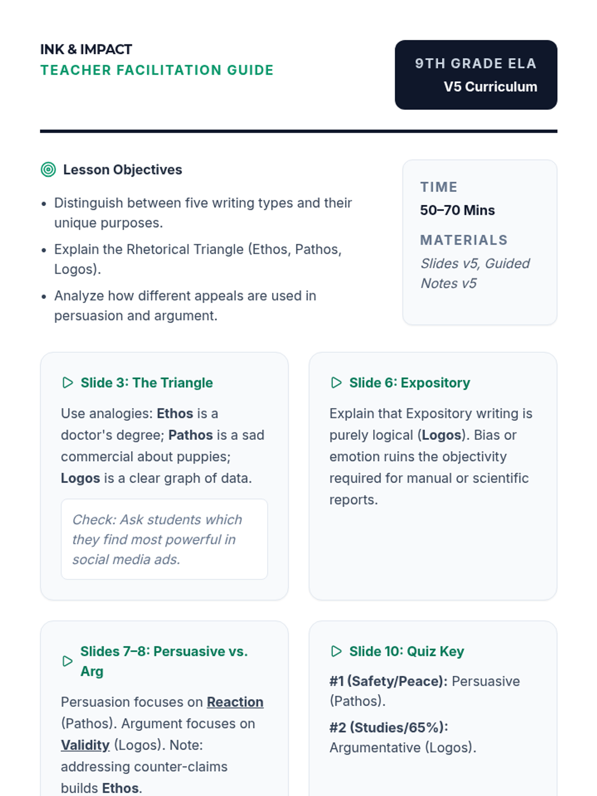A tiered persuasive writing lesson designed for mixed-grade or scaffolded classrooms (9th-11th). Core concepts like Ethos, Pathos, and Logos are taught alongside advanced techniques like Kairos and Steel Manning, allowing students of different levels to collaborate and learn from one another.