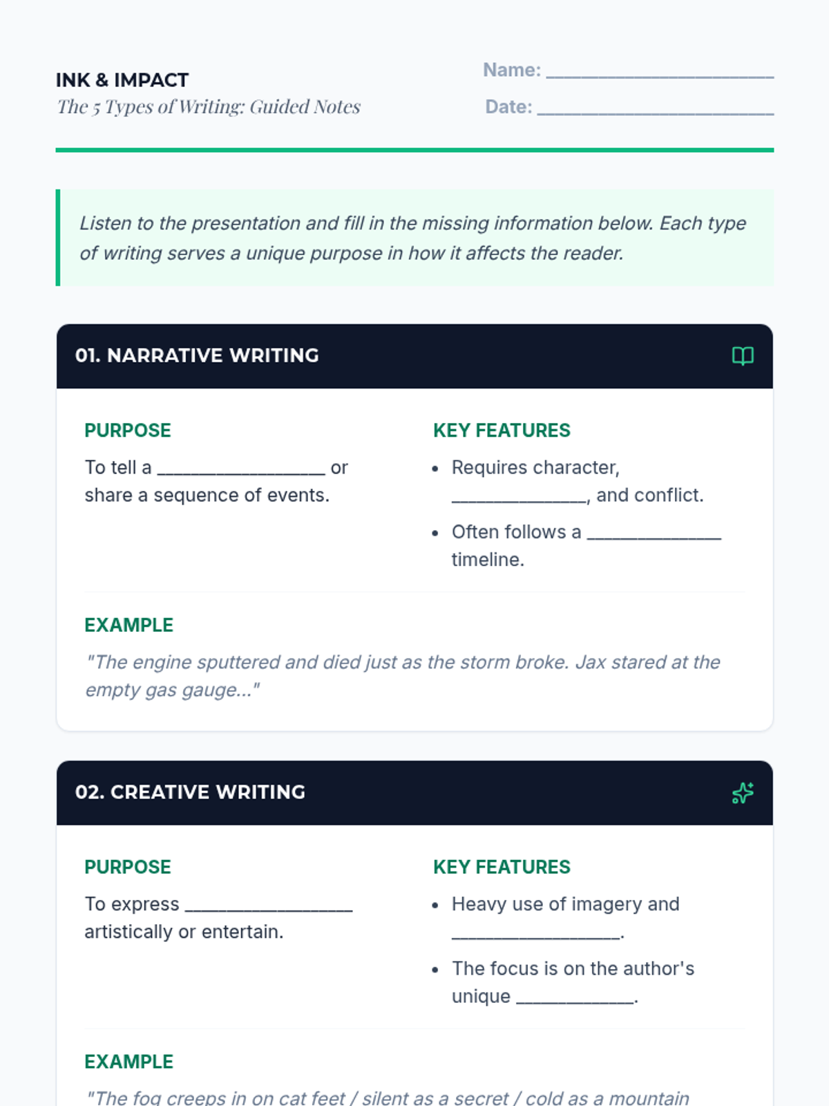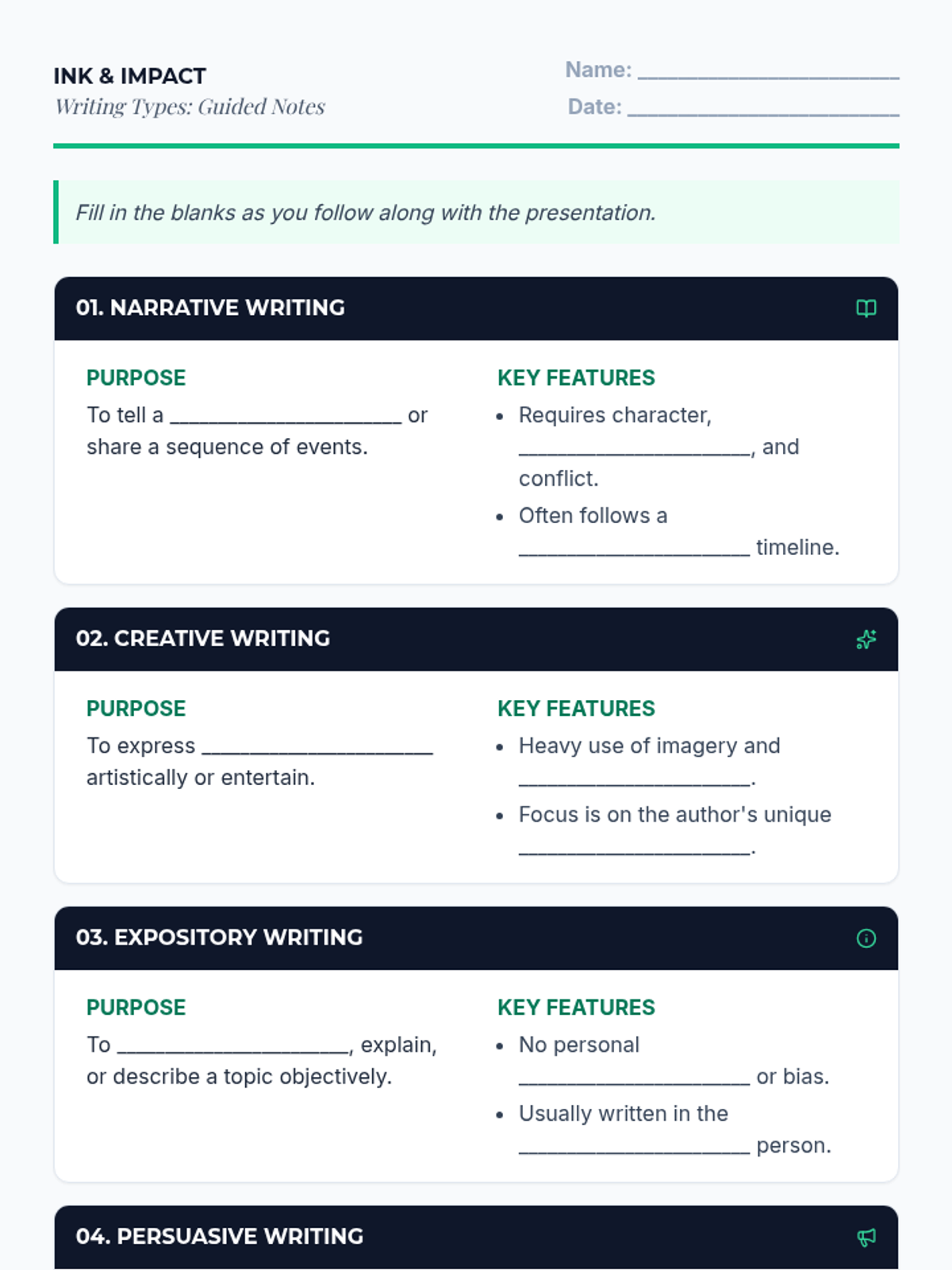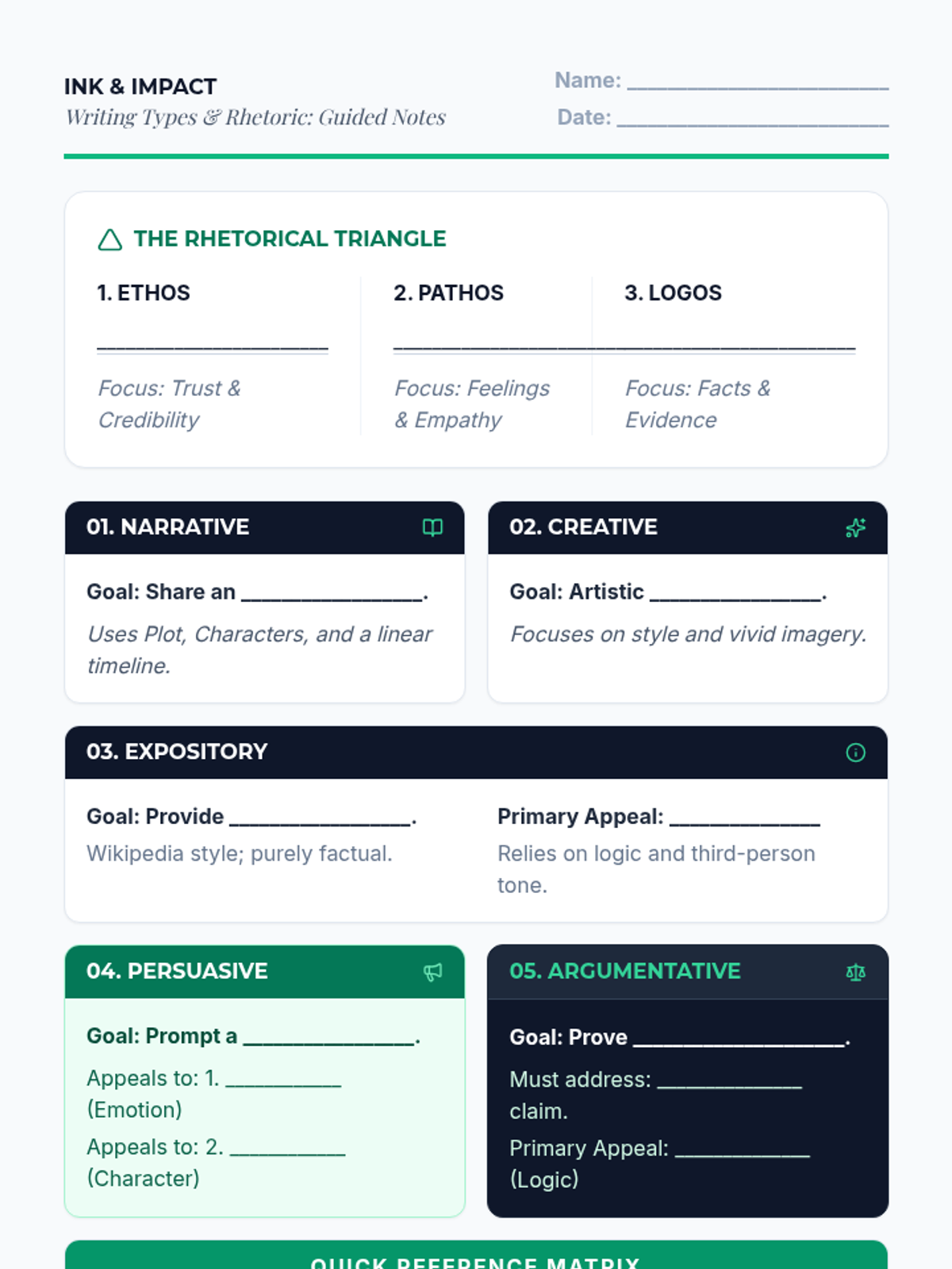 An introductory exploration of five major writing types: Narrative, Creative, Expository, Persuasive, and Argumentative. Students learn to distinguish between these forms based on purpose, structure, and audience impact.