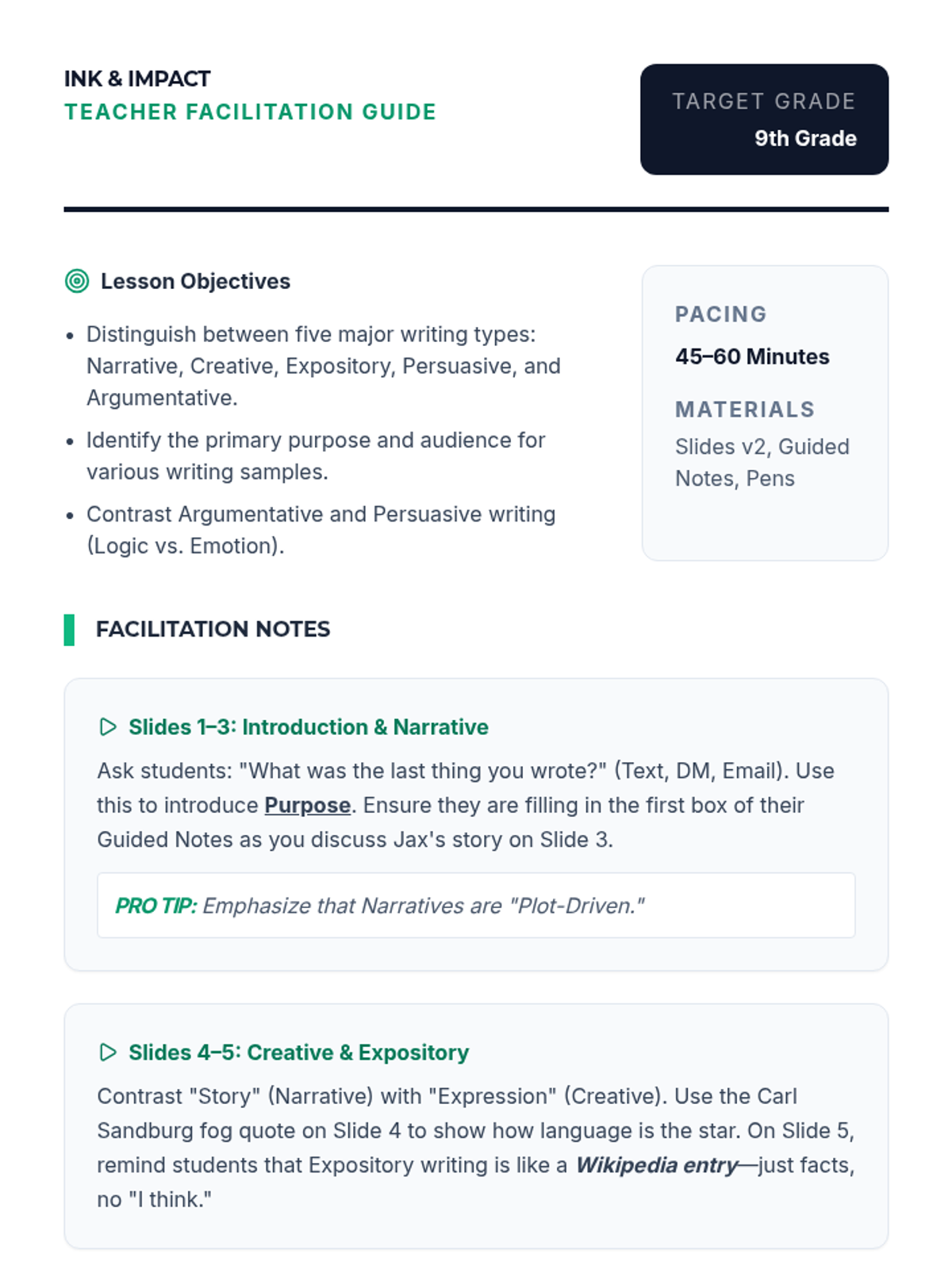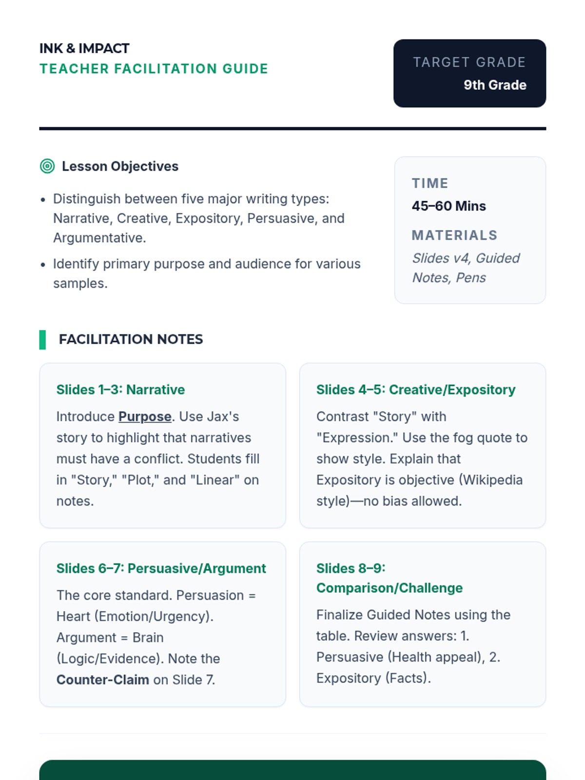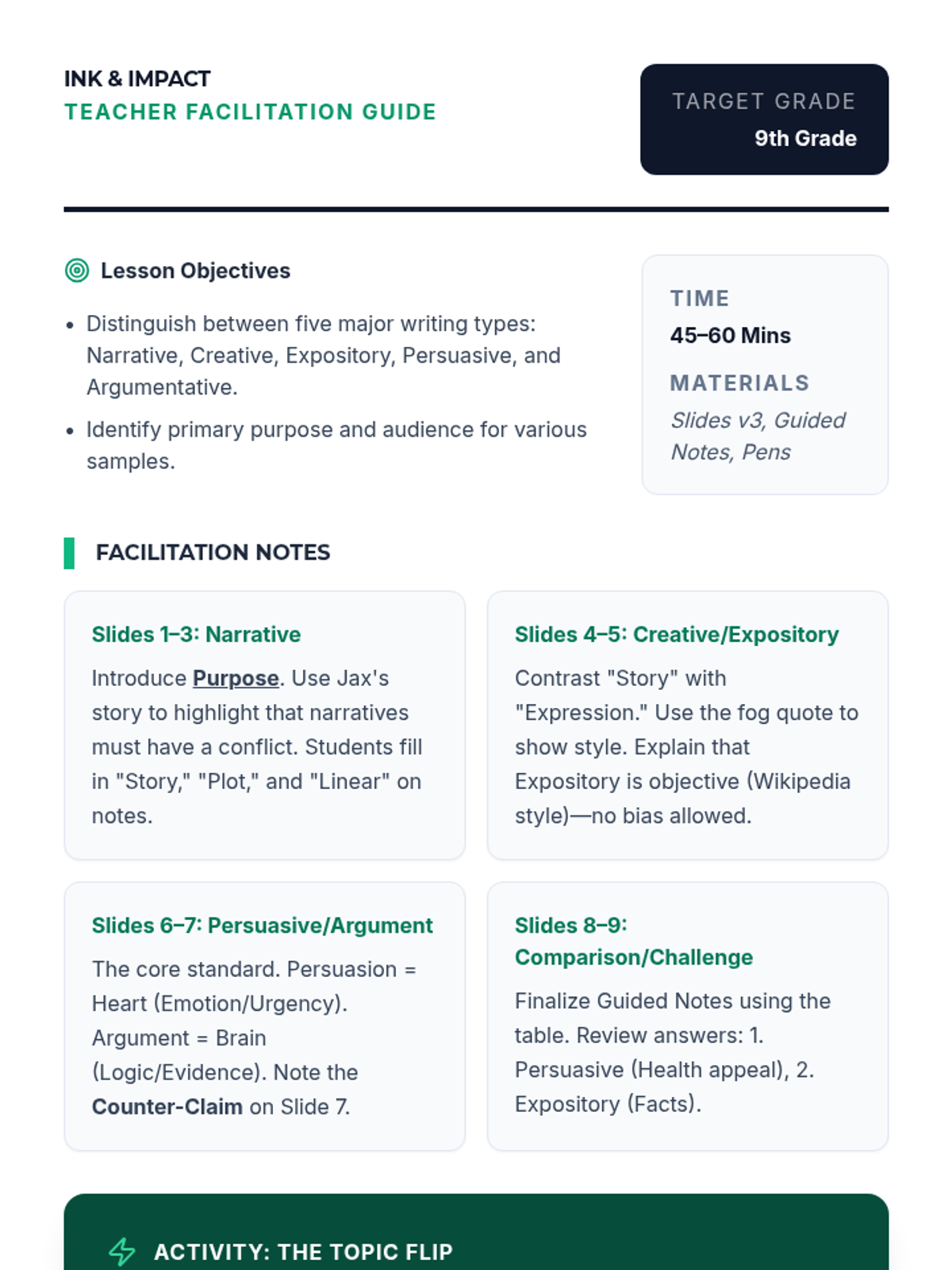 An introductory exploration of five major writing types: Narrative, Creative, Expository, Persuasive, and Argumentative. Students learn to distinguish between these forms based on purpose, structure, and audience impact.