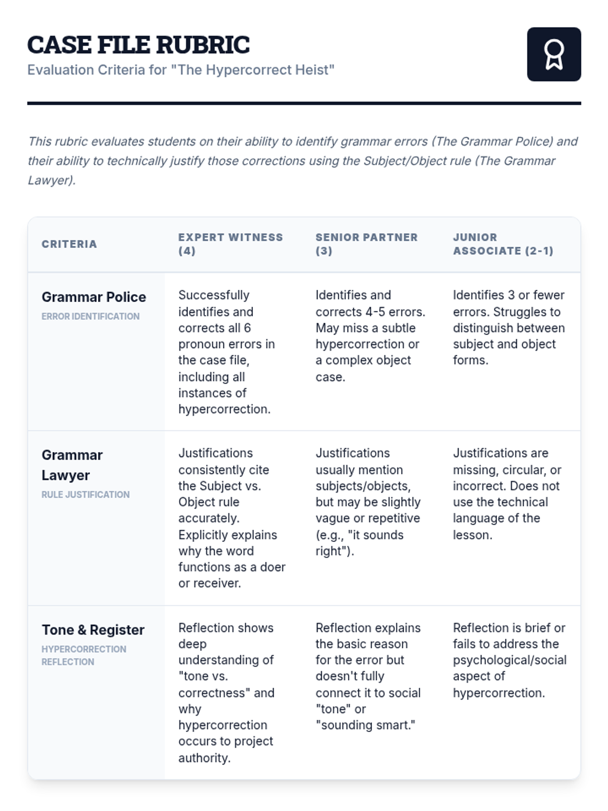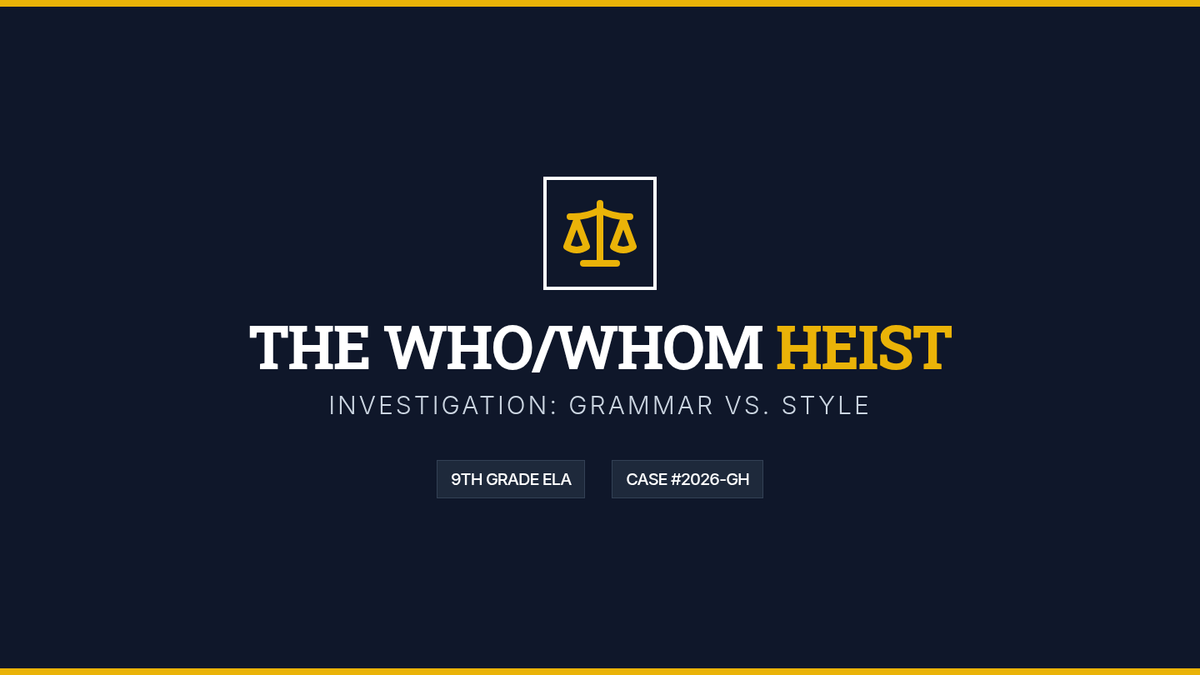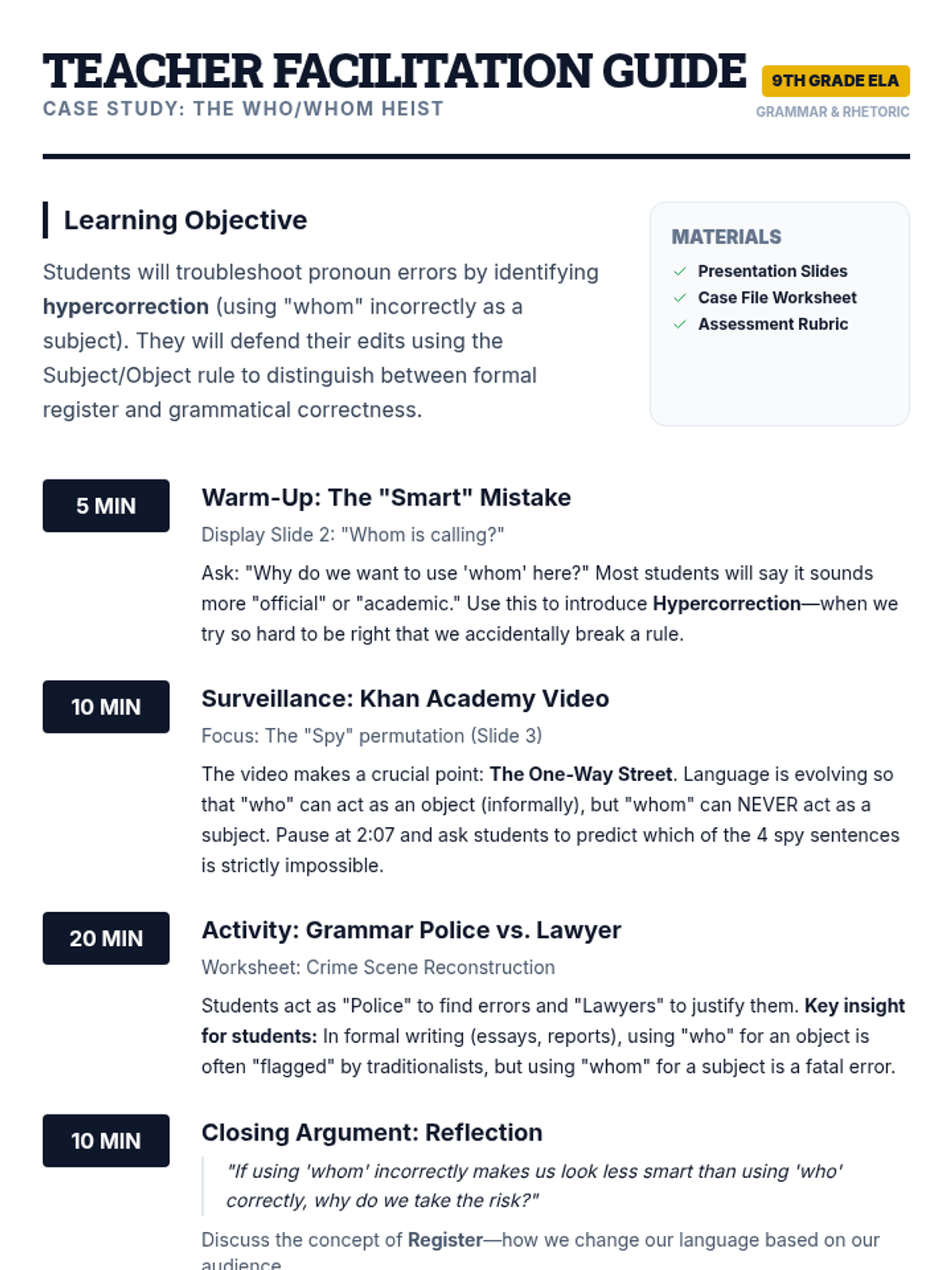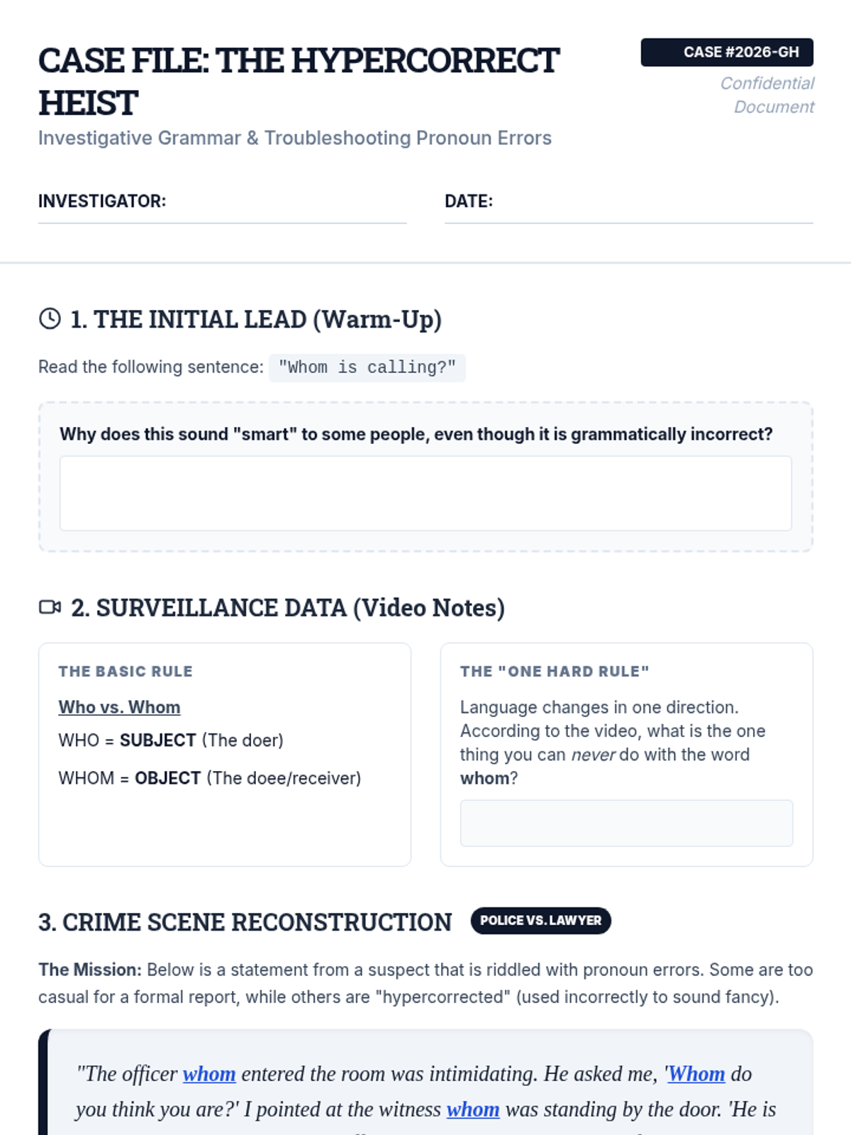 Students will master the distinction between 'who' and 'whom', focusing on identifying hypercorrection and understanding the 'one-way street' of language evolution. The lesson uses a legal investigation theme to engage students in technical grammar analysis.