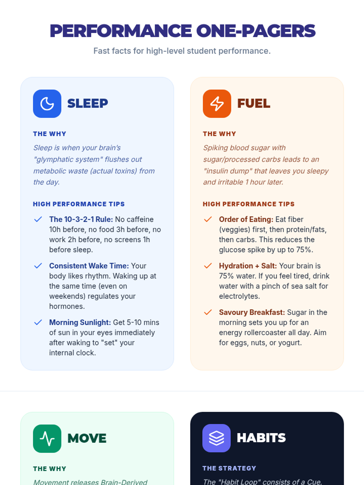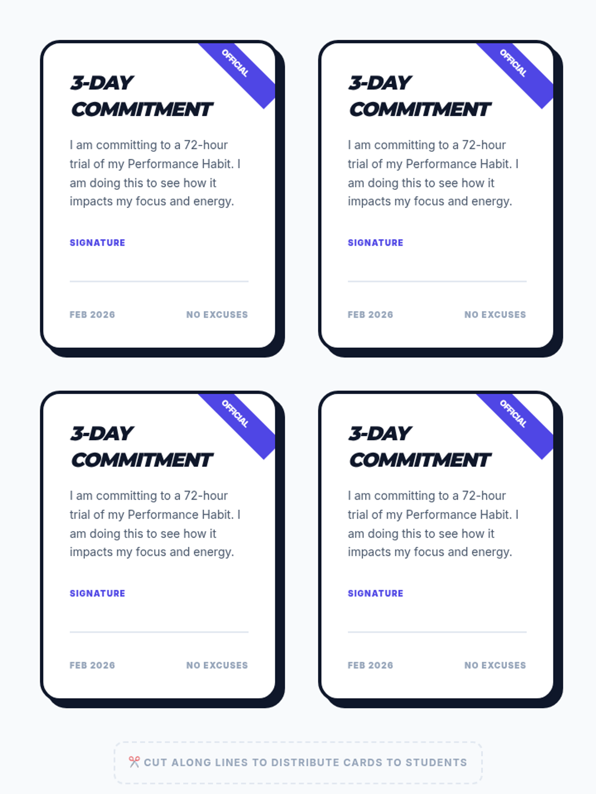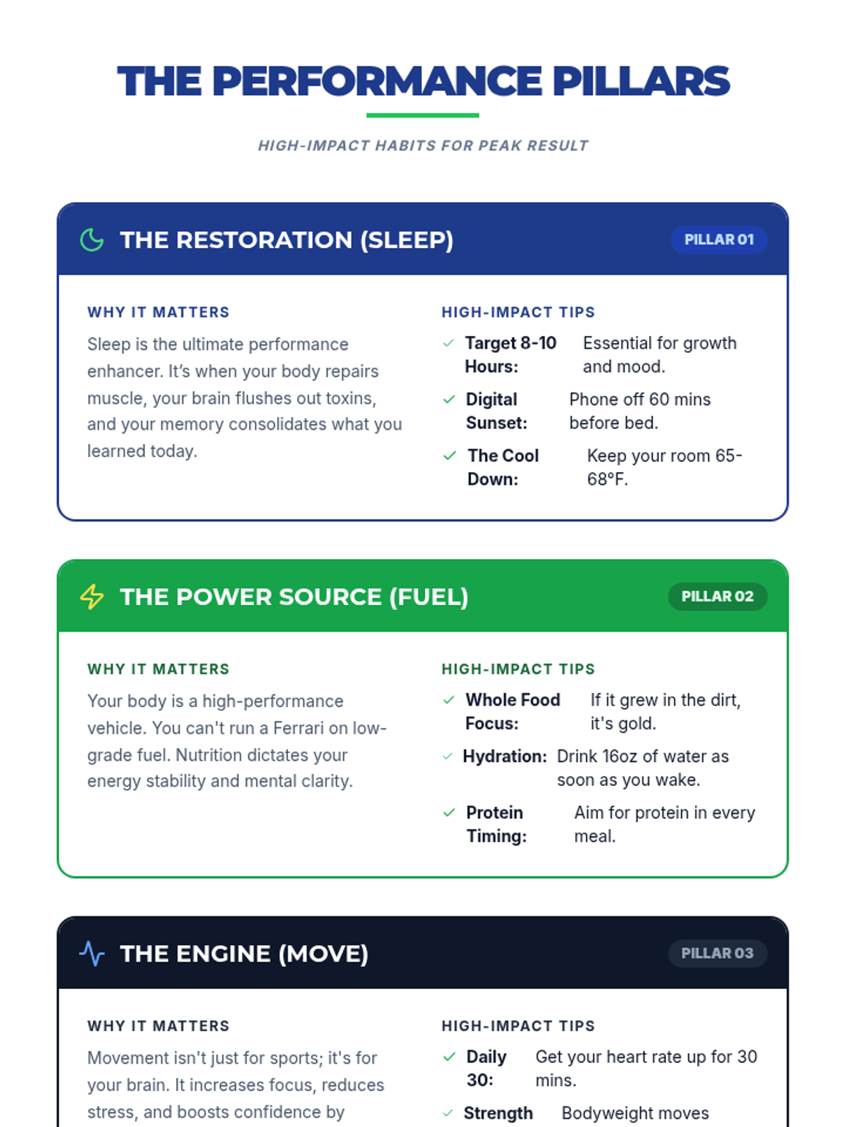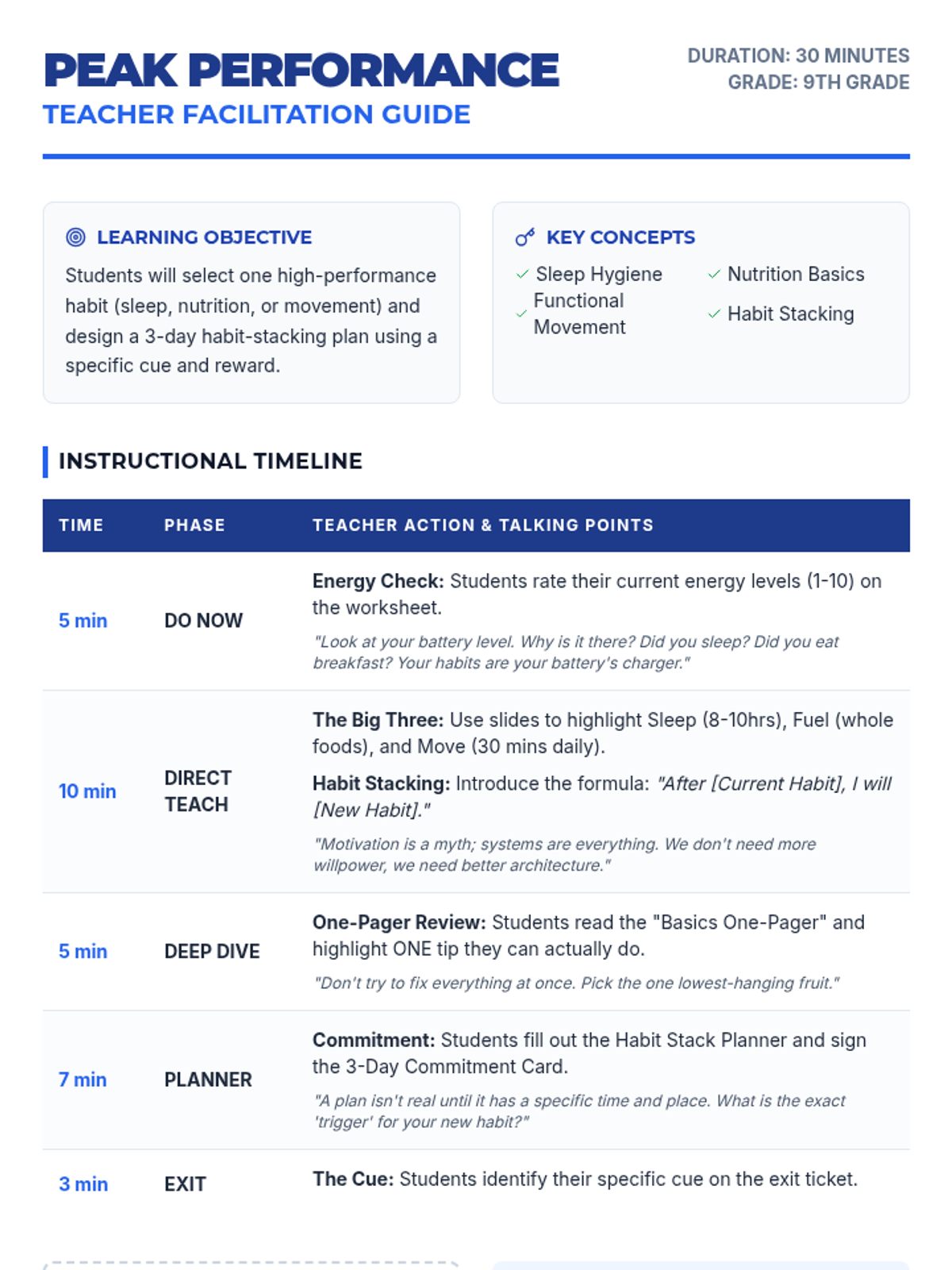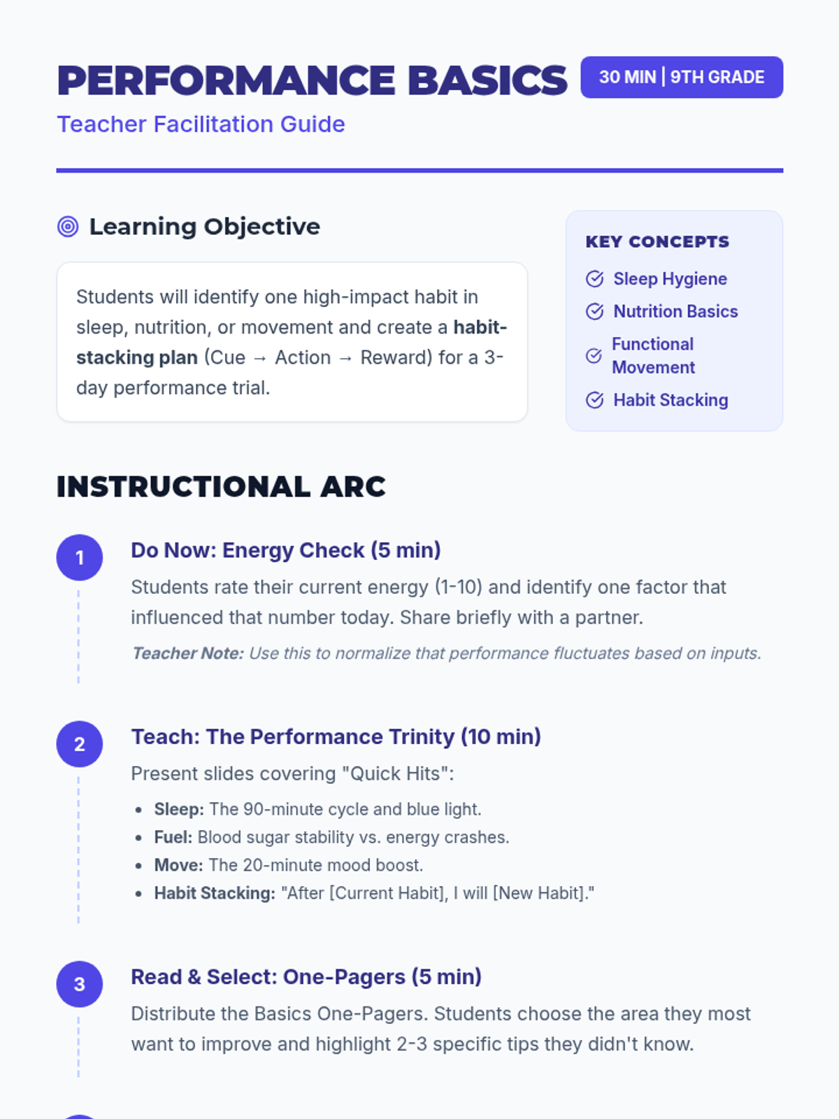 A fast-paced, 30-minute introduction to the fundamental pillars of physical performance—sleep, nutrition, and movement—culminating in a concrete habit-stacking plan for students to implement over three days.