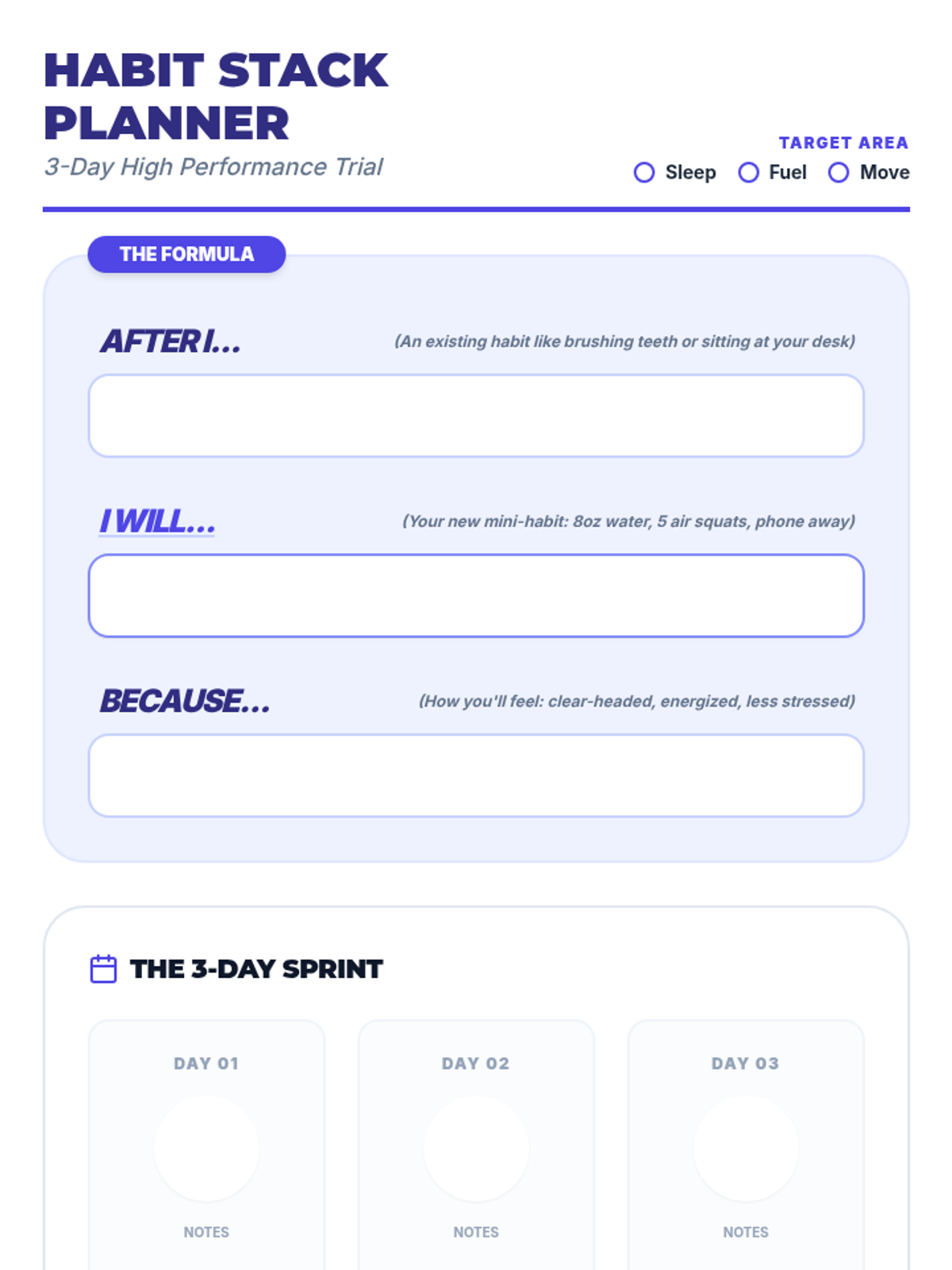 A fast-paced, 30-minute introduction to the 'big three' of performance—sleep, nutrition, and movement—culminating in a concrete habit-stacking plan for a 3-day trial.