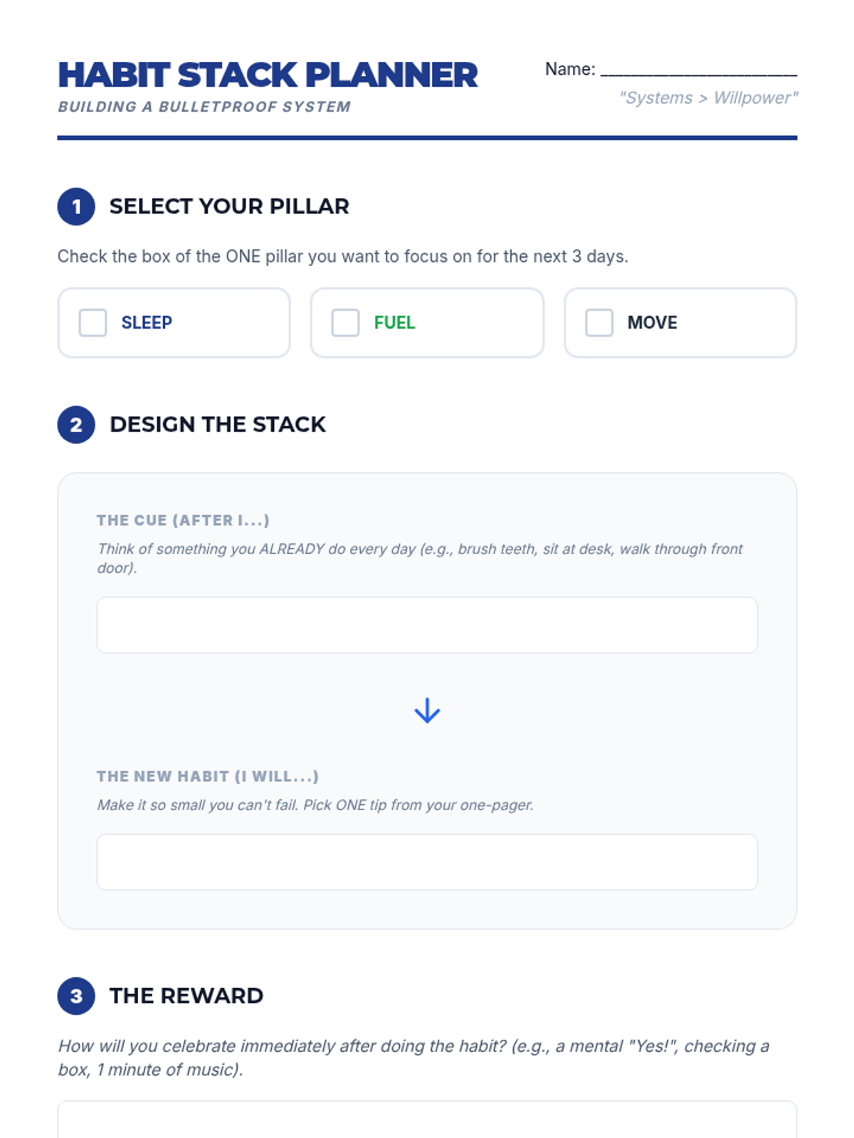 A fast-paced 30-minute lesson focused on the foundational pillars of physical performance—sleep, nutrition, and movement—and how to implement small changes through habit stacking.
