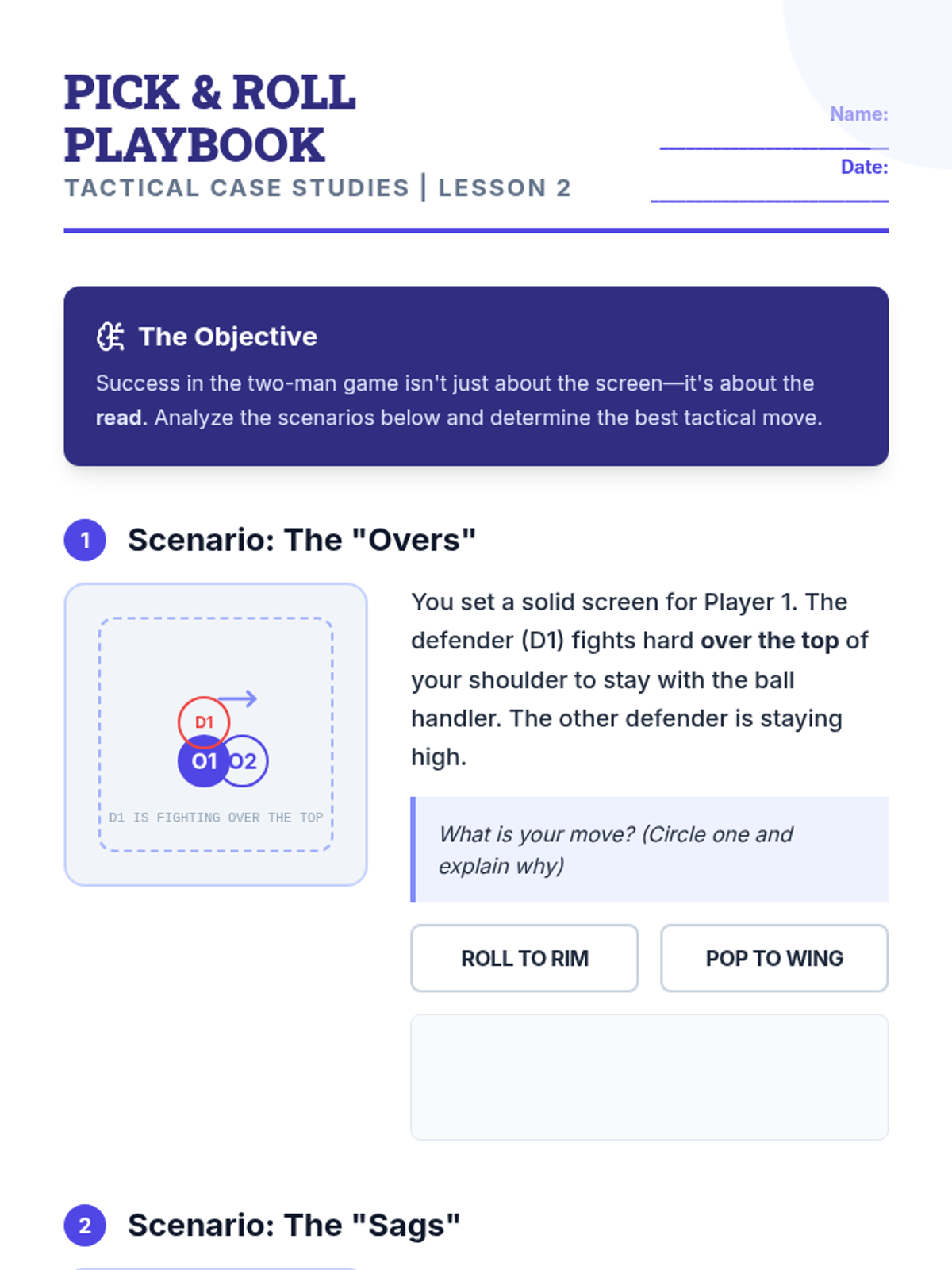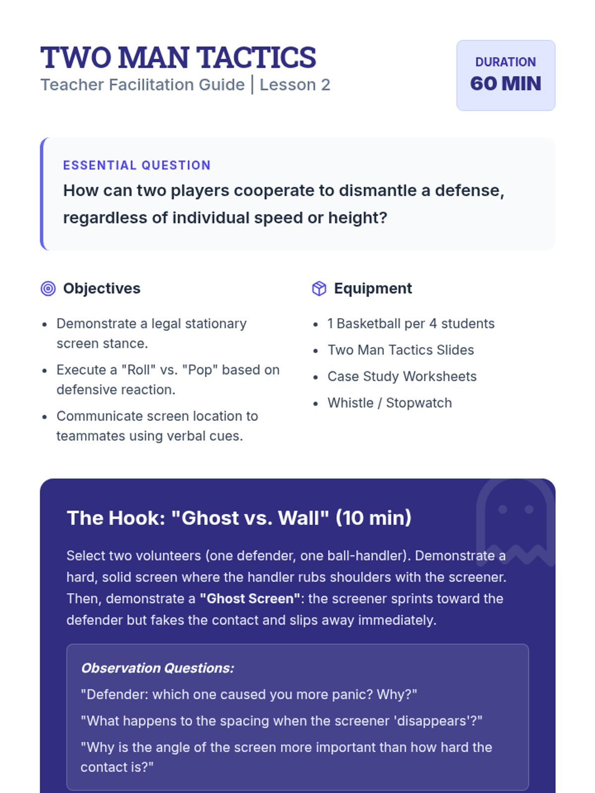 This lesson introduces the two-man game, focusing on setting effective screens and executing the pick-and-roll. Students analyze case studies of successful plays to understand the timing of the roll versus the pop. Drills involve 2v2 scenarios to practice decision-making based on how the defense reacts.
