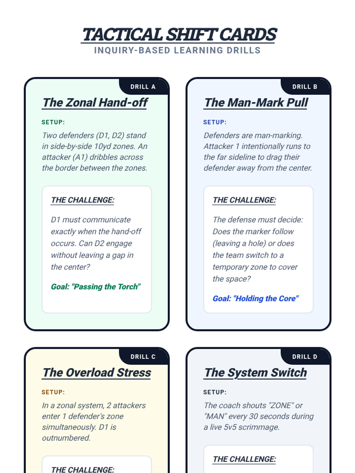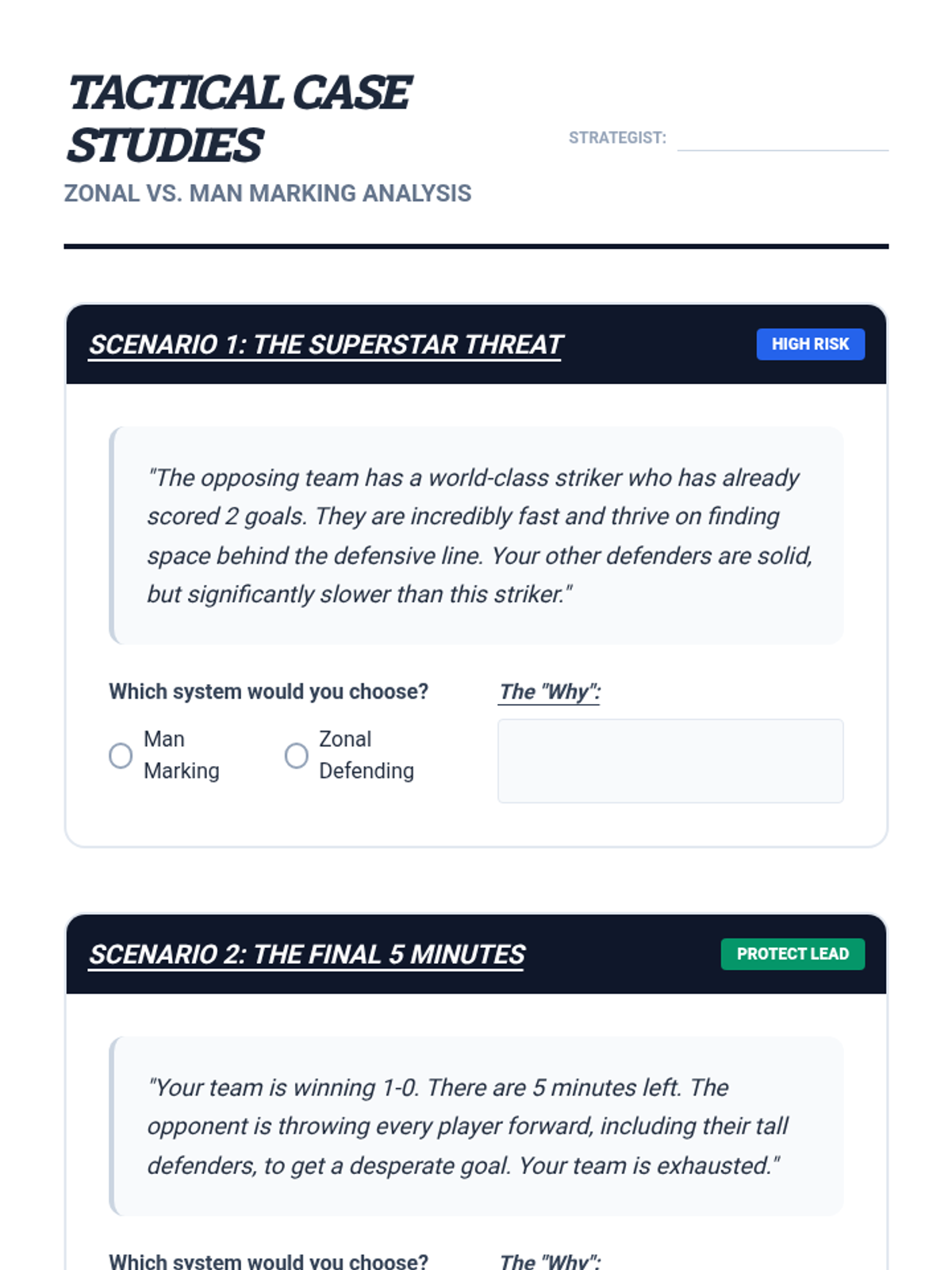 A tactical exploration comparing man-to-man marking and zonal defensive systems, helping students decide when to use each approach based on the game situation.