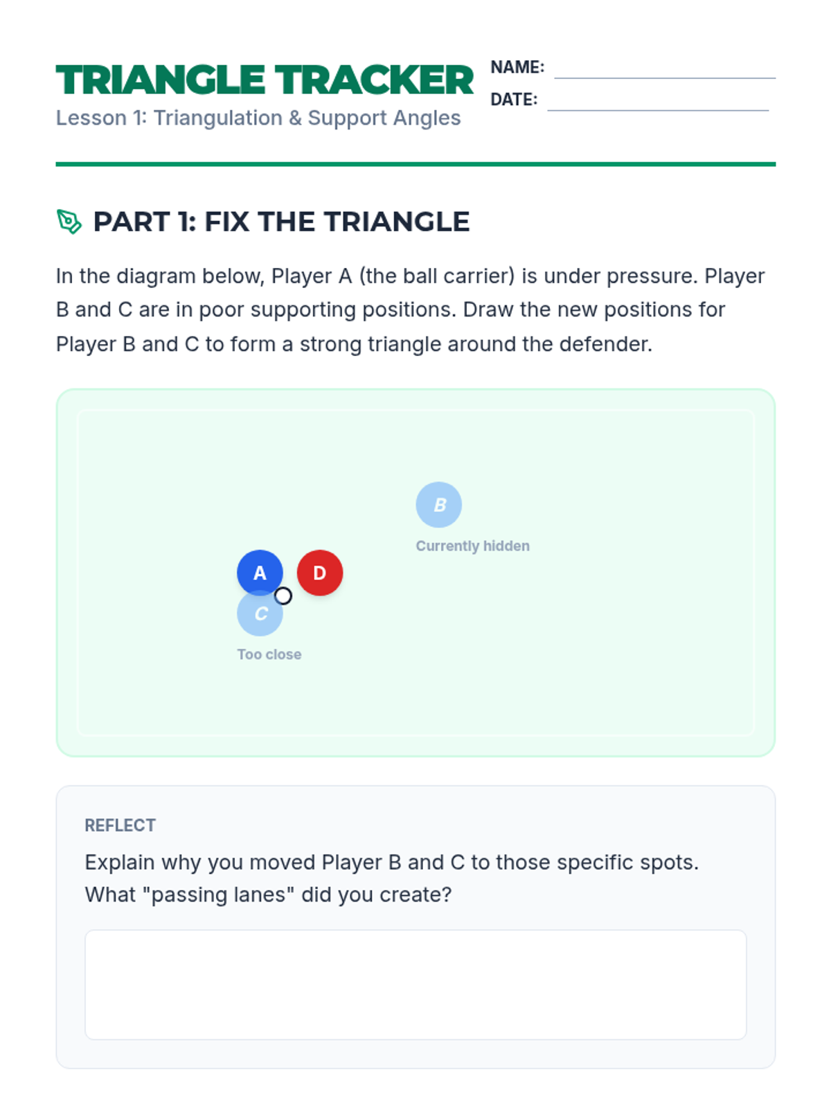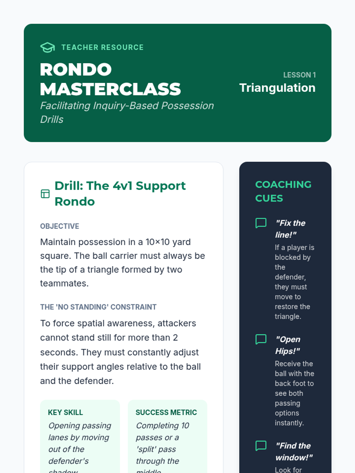 Students investigate the power of triangles in maintaining possession. Through Rondo drills, they learn to provide the ball carrier with multiple passing options by constantly adjusting support angles.