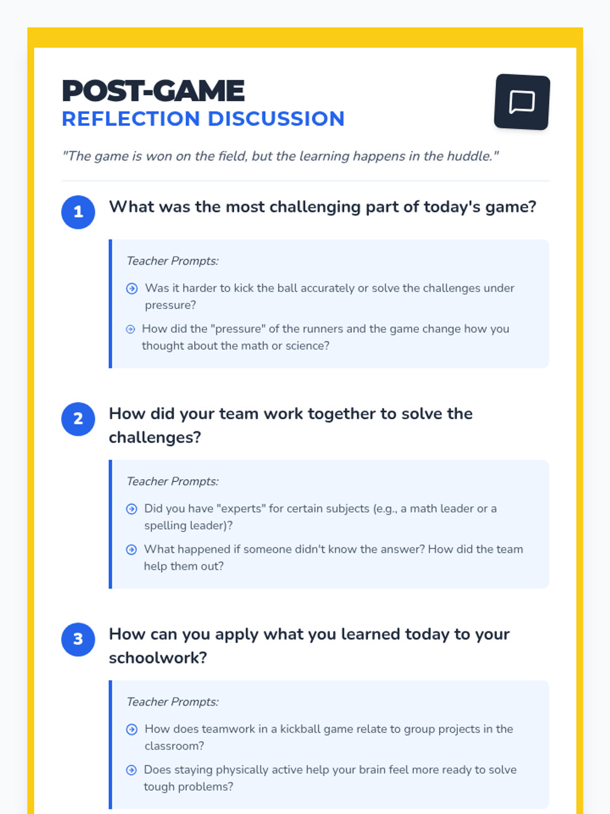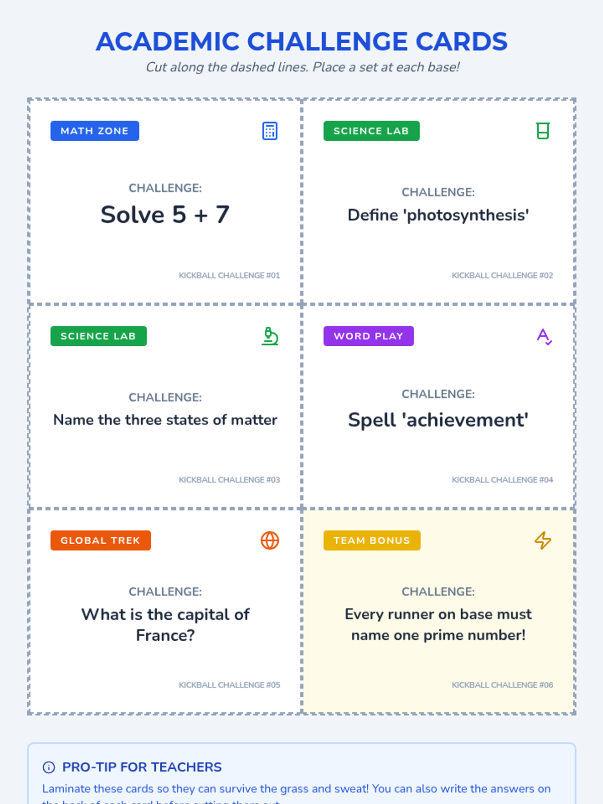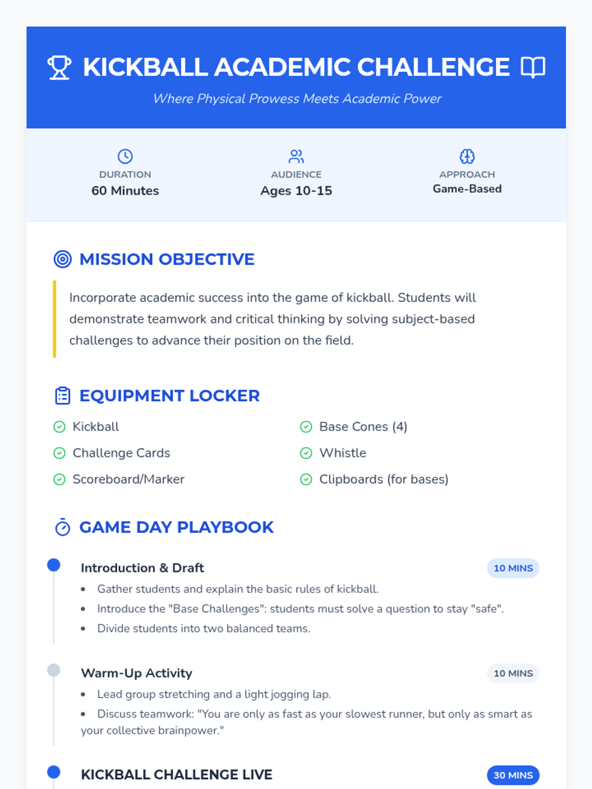 A high-energy lesson that blends physical education with academic review. Students play a game of kickball where advancing to bases requires solving math, science, and literacy challenges, promoting teamwork and holistic learning.