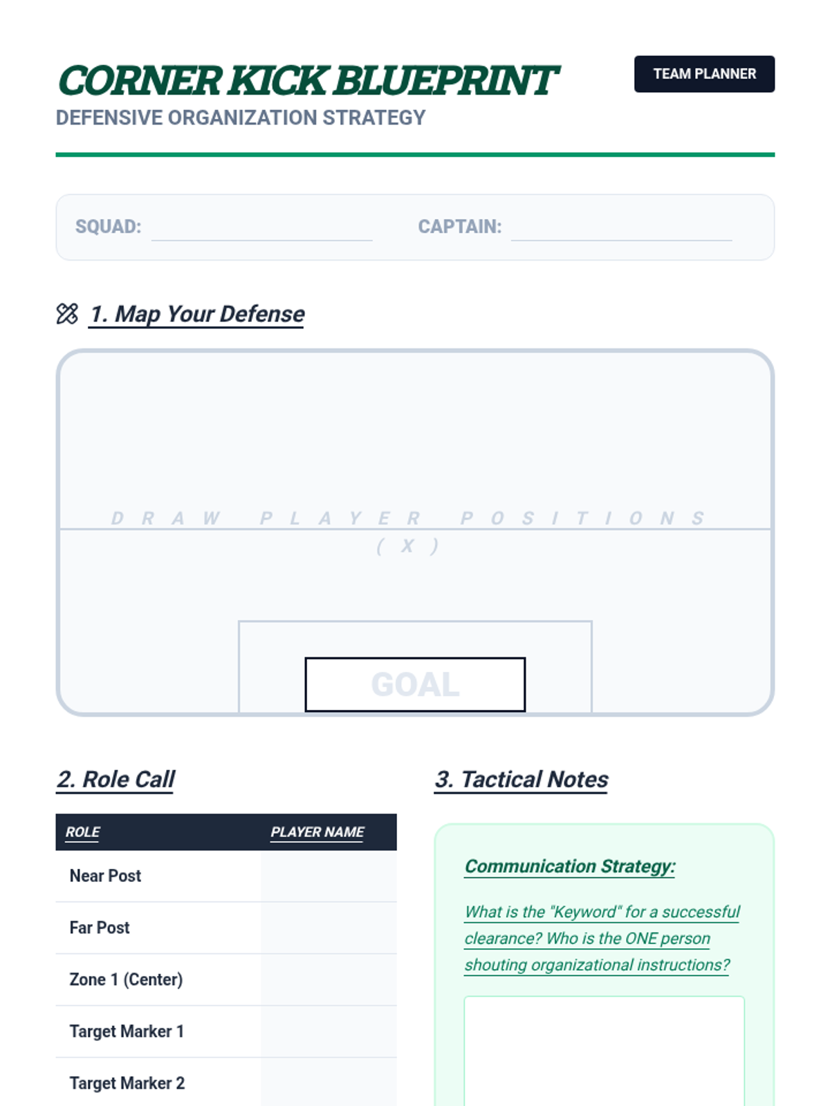 Teams spend the lesson designing and practicing two specific set plays (one corner kick, one free kick) and one defensive protocol. They document these plays to be used in the upcoming tournament.