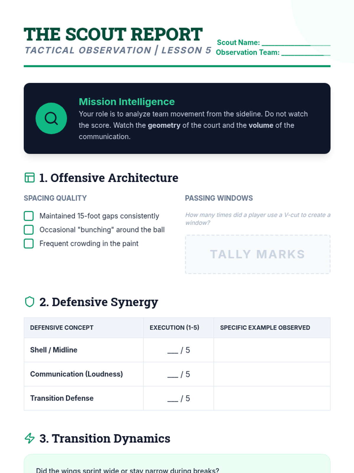 In this culminating lesson, students apply all strategic concepts in a controlled 5v5 scrimmage setting. Students take turns in player and 'coach' roles, calling out defensive assignments and offensive sets. Play is frequently paused to discuss tactical decisions and spatial breakdowns.