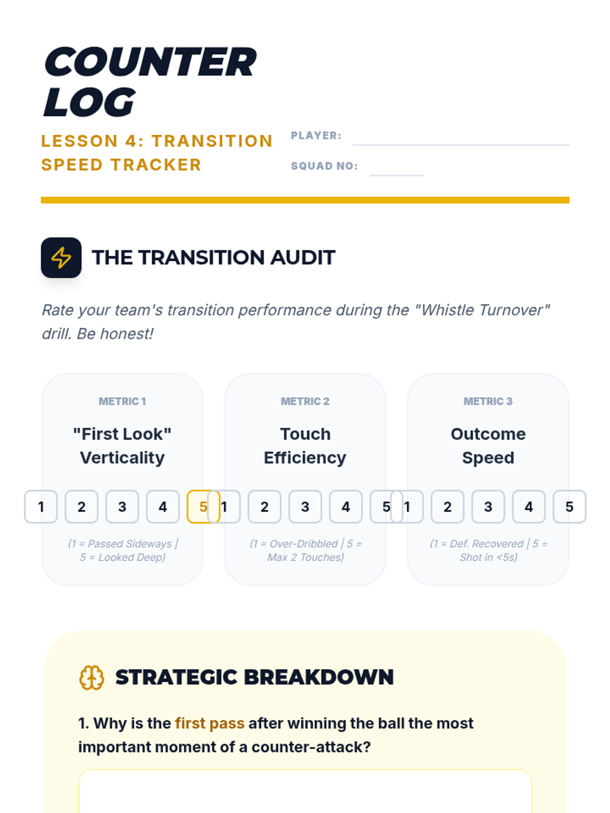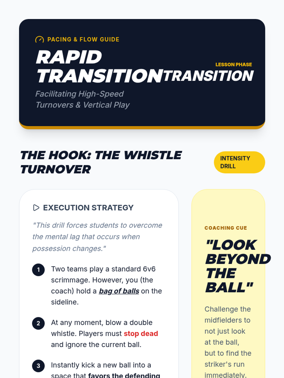 Explores the rapid transition from defense to offense. Students develop speed of thought and vertical movement to exploit disorganized opponents immediately after winning the ball.