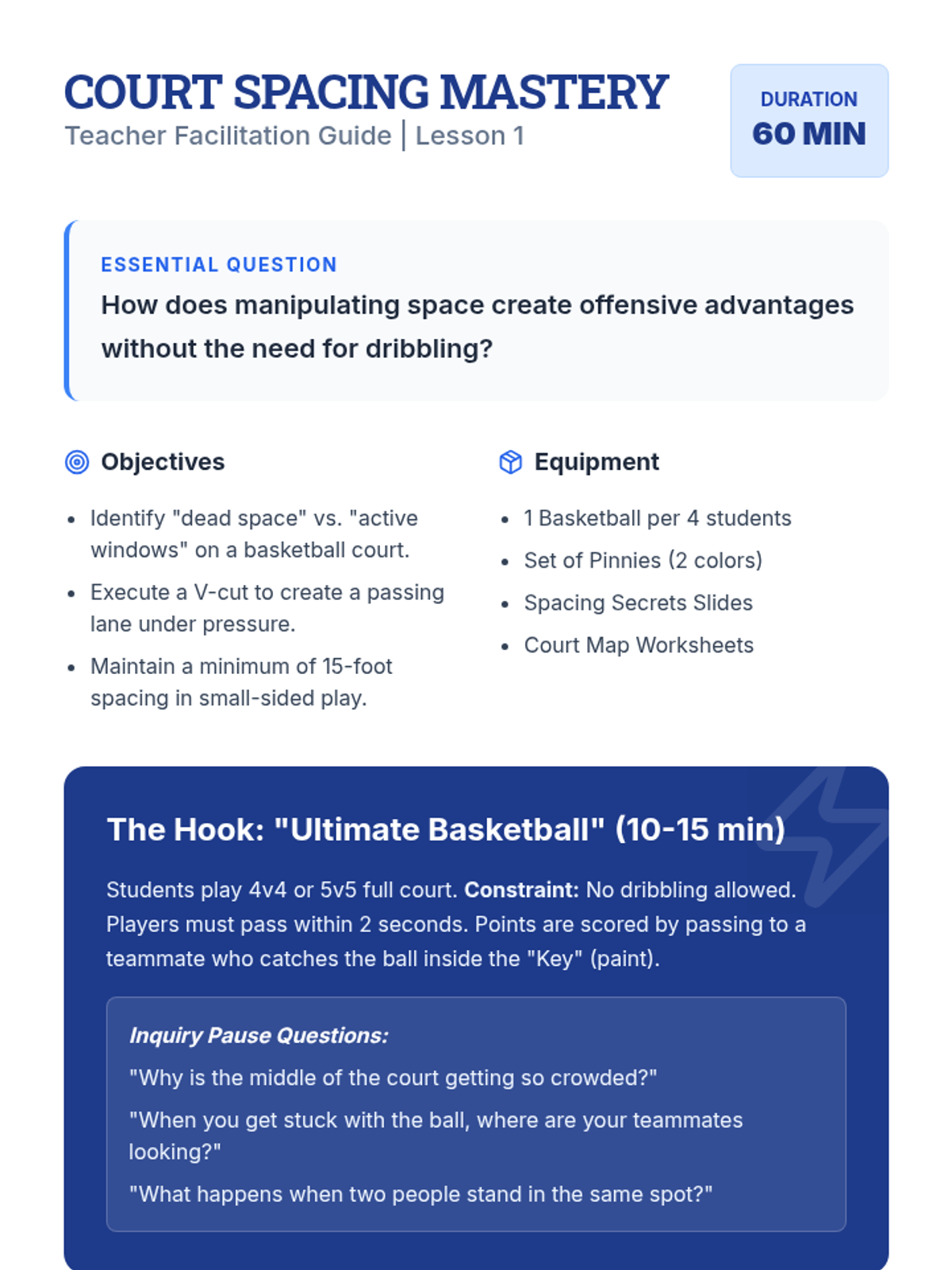 Students analyze passing lanes and the concept of 'spacing' to prevent offensive crowding. Through inquiry-based constraints, students play keep-away games that require V-cuts and finding open passing windows. The lesson emphasizes moving without the ball to support the ball-handler.