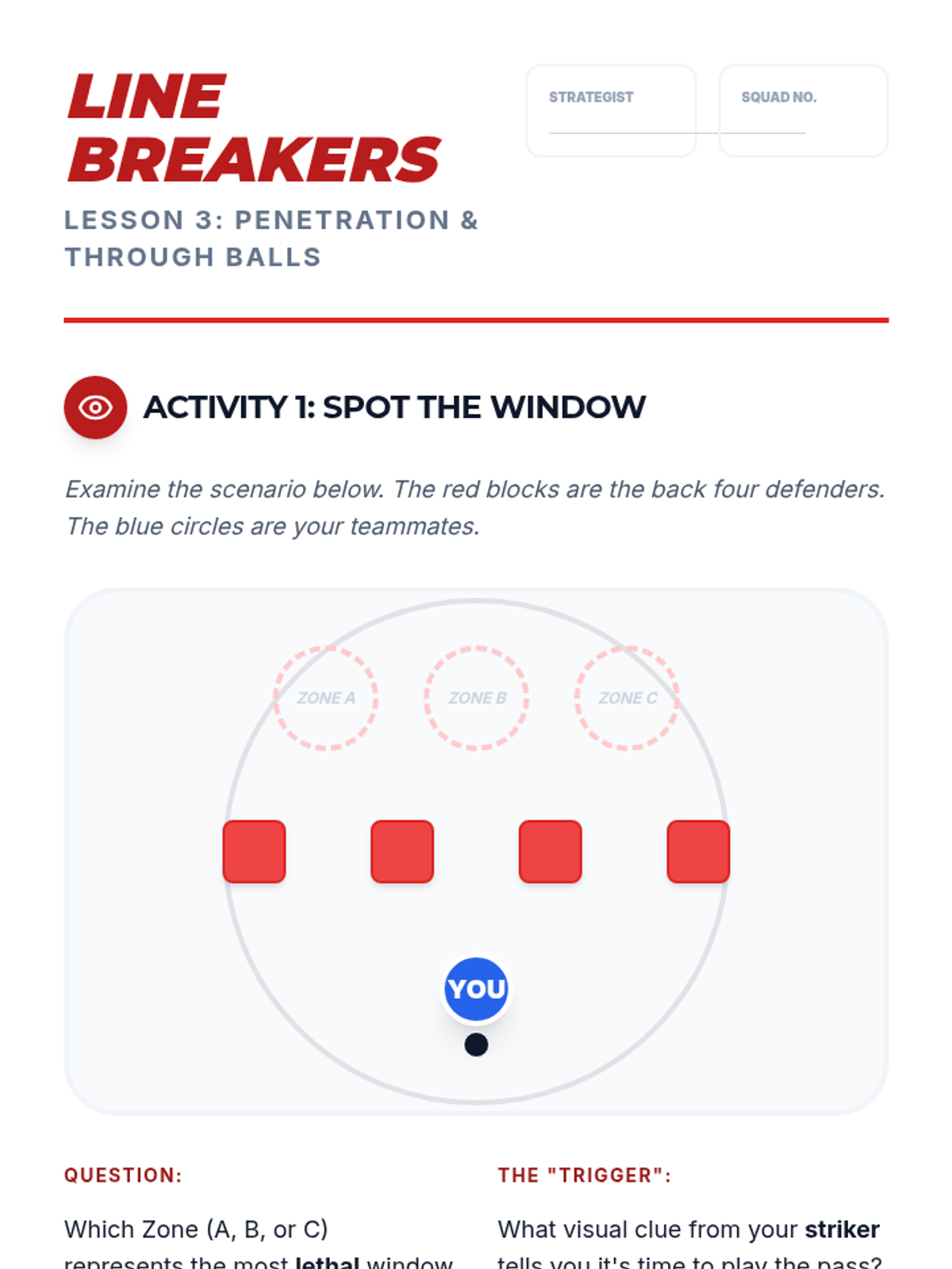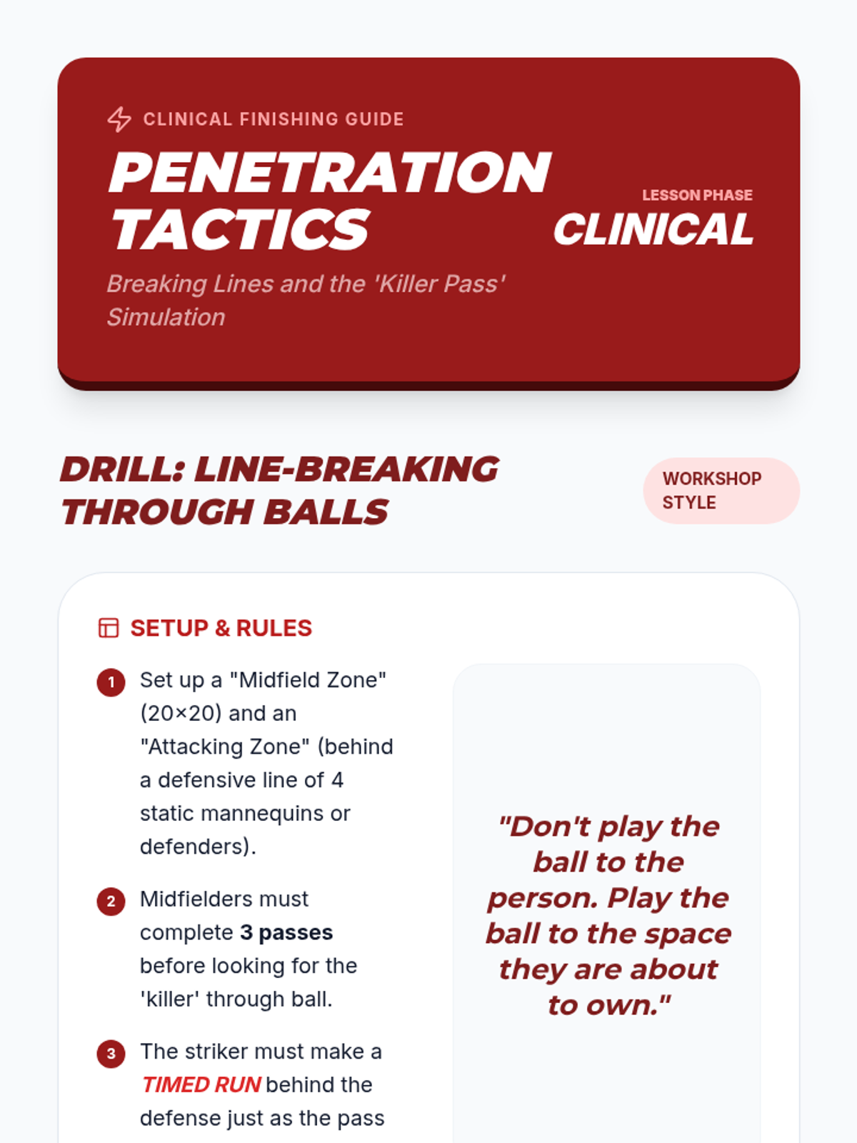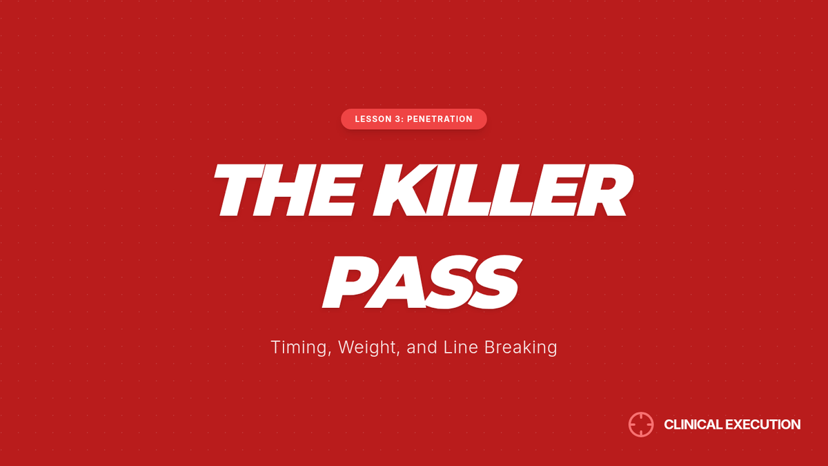 Teaches the timing and execution of the 'killer pass.' Students learn to identify when to maintain possession and when to strike with a penetrating ball behind the defense.