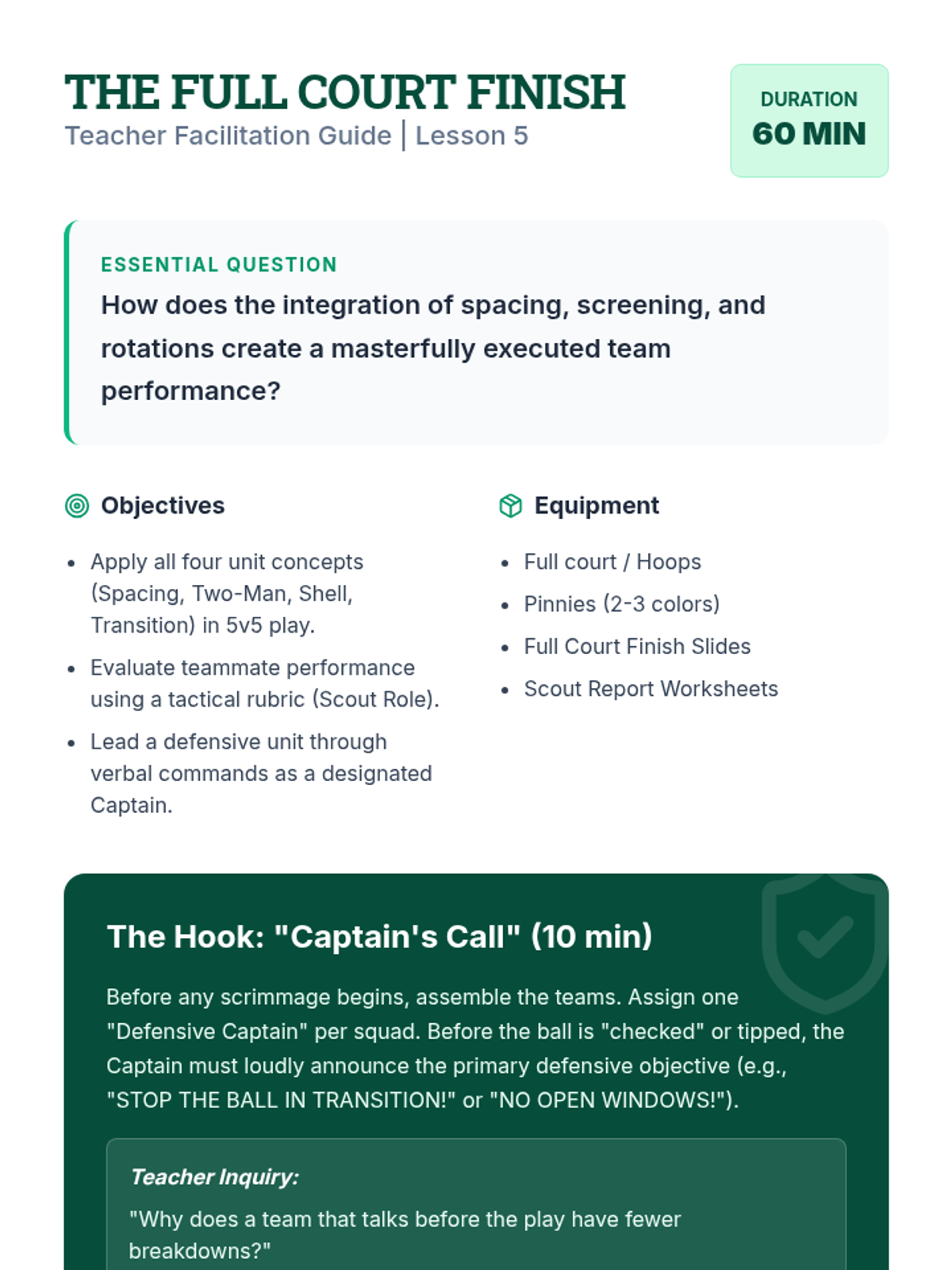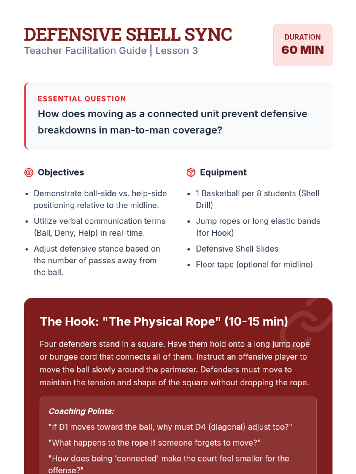 Students learn the principles of man-to-man defense using the 'Shell Drill' to understand ball-side vs. help-side positioning. The lesson focuses on defensive communication terms (ball, deny, help) and rotation logic. Students practice shifting as a unit as the ball moves around the perimeter.