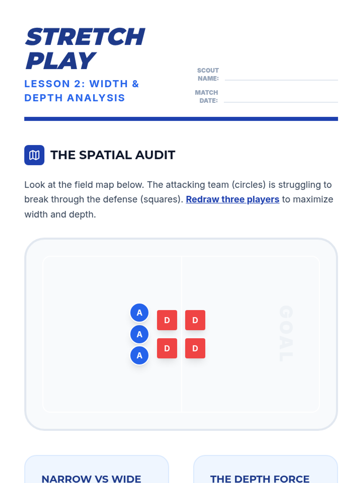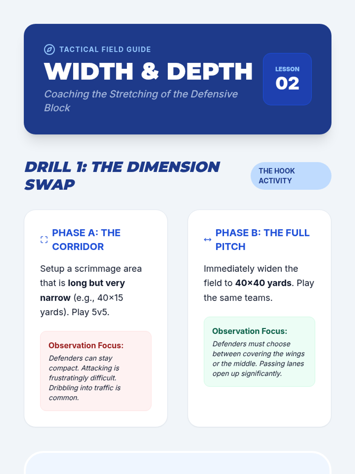 Focuses on using the full dimensions of the pitch to stretch defenses. Students explore how width and depth create gaps in defensive structures for easier penetration.