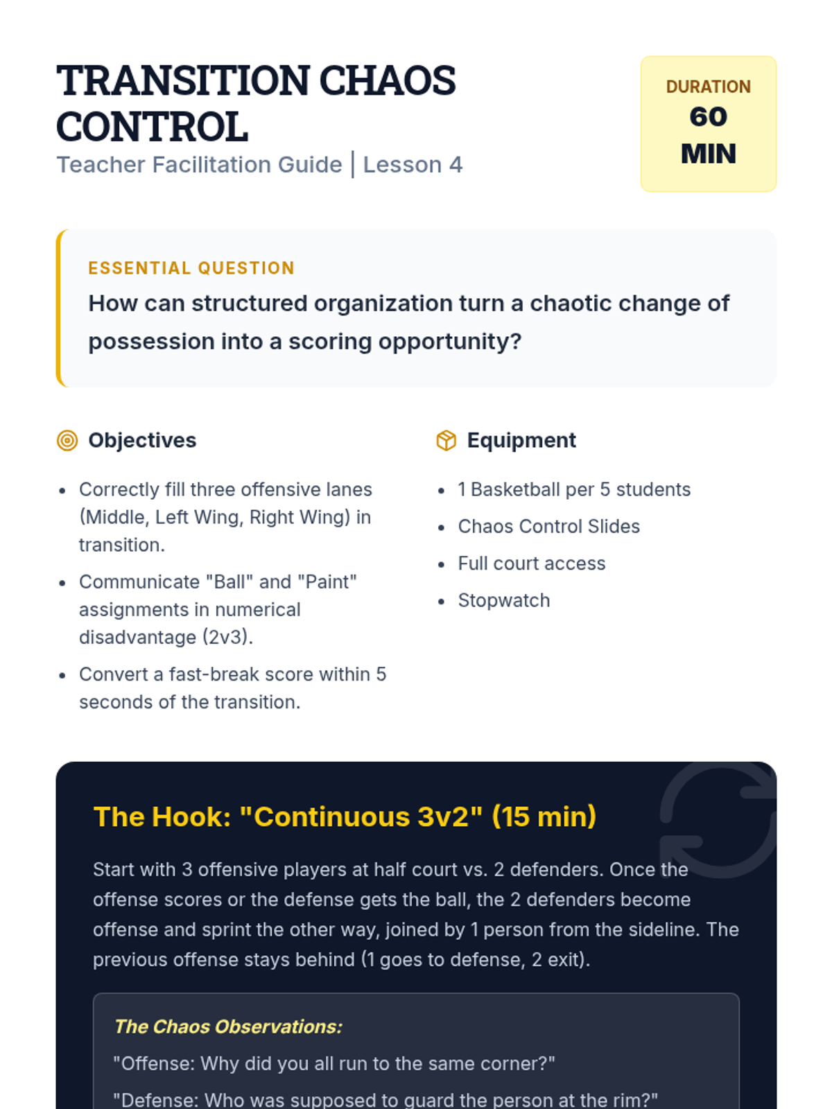 Students simulate the chaotic change of possession in basketball, learning how to organize quickly during fast breaks. The lesson covers lane filling, stopping the ball, and converting numerical advantages (3v2, 2v1). High-energy drills focus on quick decision-making in open court.