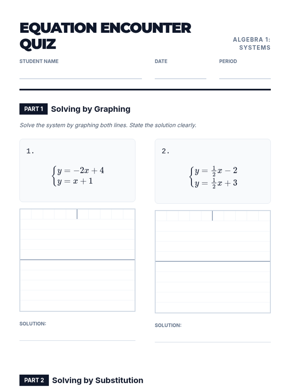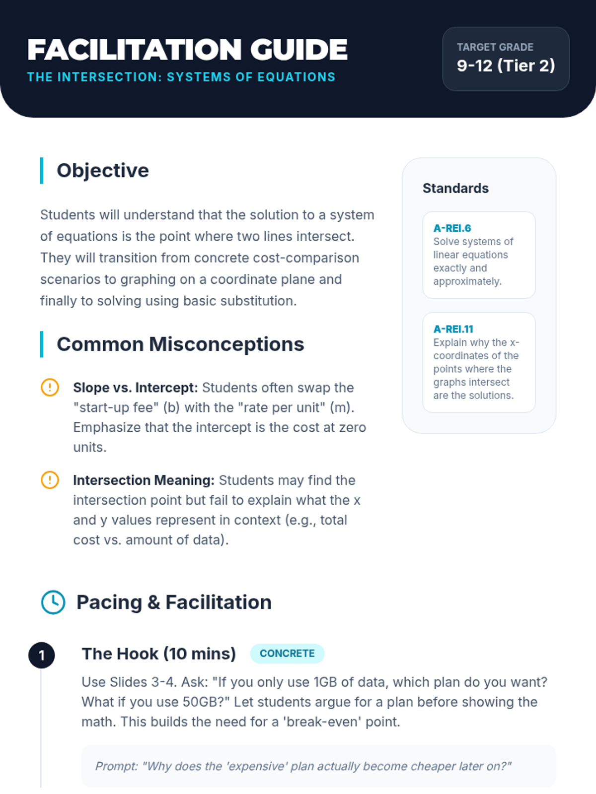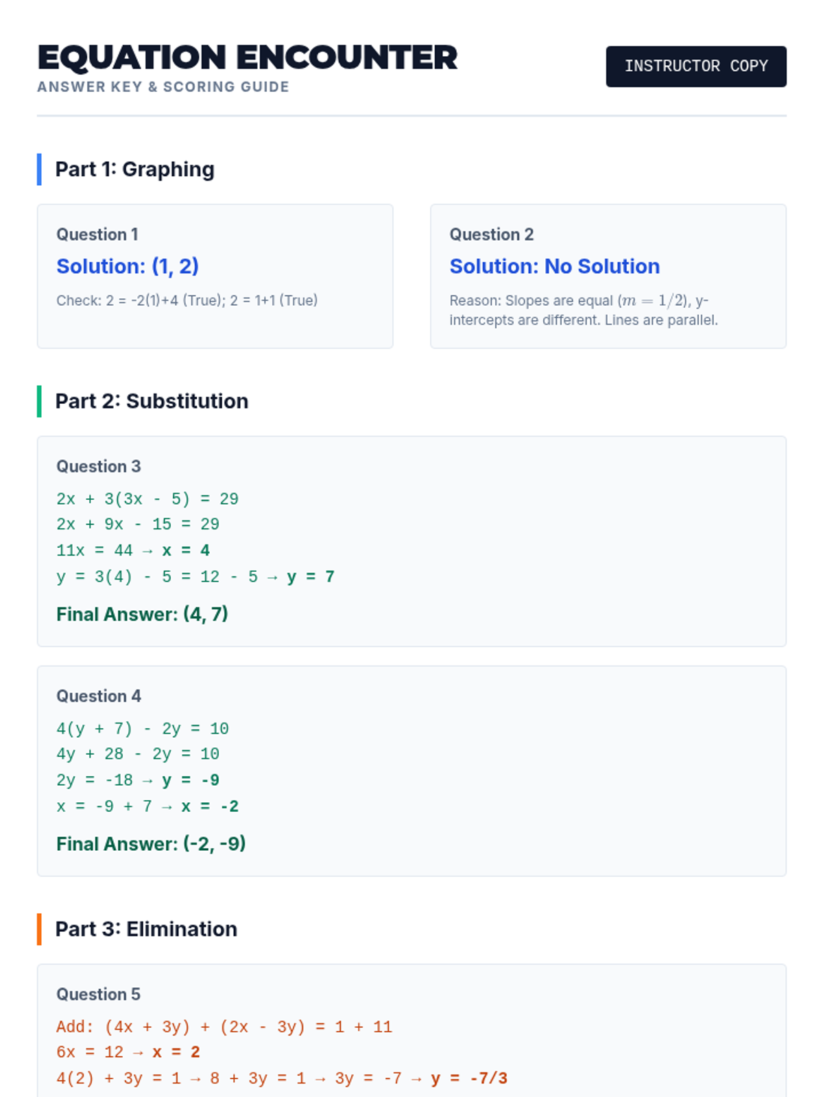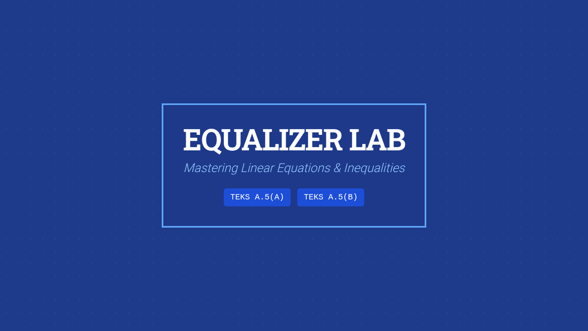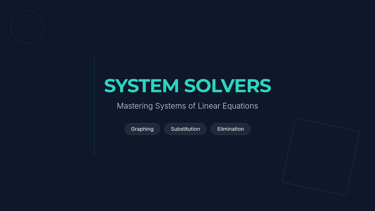 Linear Equations and SystemsSolving single-variable linear equations and systems through graphing, substitution, and elimination. Targets algebraic manipulation and real-world modeling of simultaneous relationships.