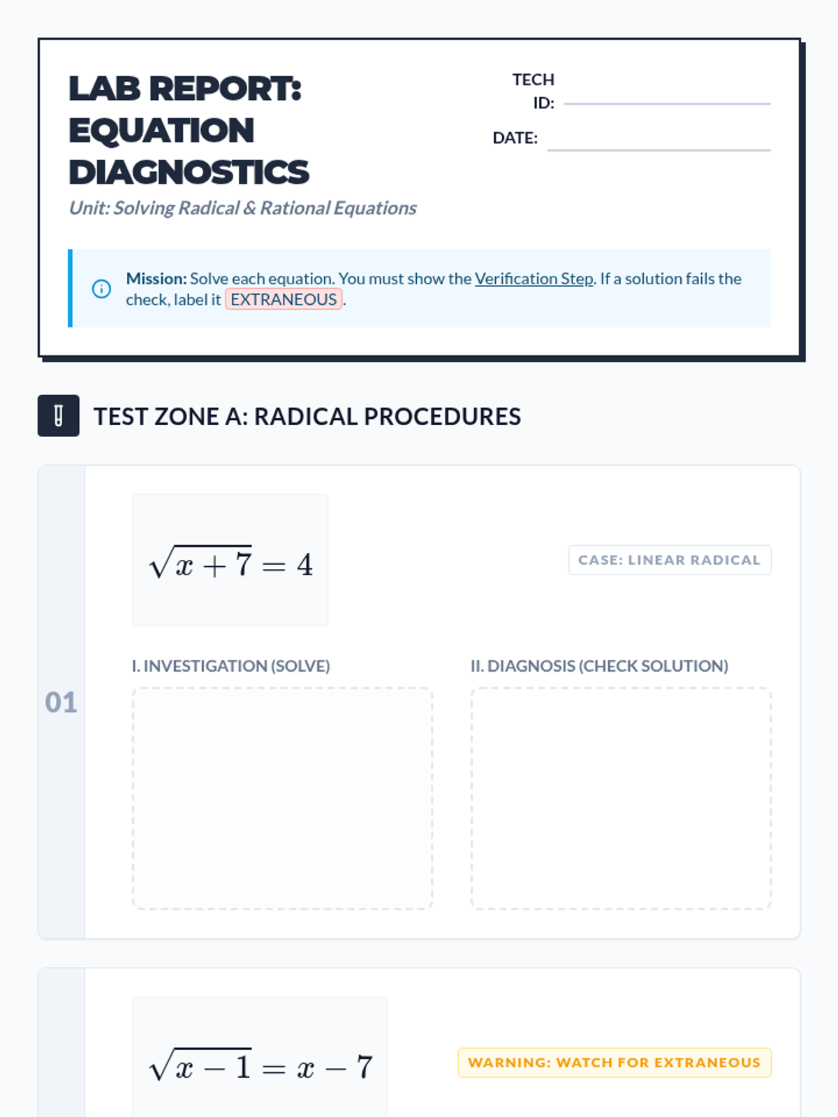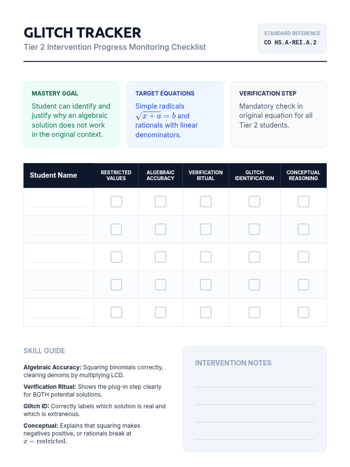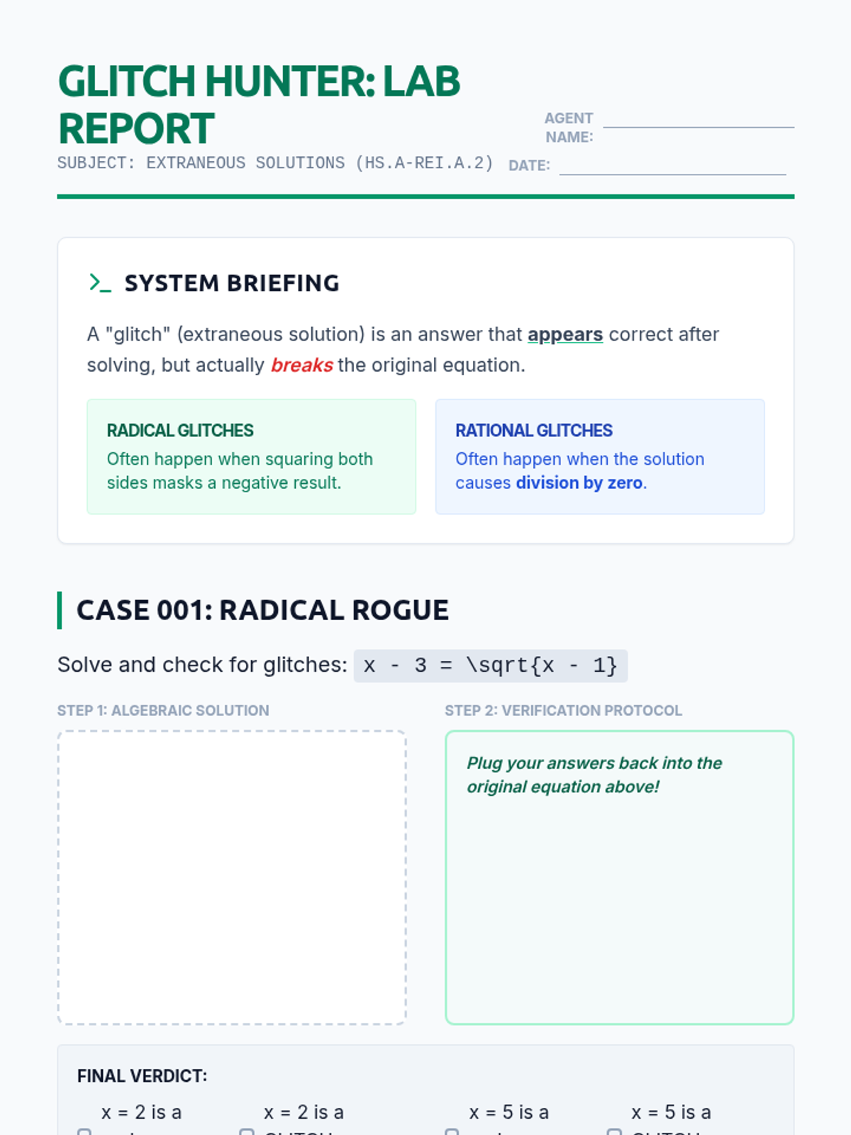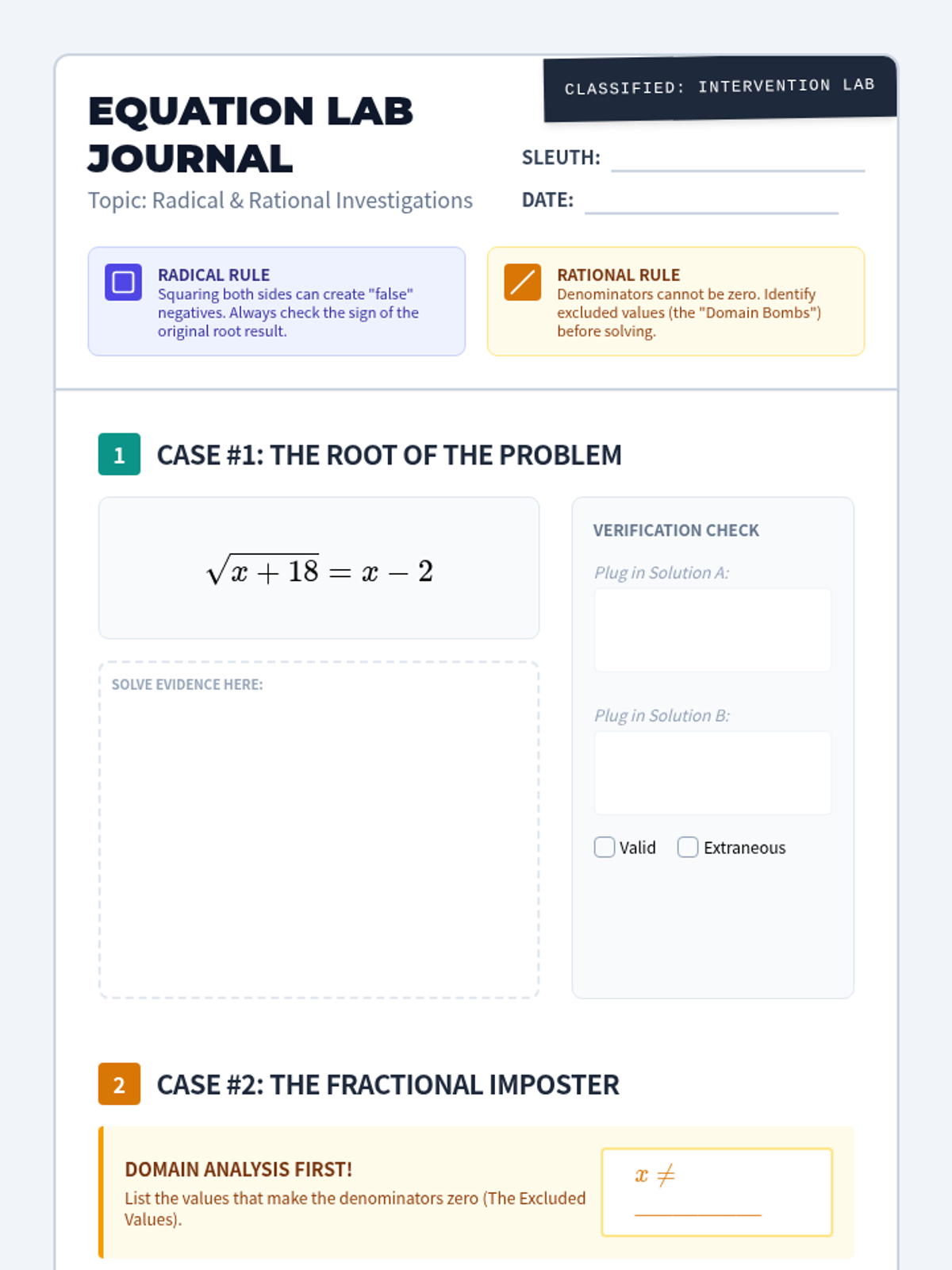 A Tier 2 intervention lesson focusing on identifying and eliminating extraneous solutions in radical and rational equations through domain analysis and verification protocols.