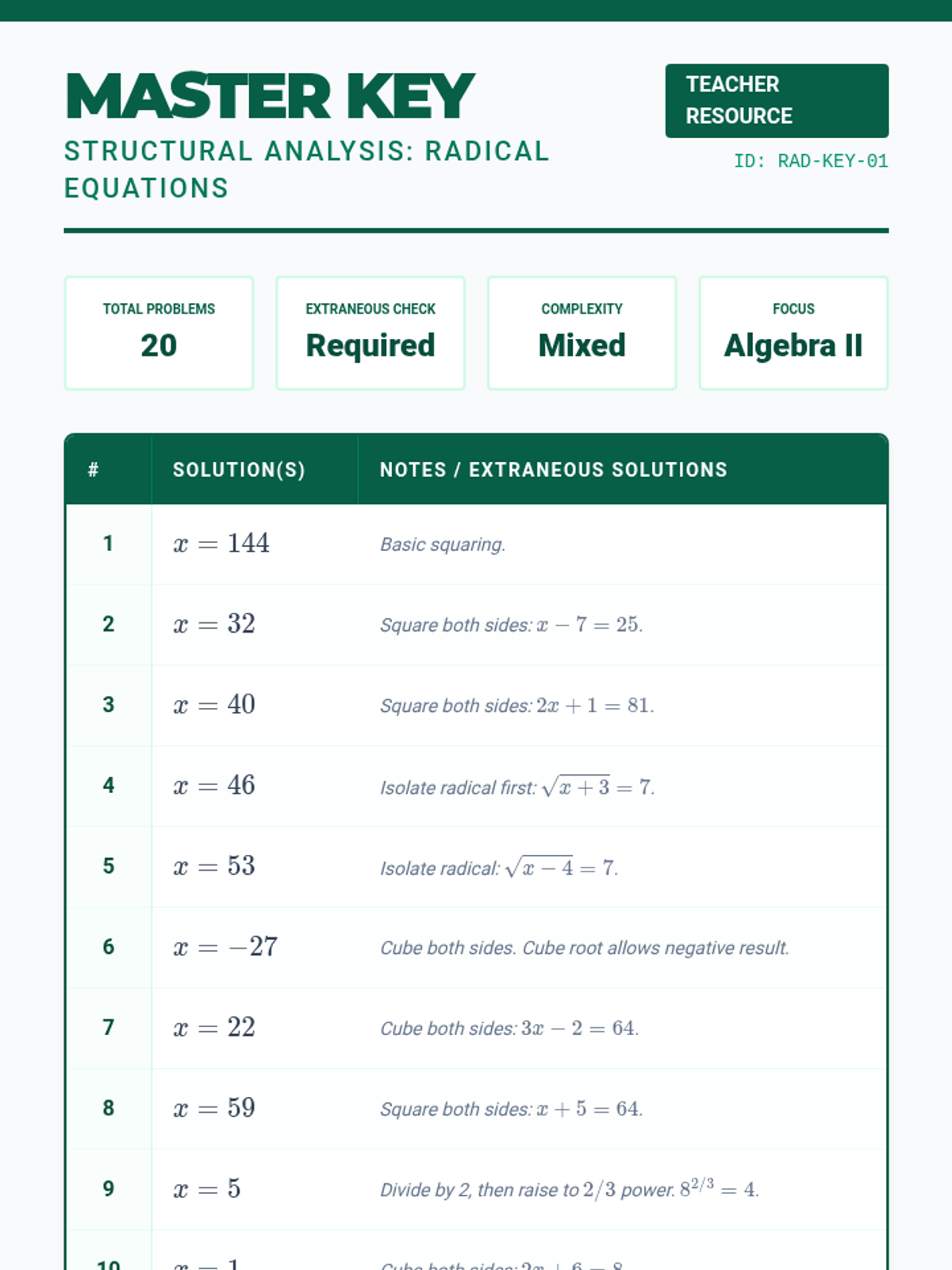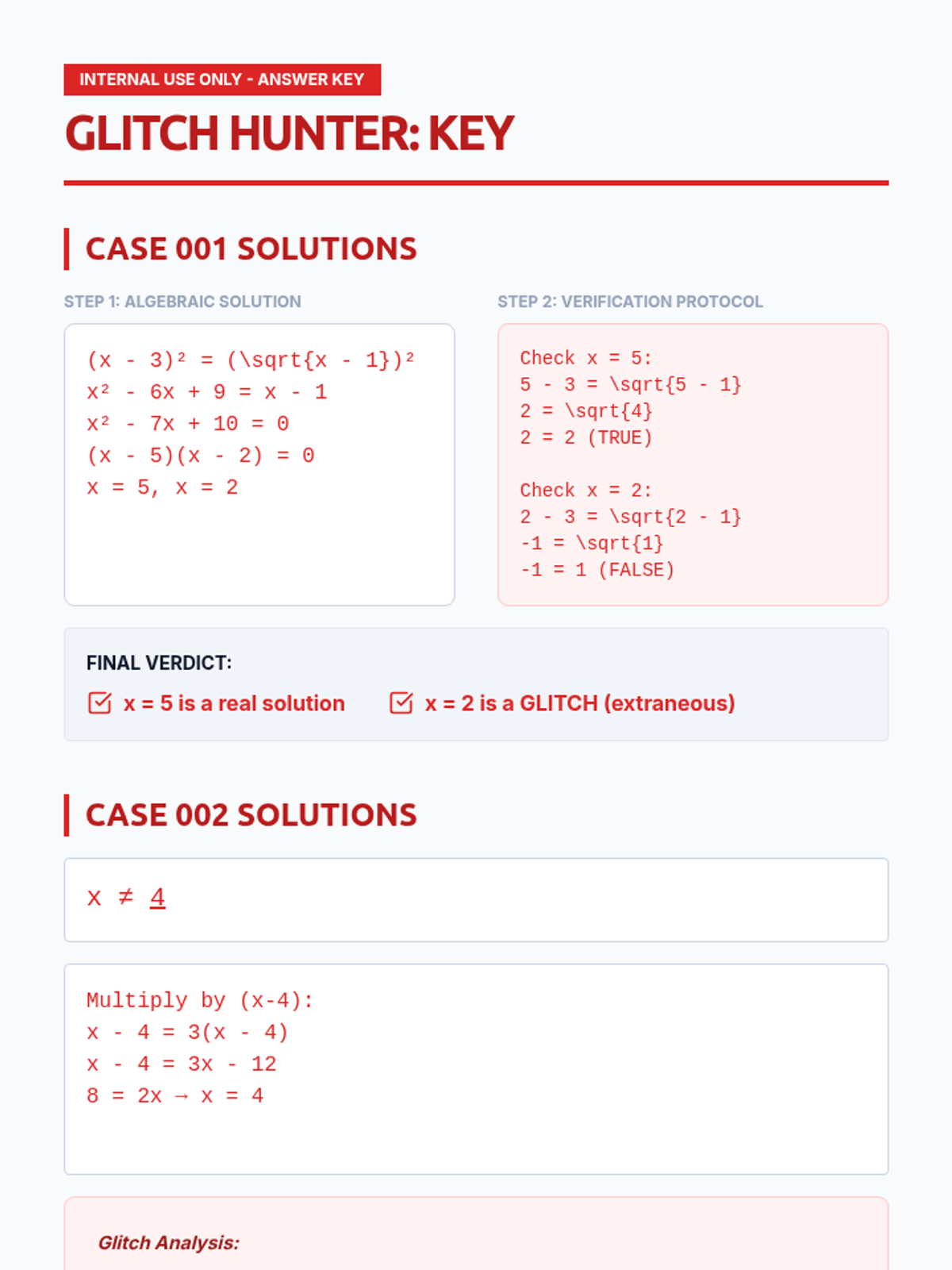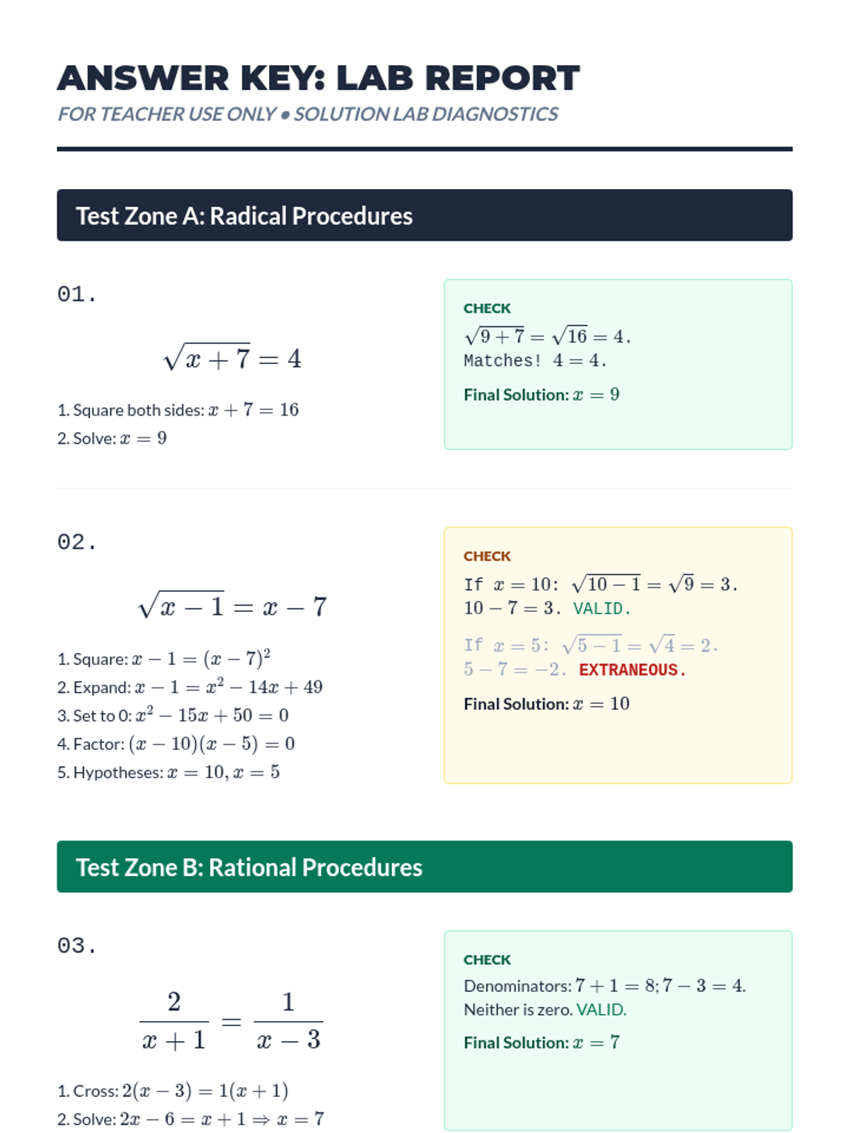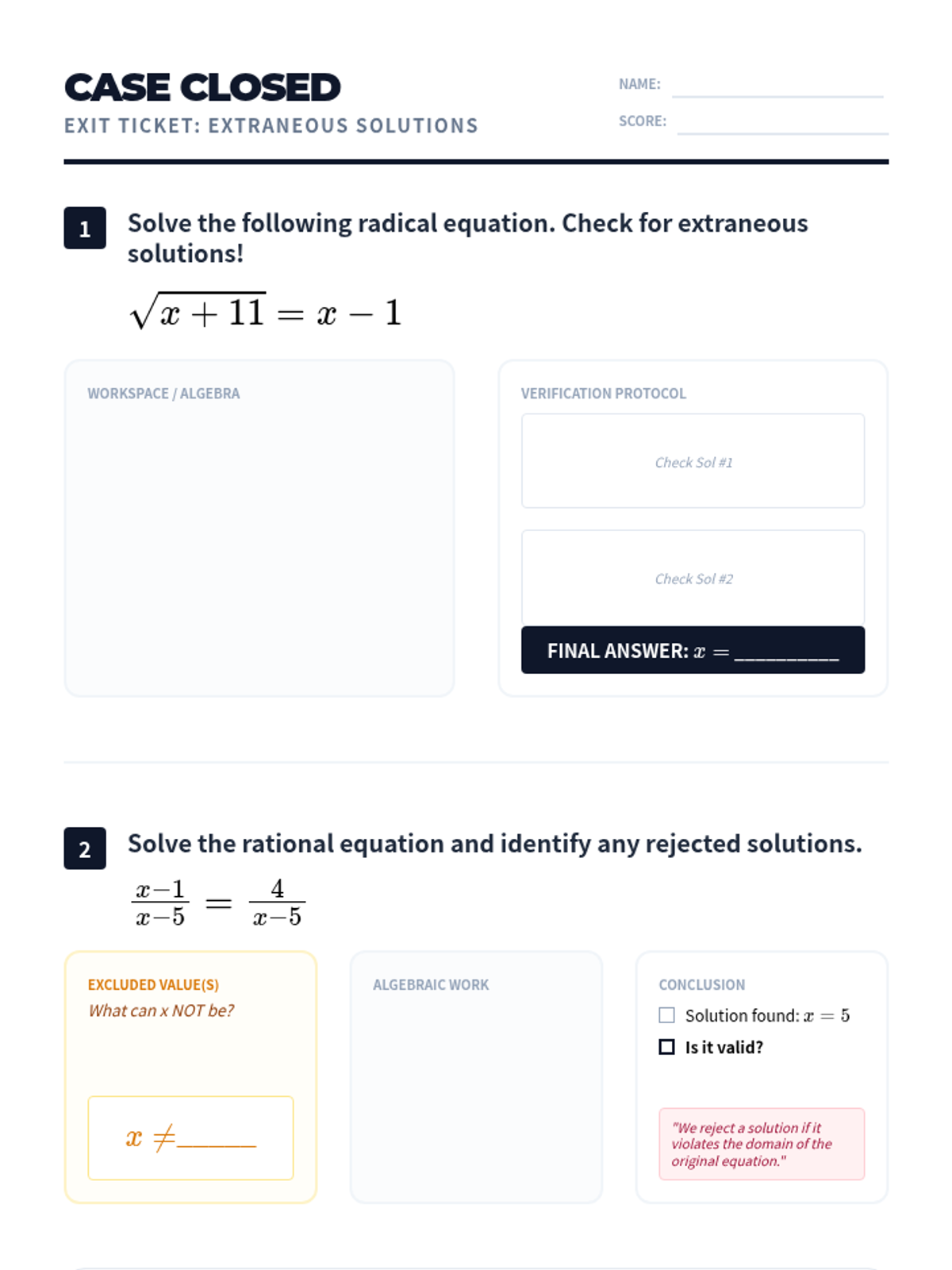 A Tier 2 intervention lesson focusing on identifying and eliminating extraneous solutions in radical and rational equations through domain analysis and verification protocols.