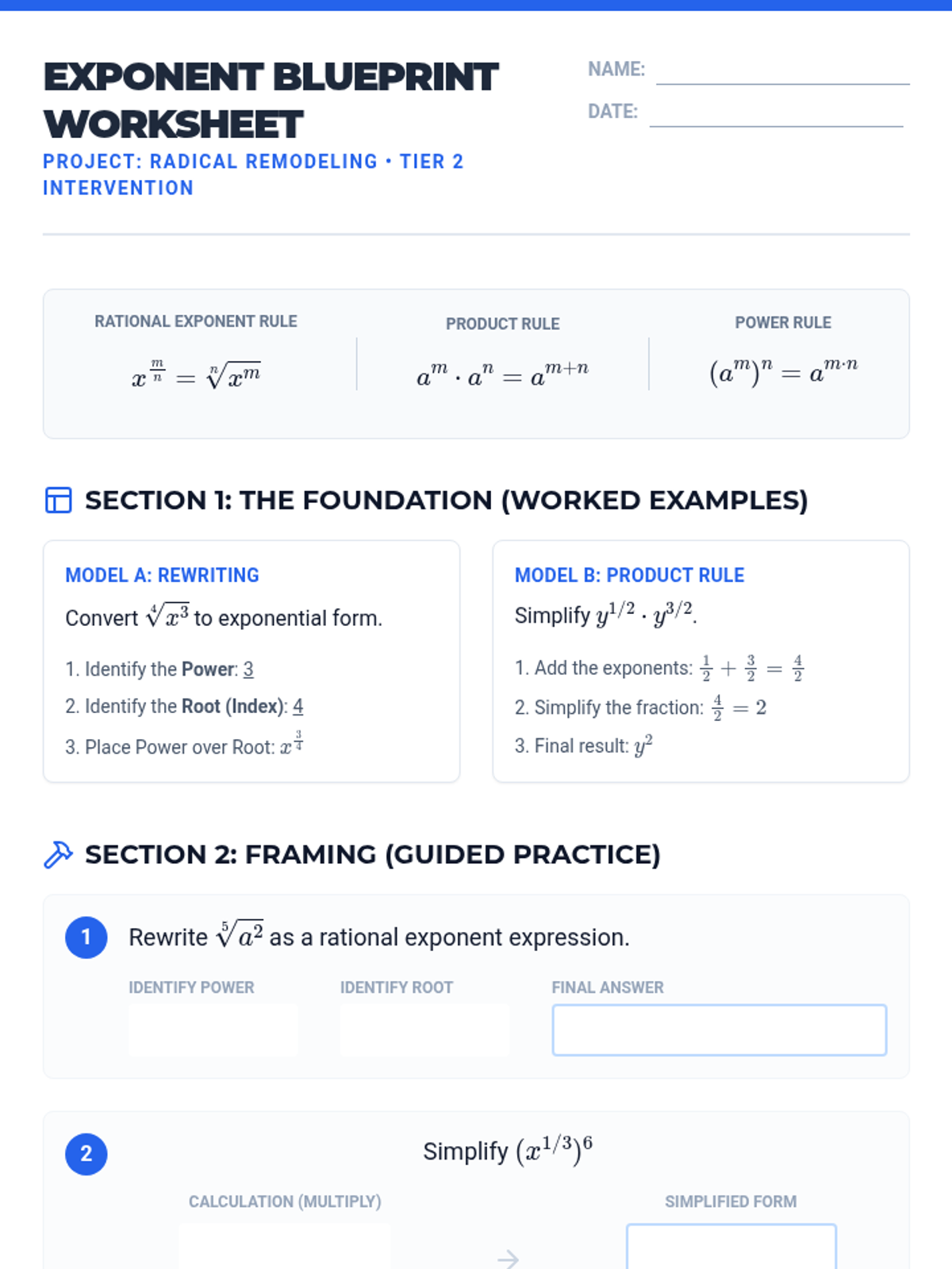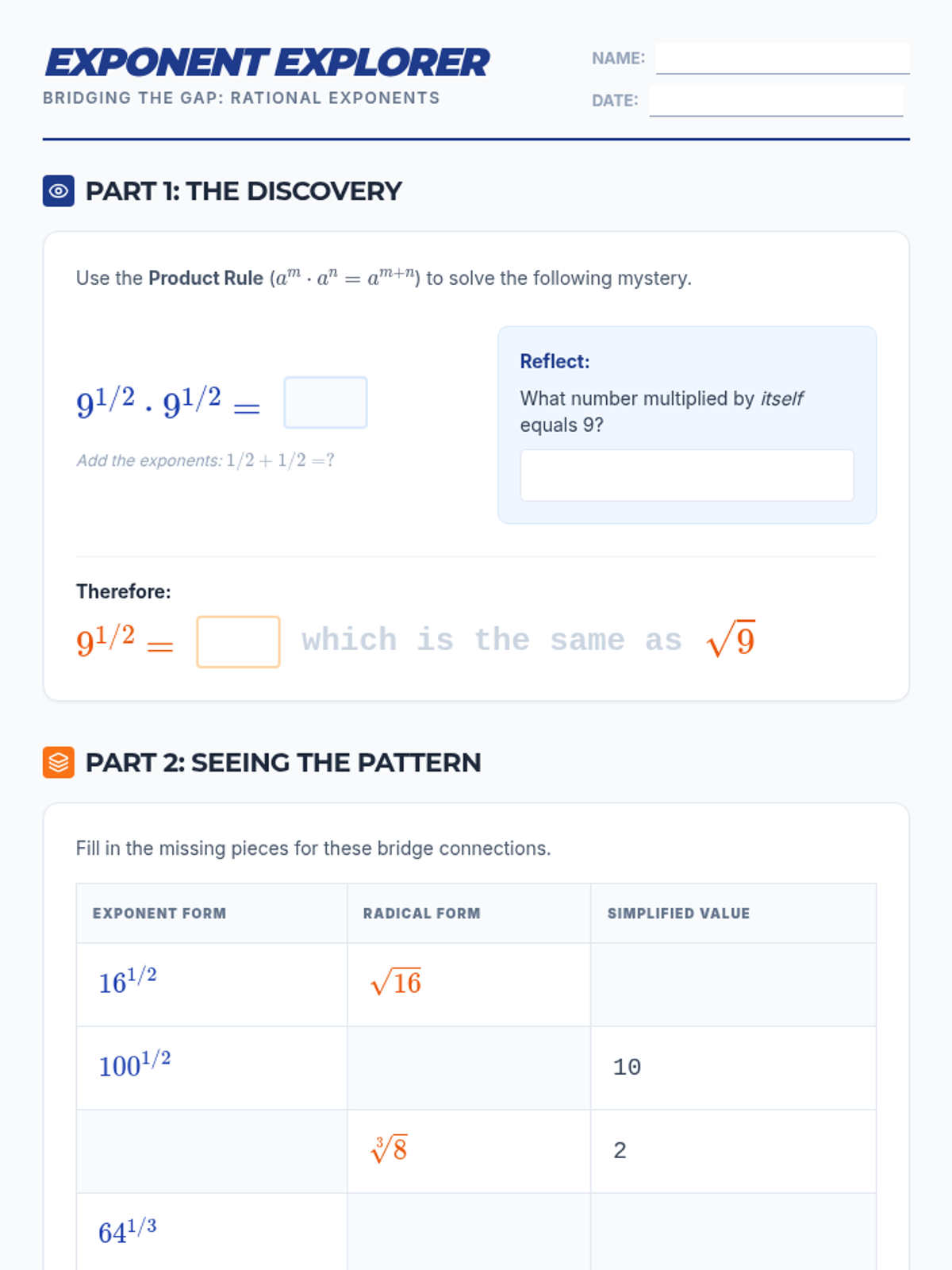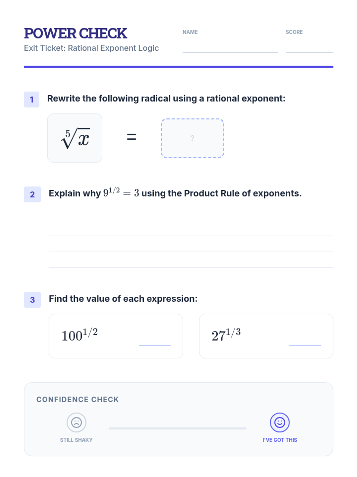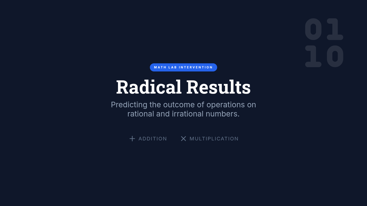 Radicals and Integer ExponentsProduct, quotient, and power rules for integer exponents alongside methods for simplifying square and cube roots. Connects radical notation to exponential form while practicing operations with irrational numbers.