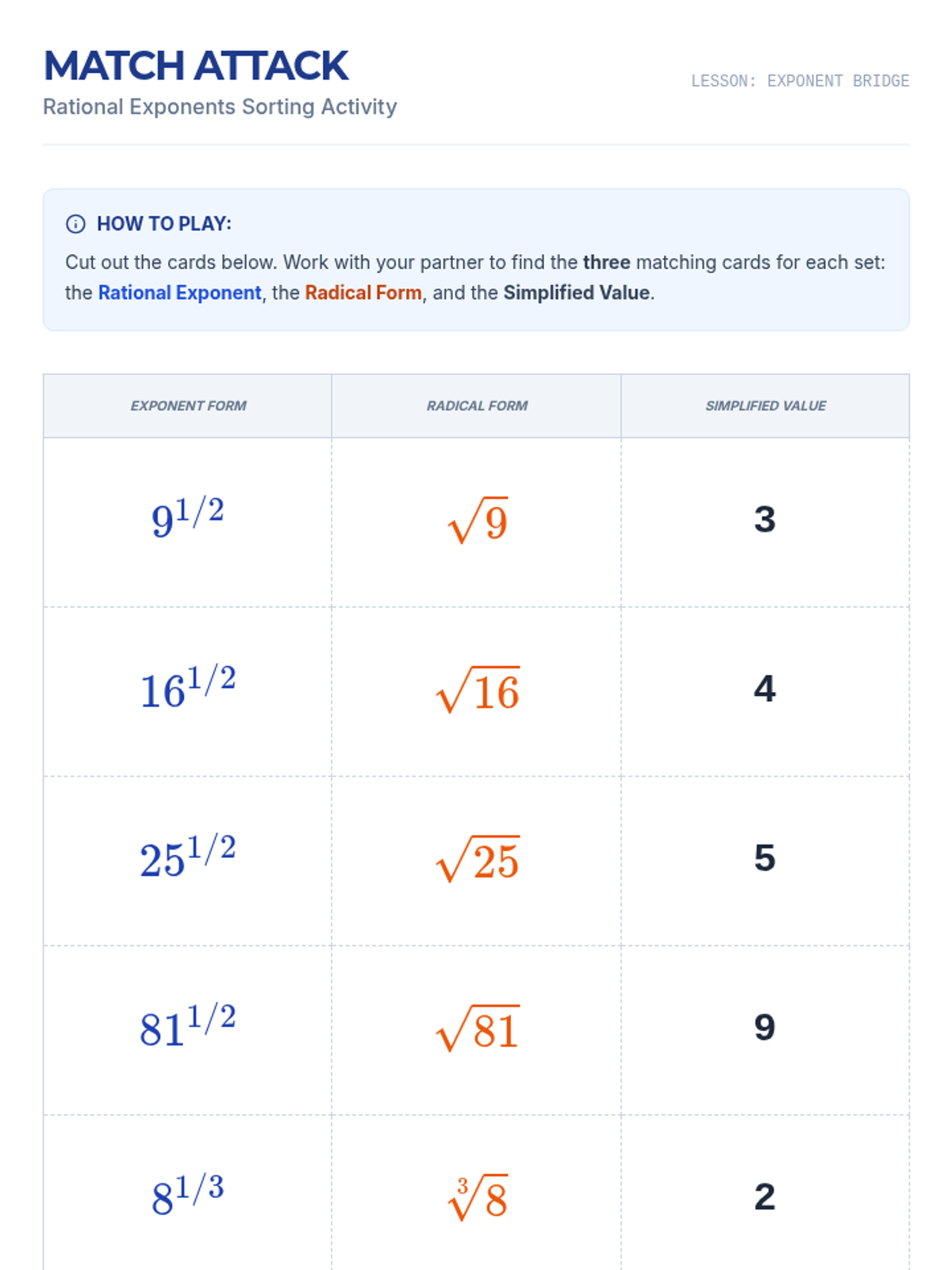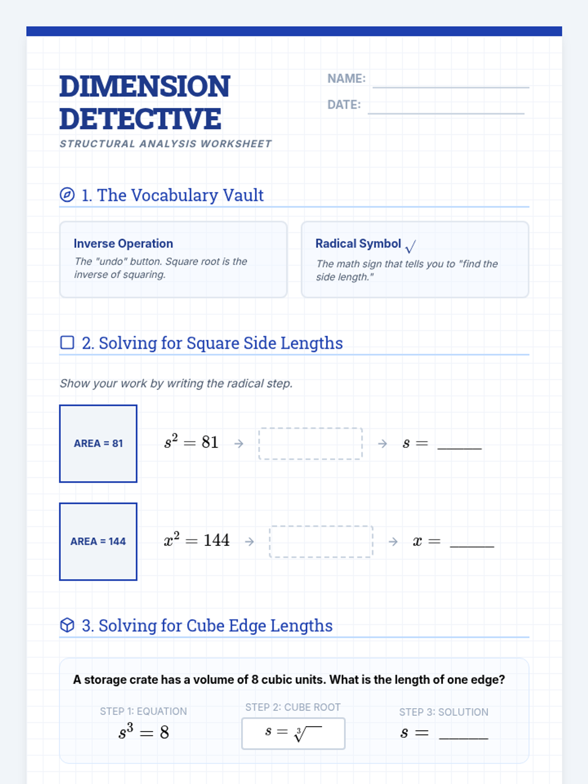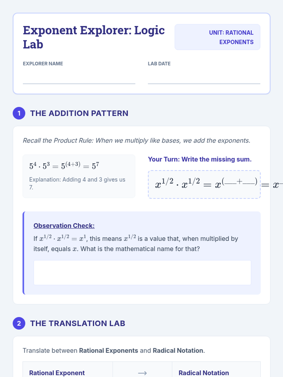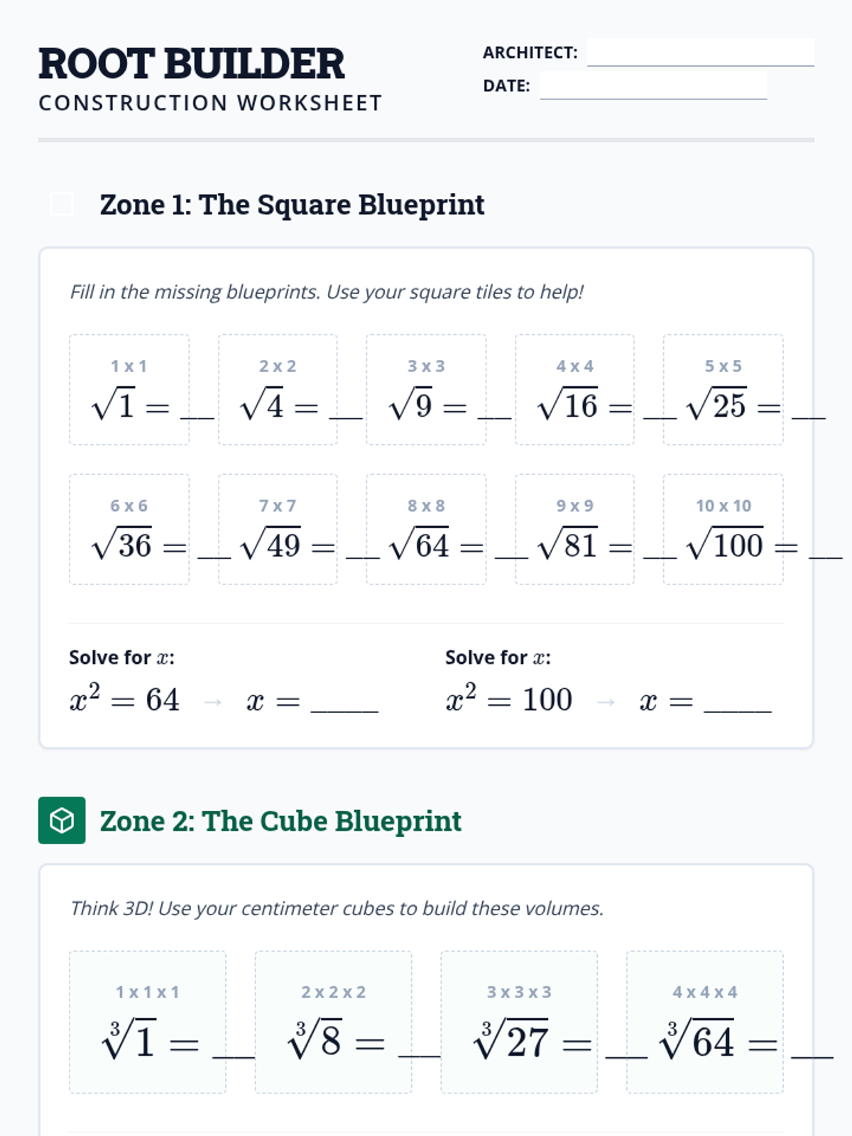 Radicals and Integer ExponentsProduct, quotient, and power rules for integer exponents alongside methods for simplifying square and cube roots. Connects radical notation to exponential form while practicing operations with irrational numbers.