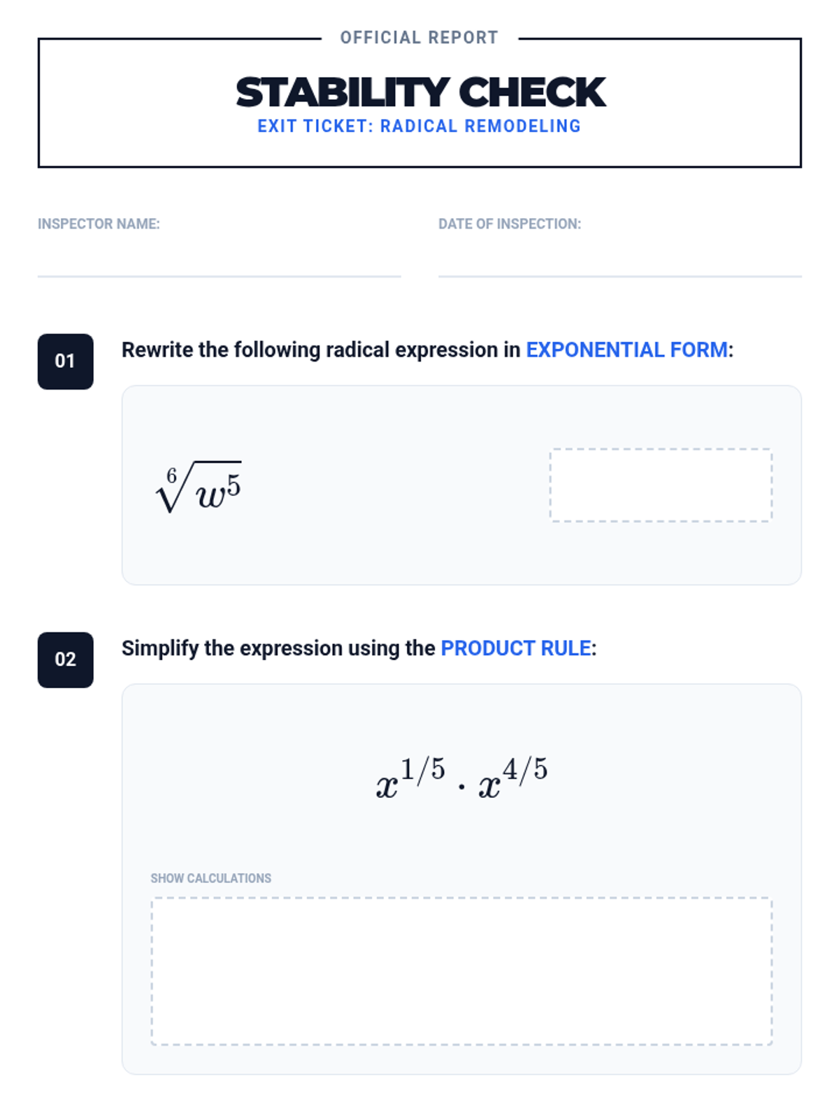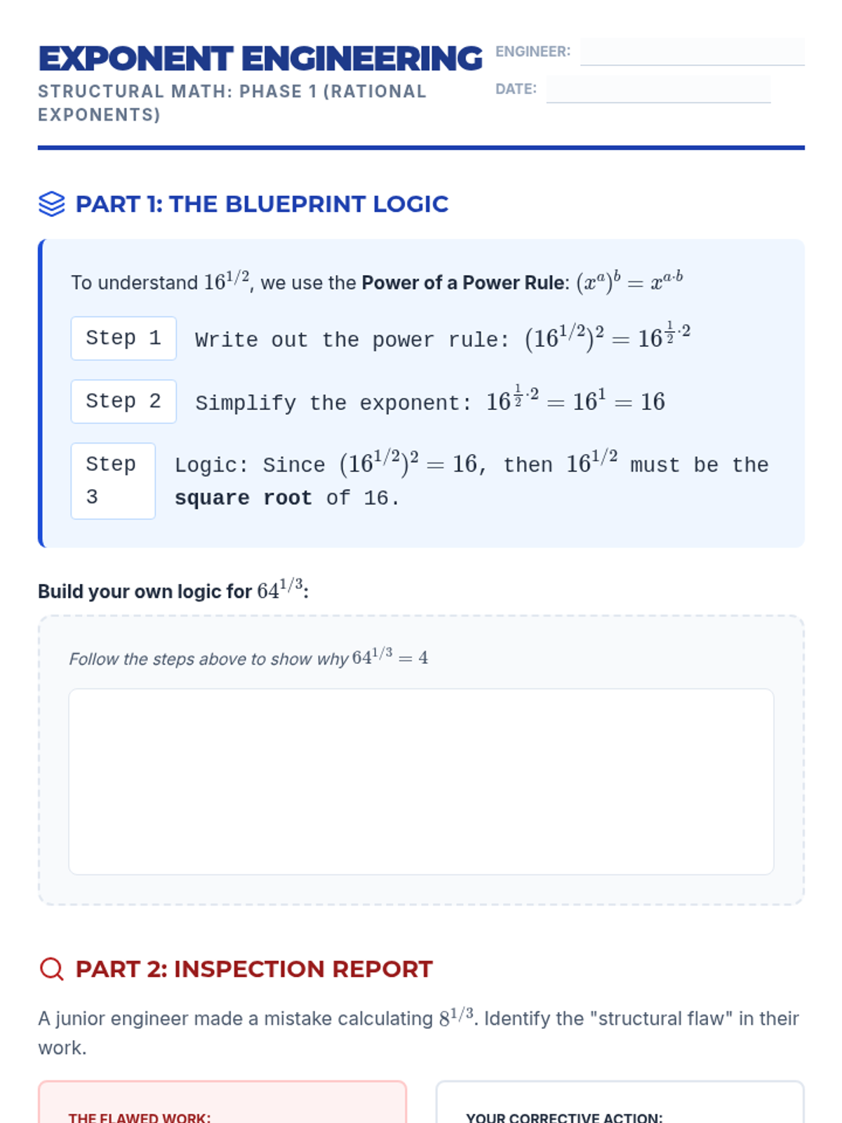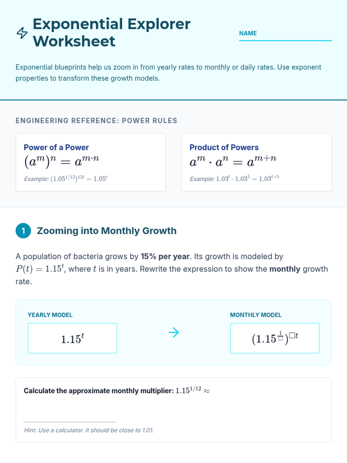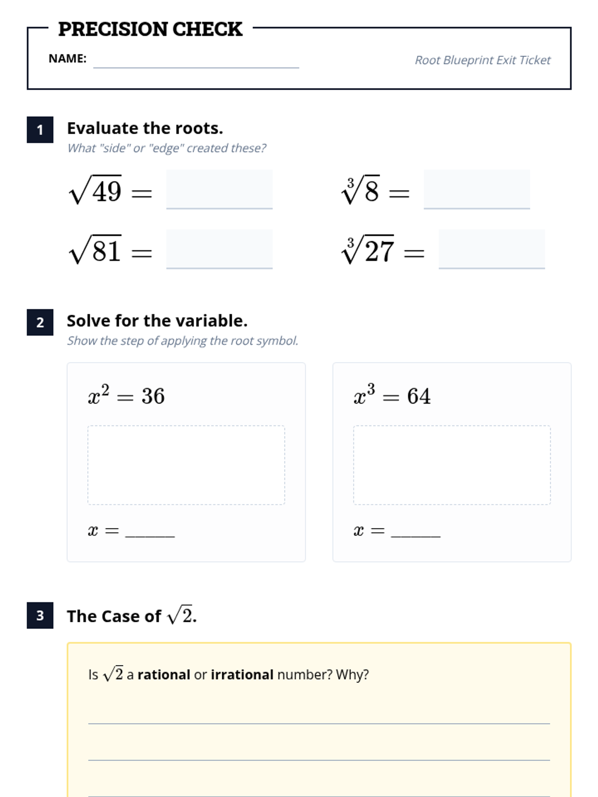 Radicals and Integer ExponentsProduct, quotient, and power rules for integer exponents alongside methods for simplifying square and cube roots. Connects radical notation to exponential form while practicing operations with irrational numbers.