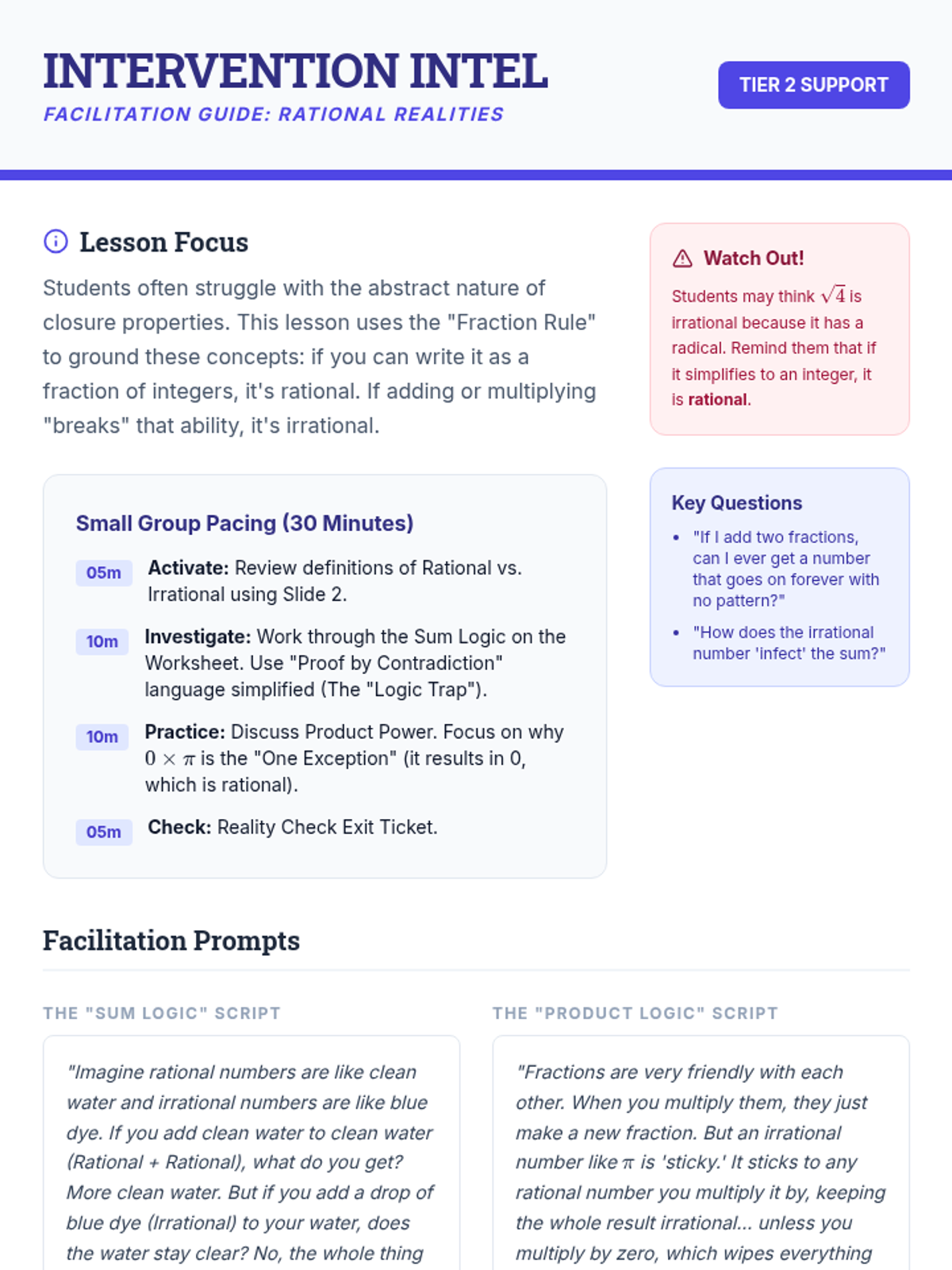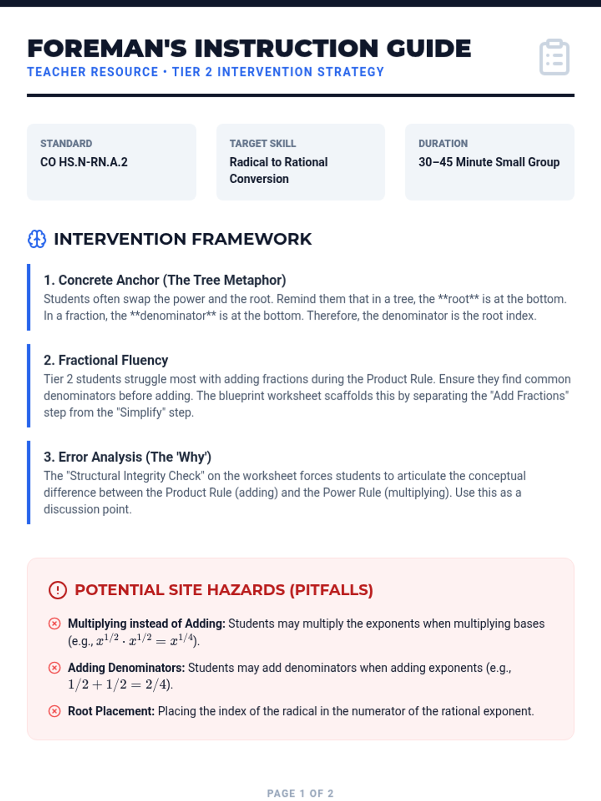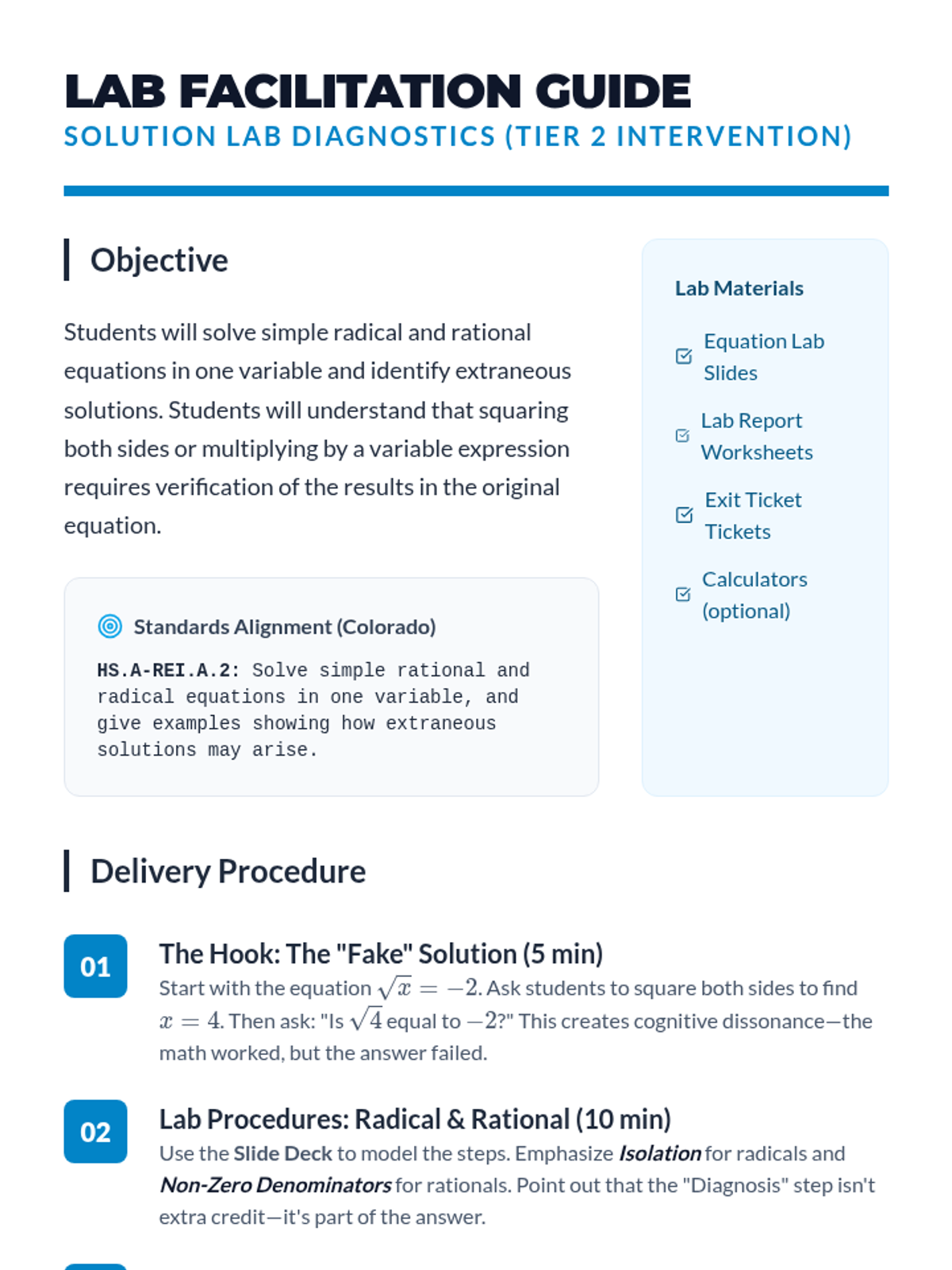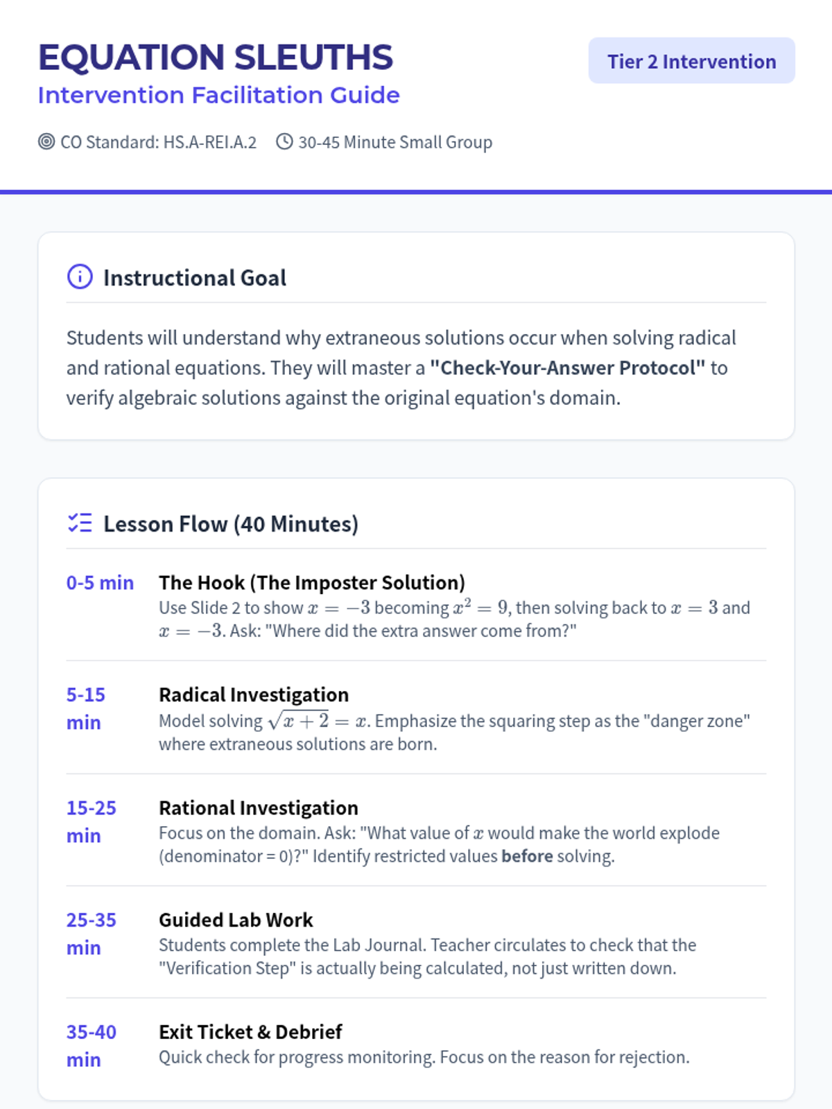 A targeted intervention lesson focused on solving simple radical and rational equations while identifying extraneous solutions through systematic verification. Designed for small-group Tier 2 support, it emphasizes the 'why' behind false solutions.