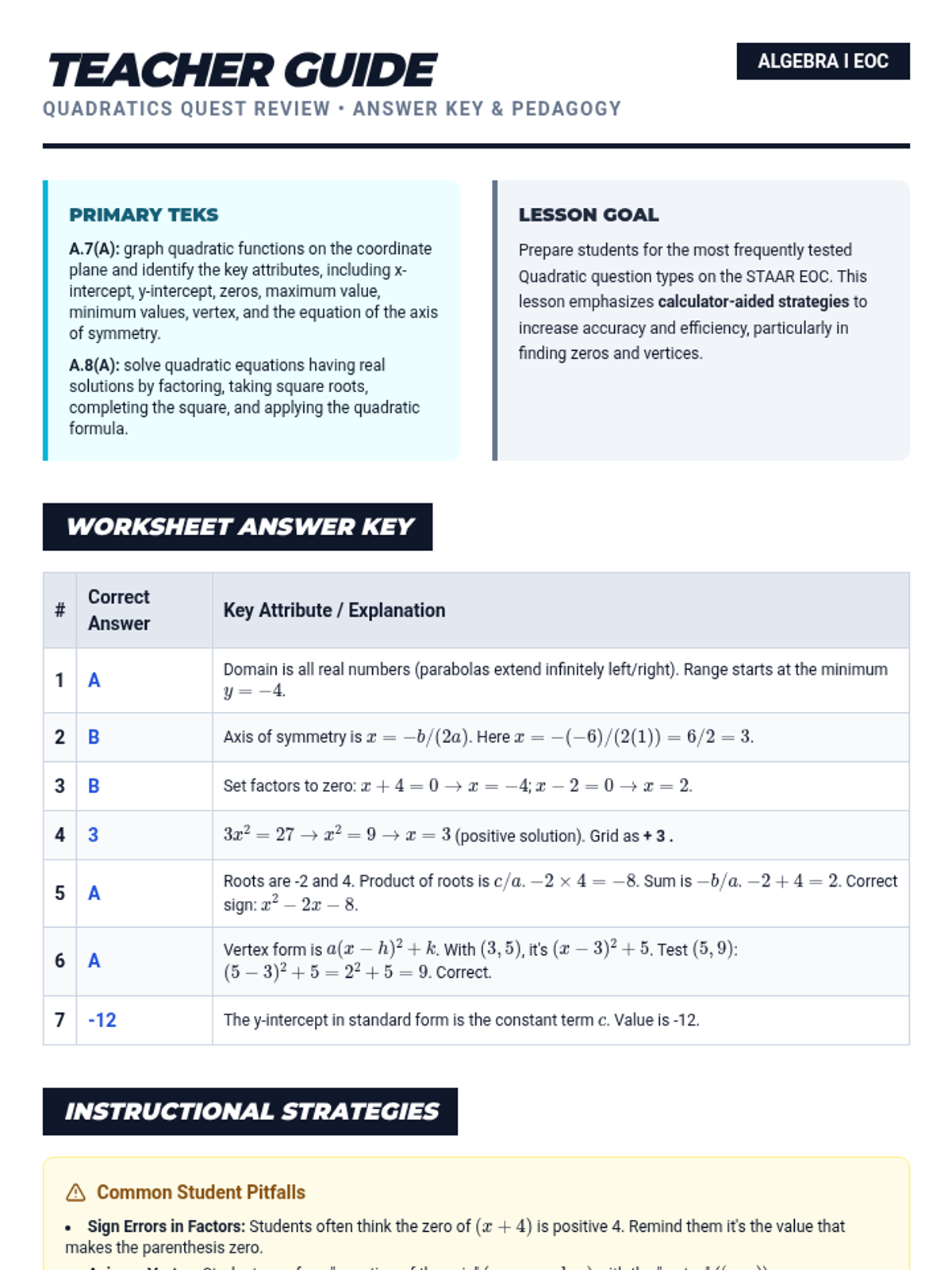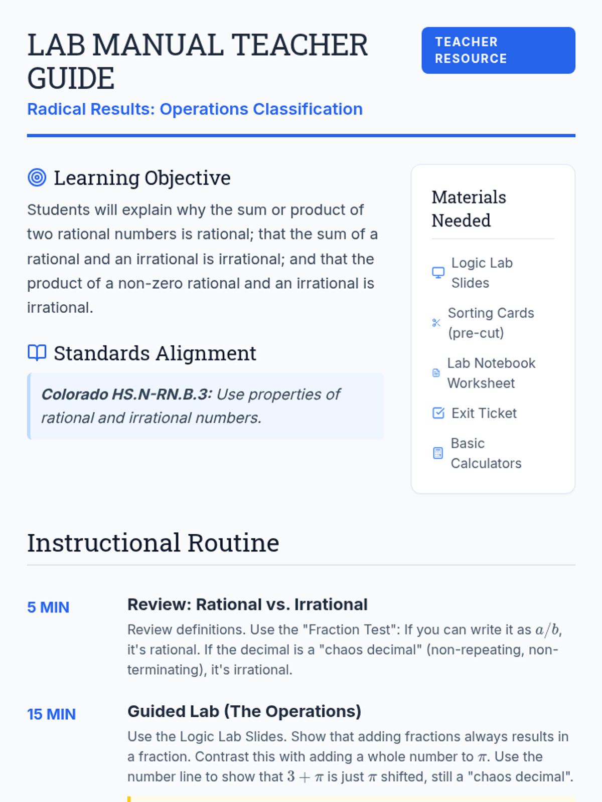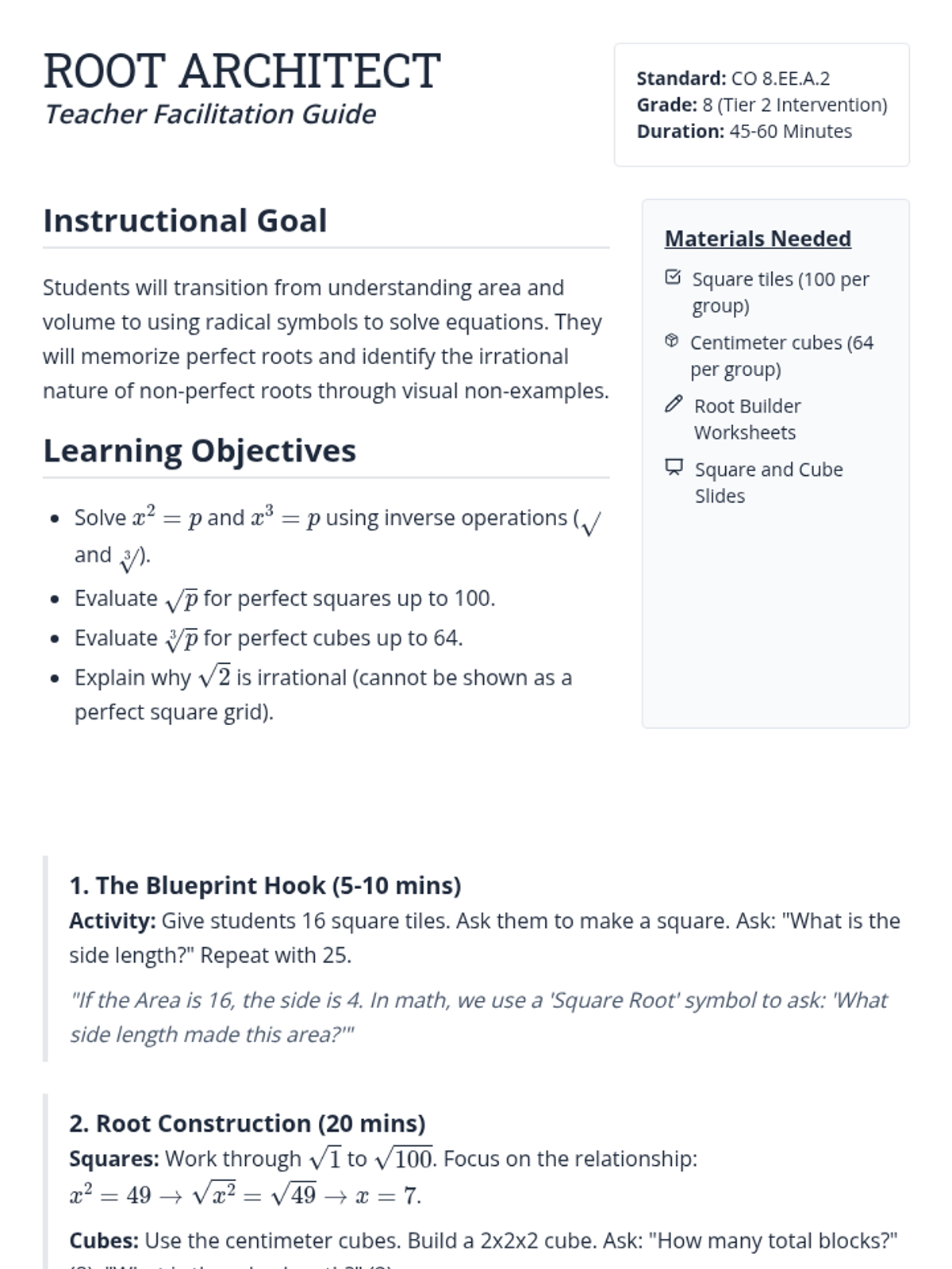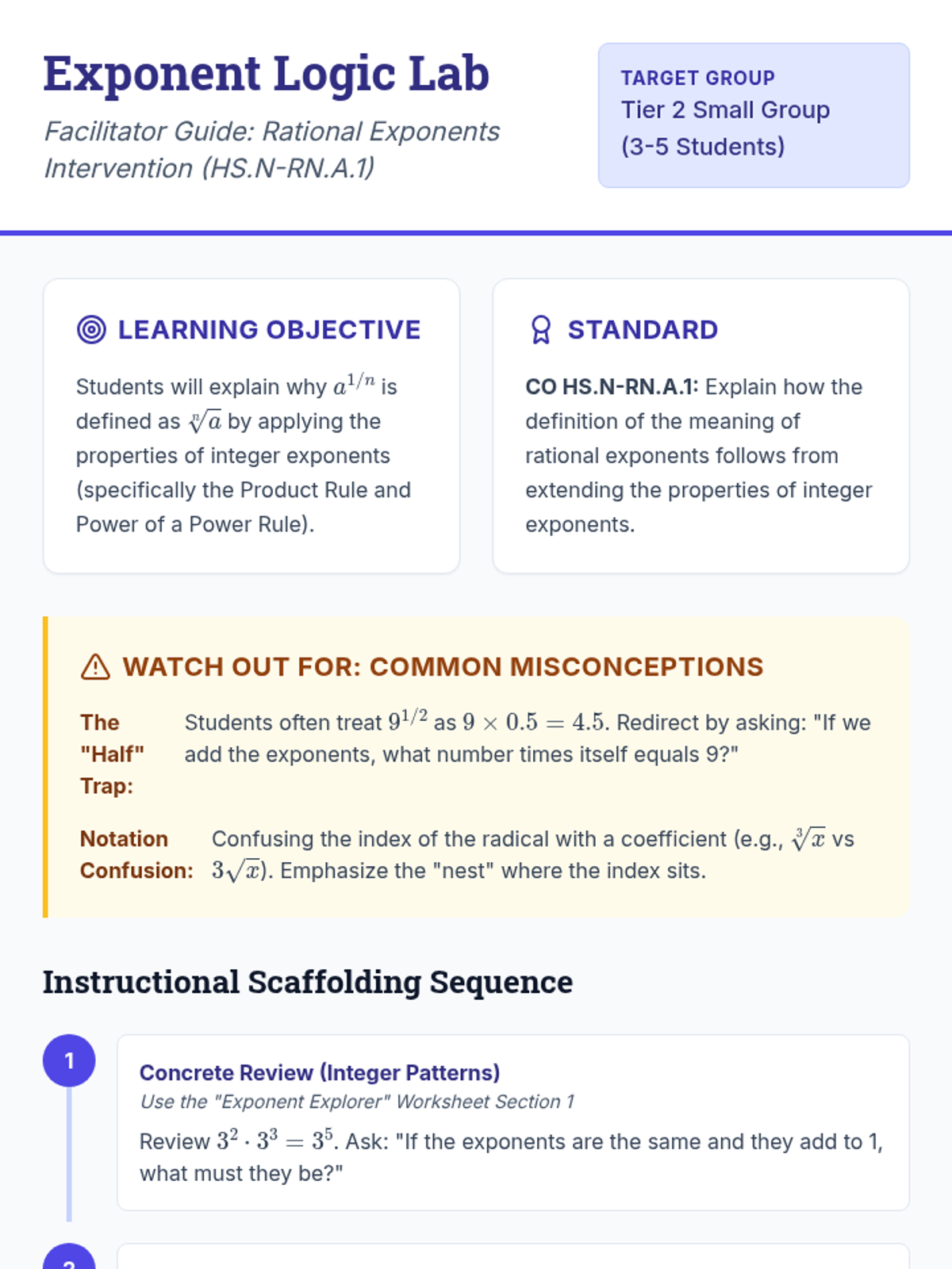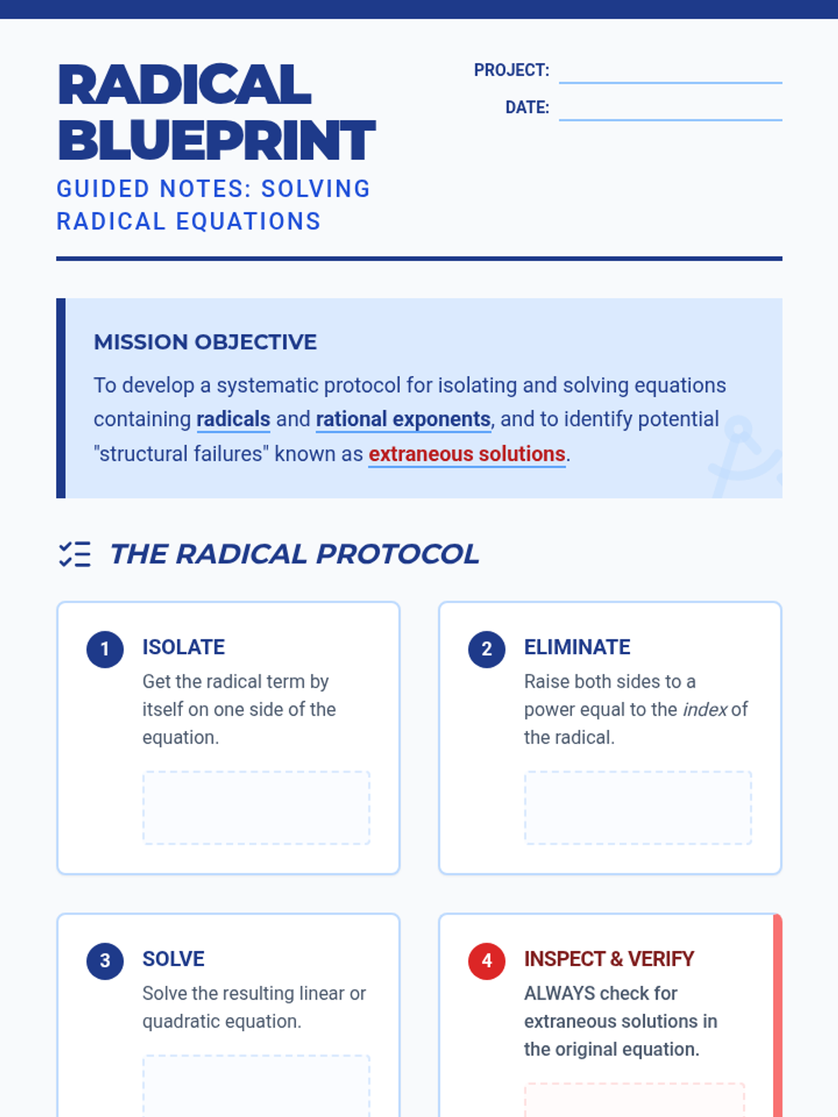 A targeted intervention lesson focused on solving simple radical and rational equations while identifying extraneous solutions through systematic verification. Designed for small-group Tier 2 support, it emphasizes the 'why' behind false solutions.
