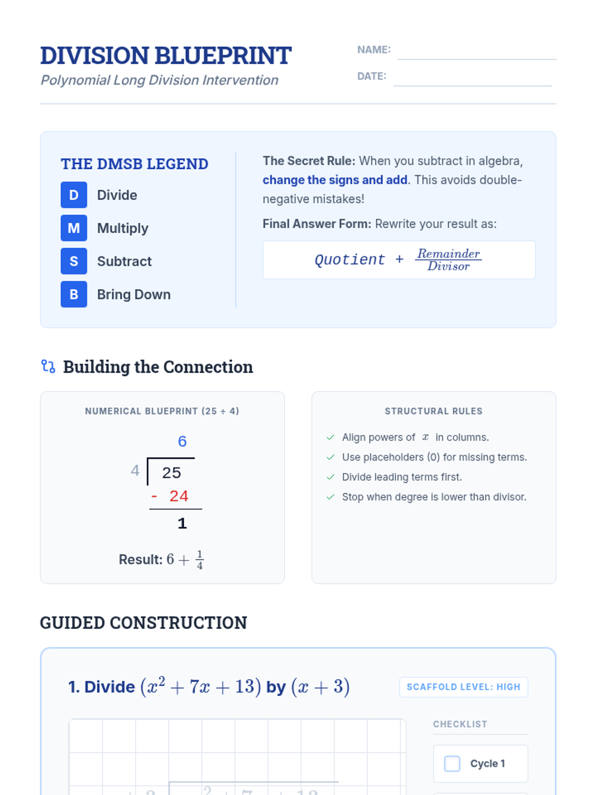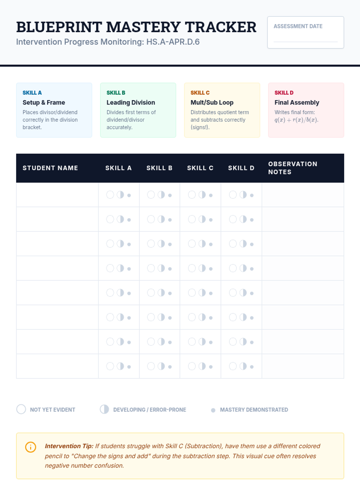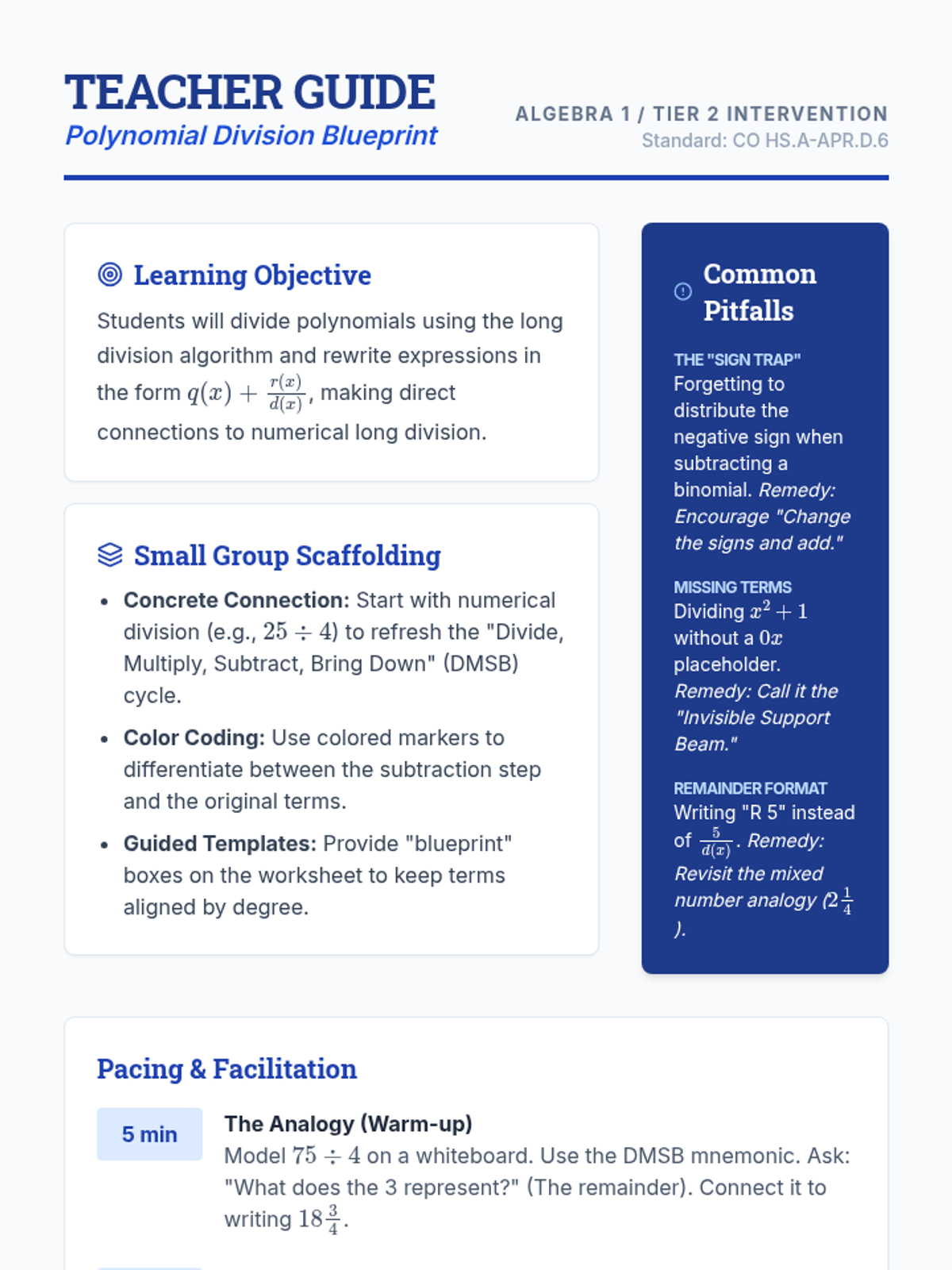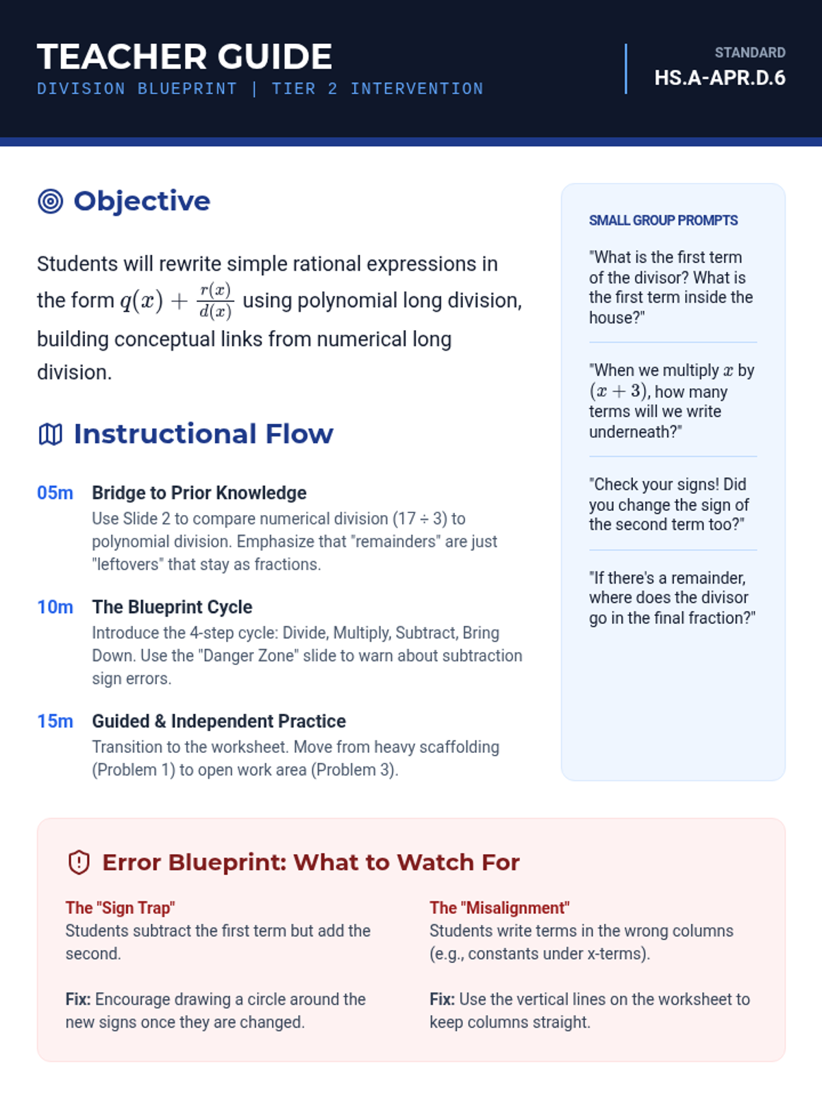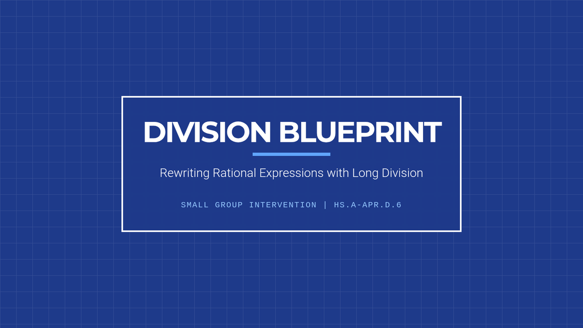 A targeted Tier 2 intervention lesson focusing on rewriting rational expressions using polynomial long division through scaffolded steps and visual organizers.