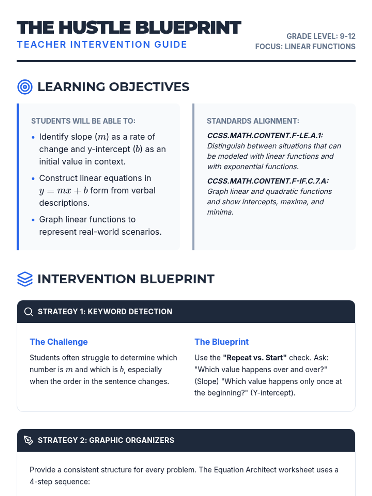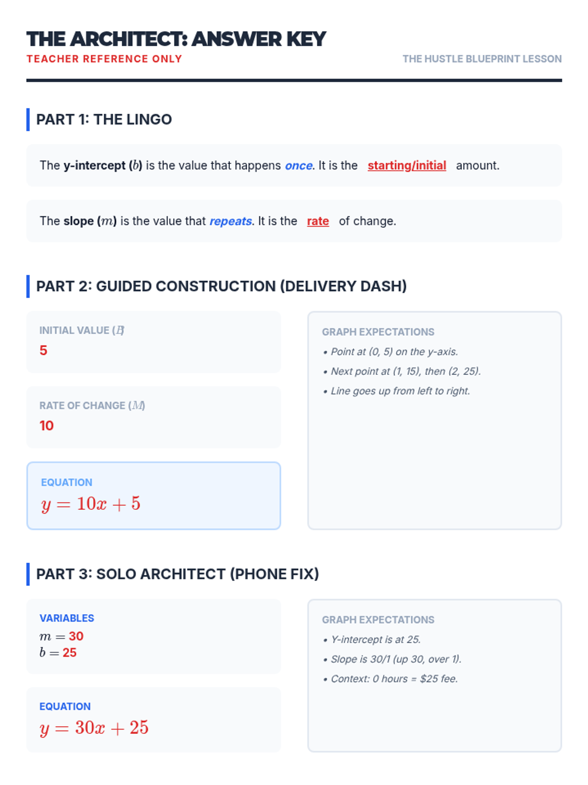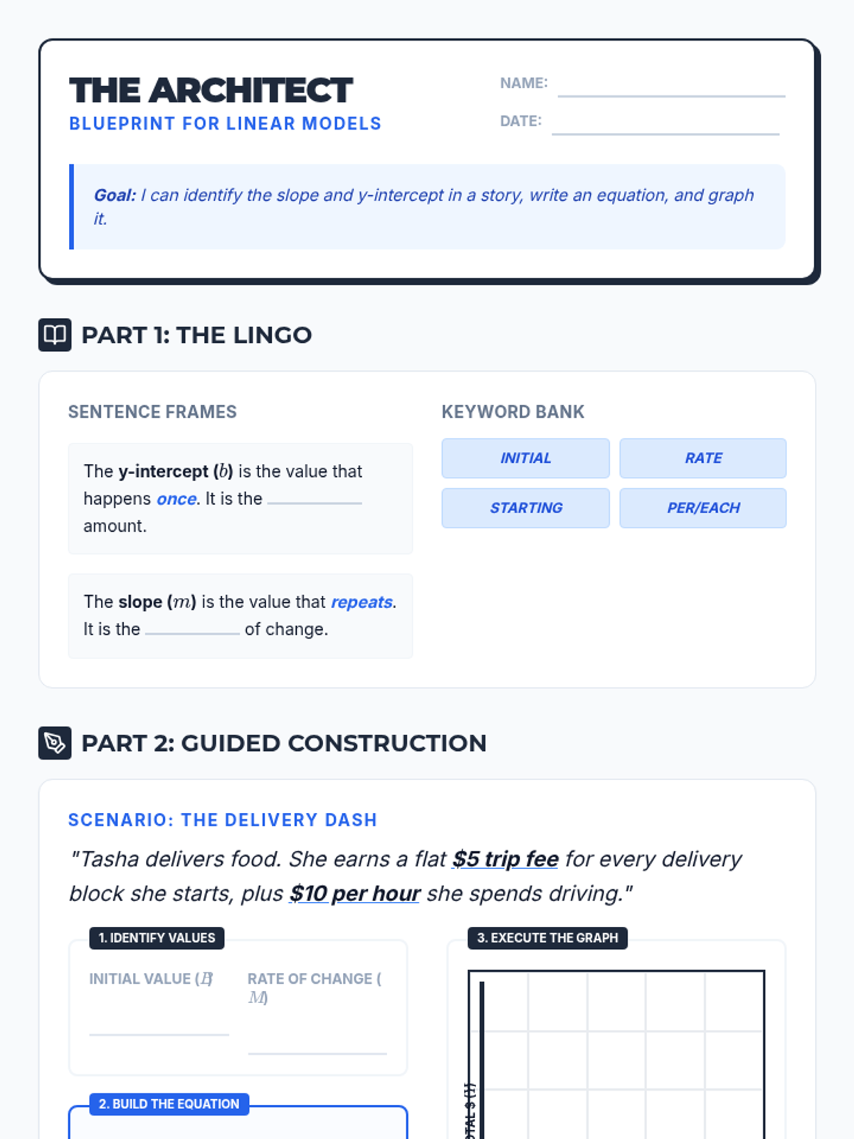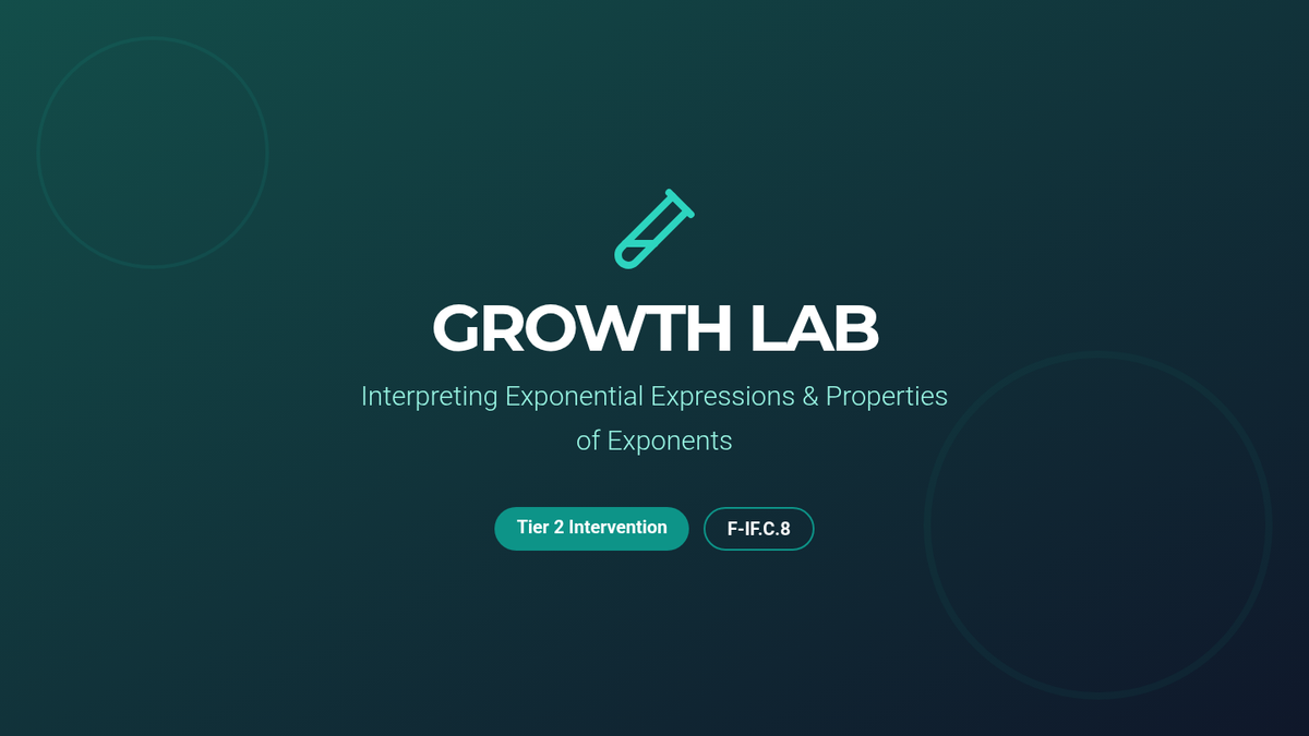 A small-group intervention lesson designed to help students identify and interpret the parameters of linear ($mx+b$) and exponential ($ab^x$) functions within real-world contexts. Includes scaffolded matching activities and a structured writing task for progress monitoring.