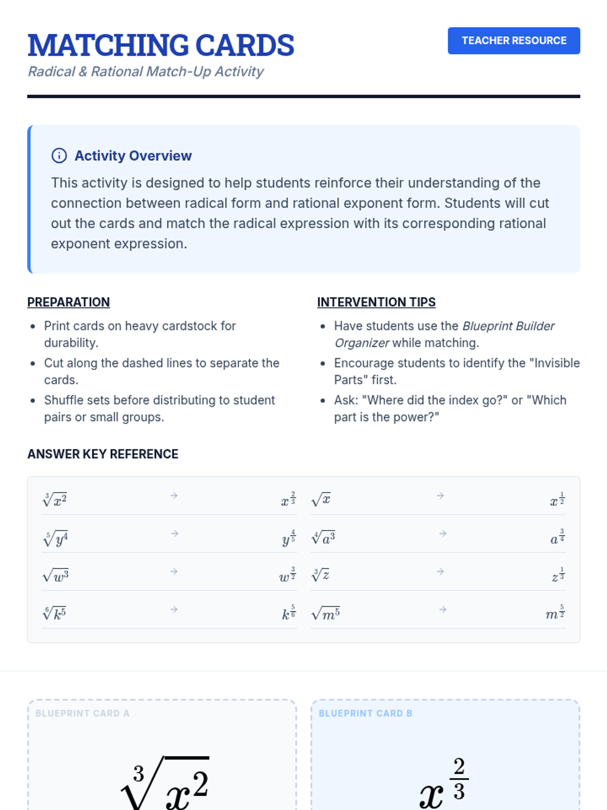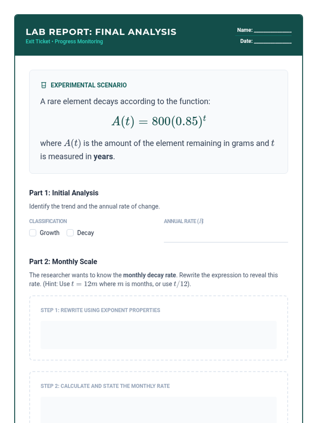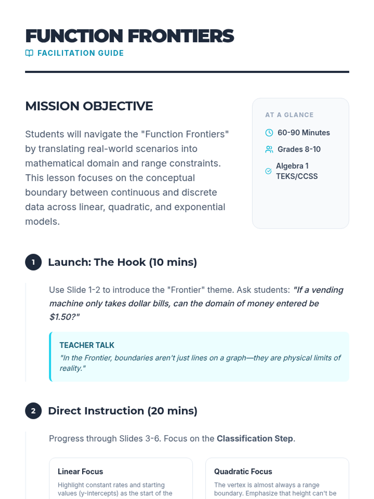 A small-group intervention lesson designed to help students identify and interpret the parameters of linear ($mx+b$) and exponential ($ab^x$) functions within real-world contexts. Includes scaffolded matching activities and a structured writing task for progress monitoring.