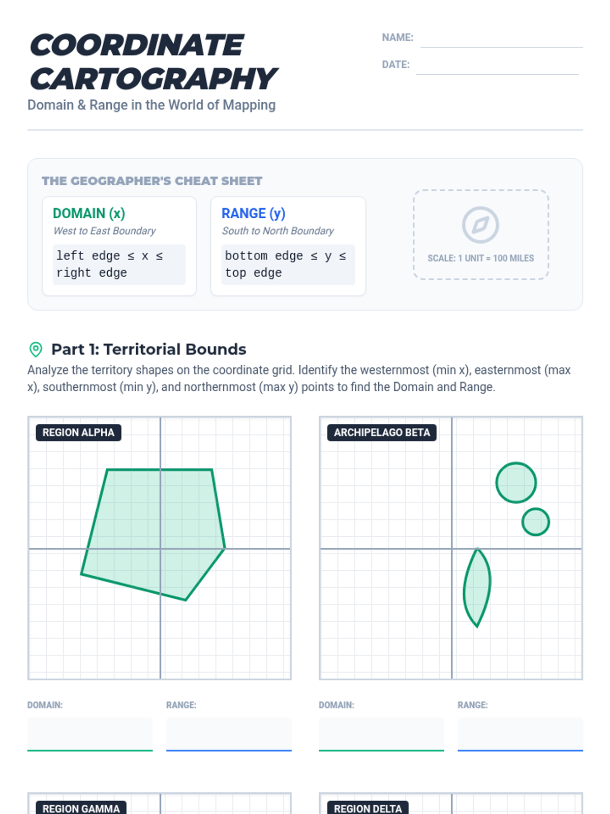 A cross-curricular lesson where students apply the mathematical concepts of domain and range to geographic boundaries and coordinate mapping. Designed to be taught by geography teachers, it bridges coordinate geometry with cartographic analysis.