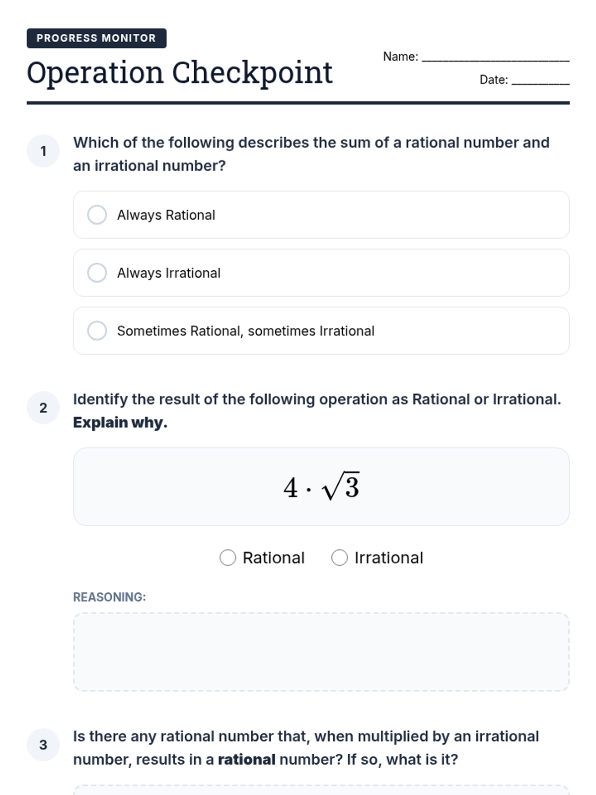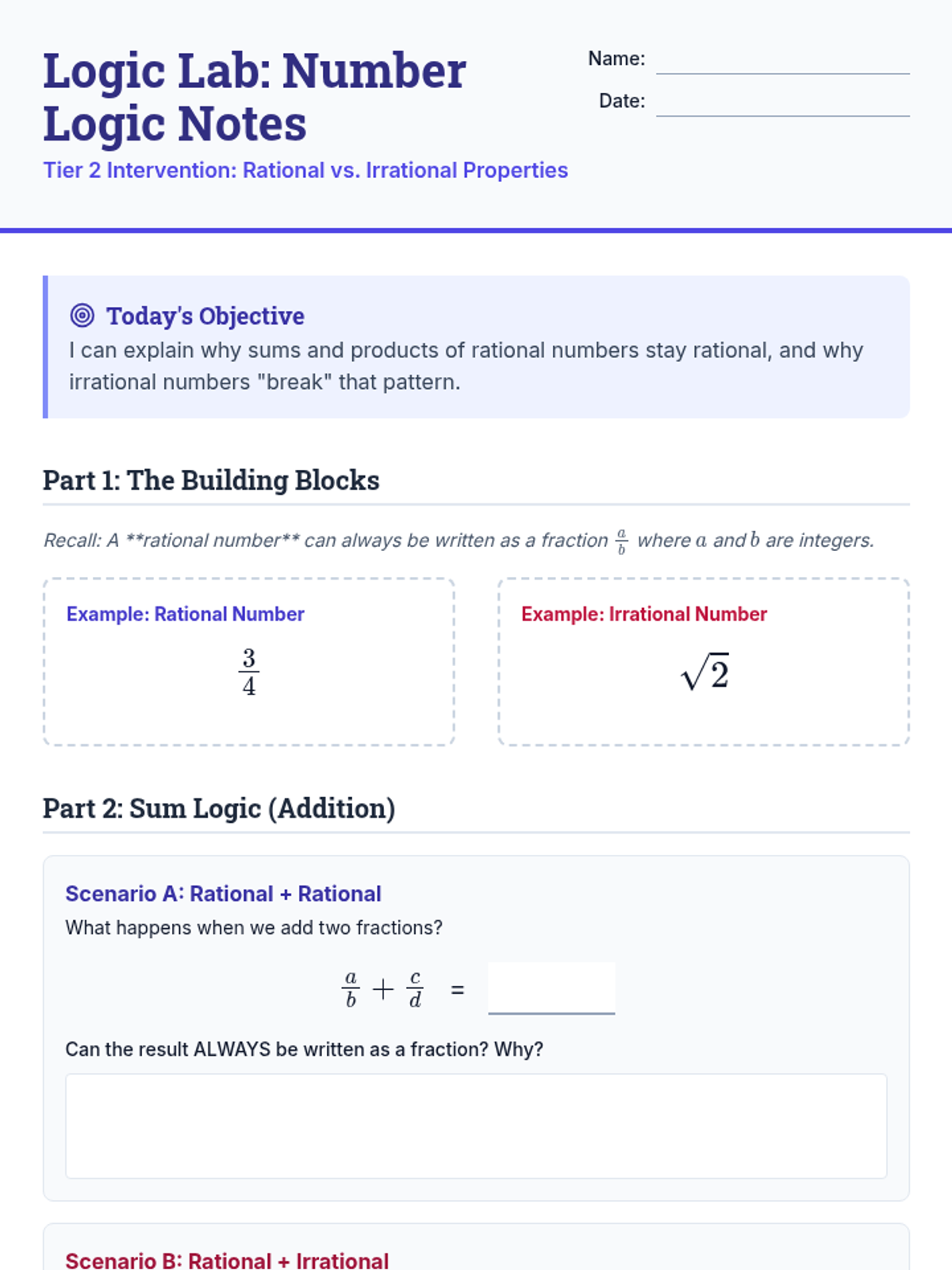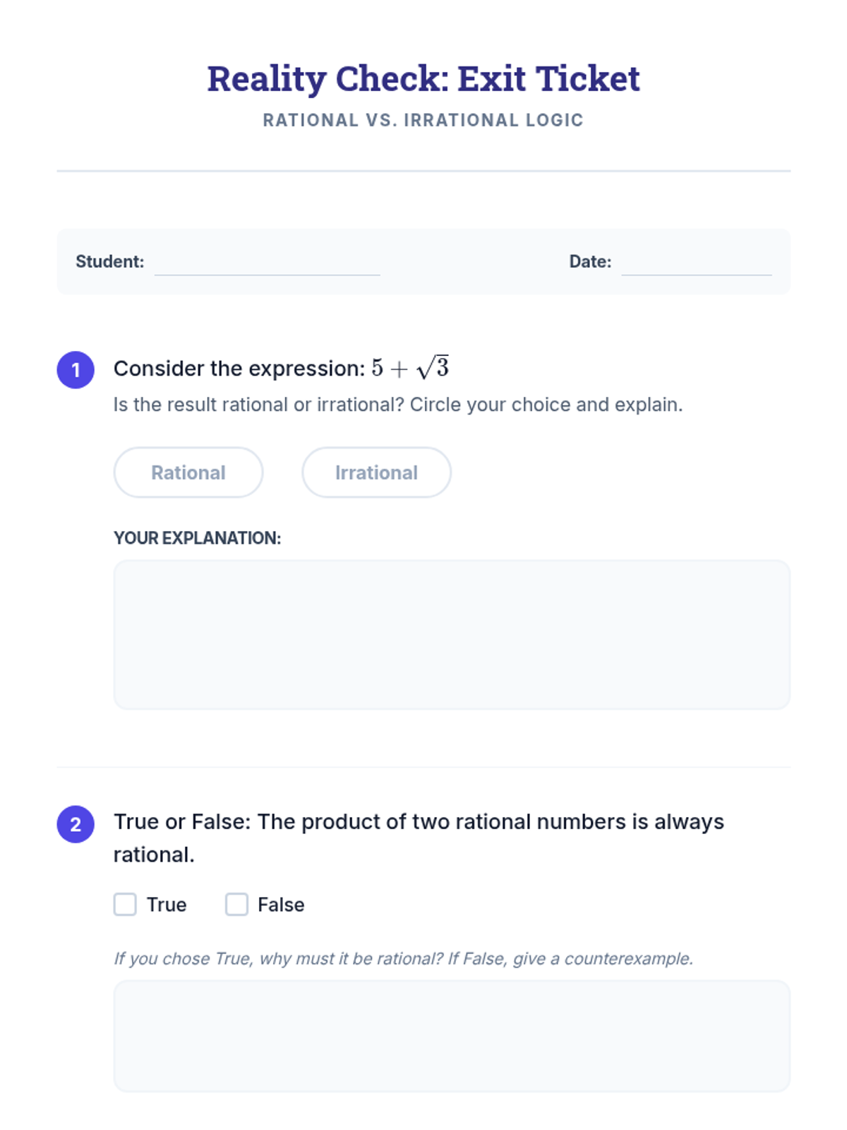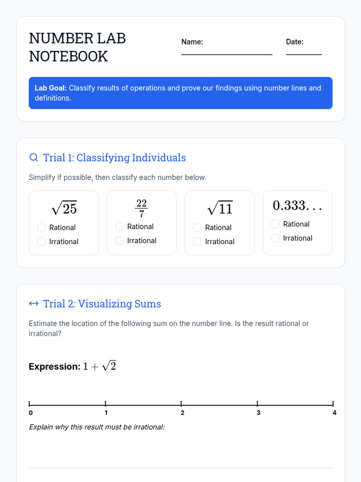 Rational and Irrational NumbersDistinction between rational and irrational numbers through fraction conversion and decimal expansion analysis. Addresses irrational constants like pi and square roots of non-perfect squares.