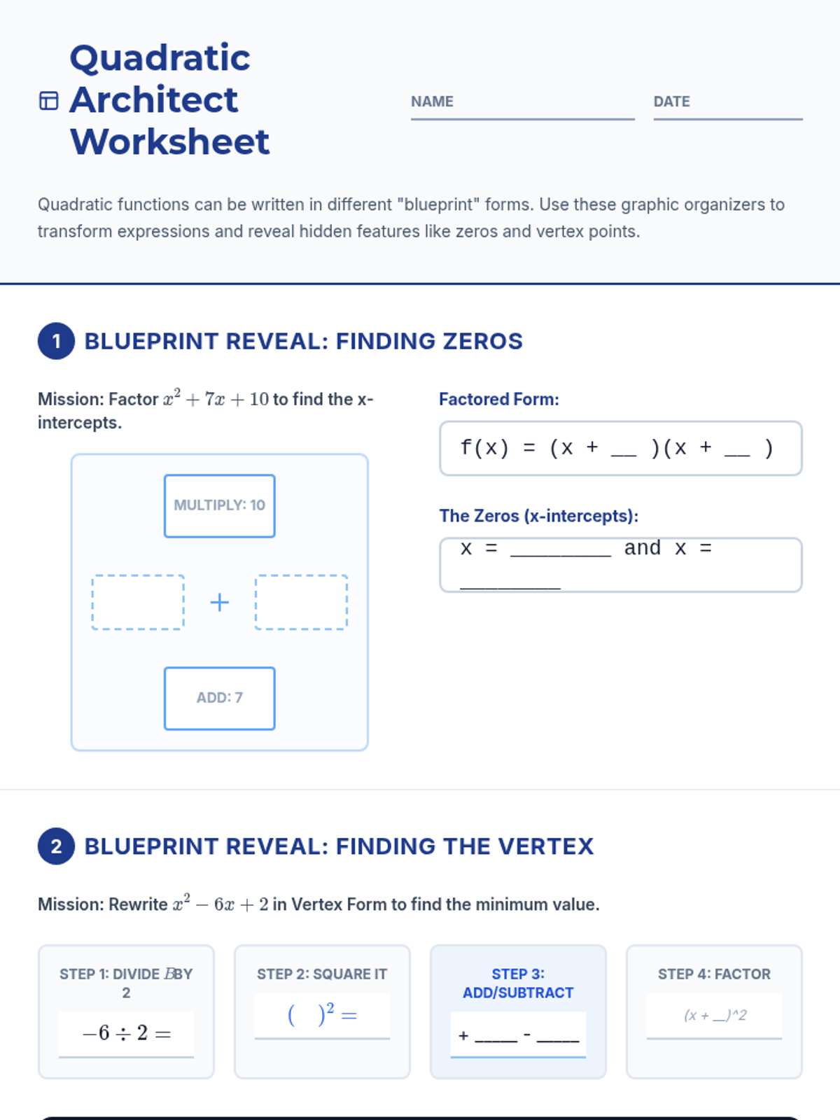 Master factoring trinomials of the form x^2 + bx + c and ax^2 + bx + c using the "X-box" or diamond method for visual scaffolding.