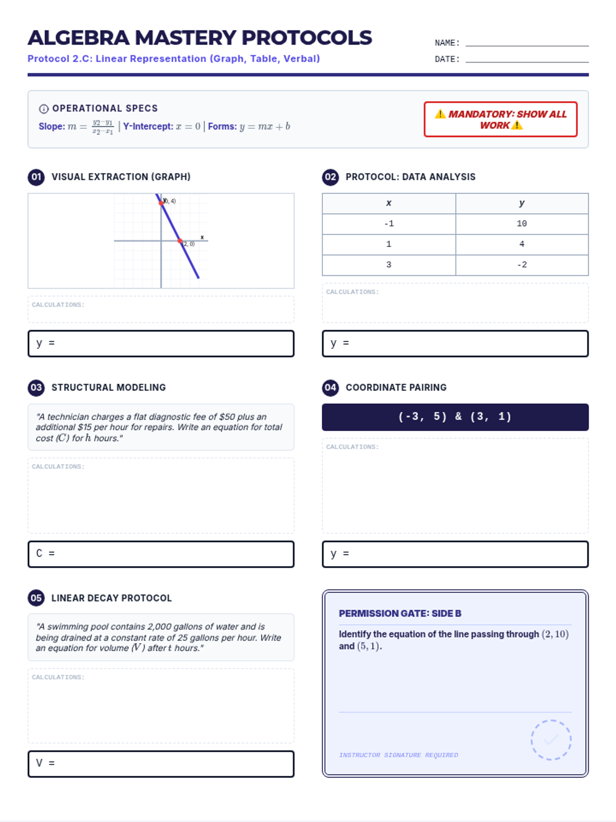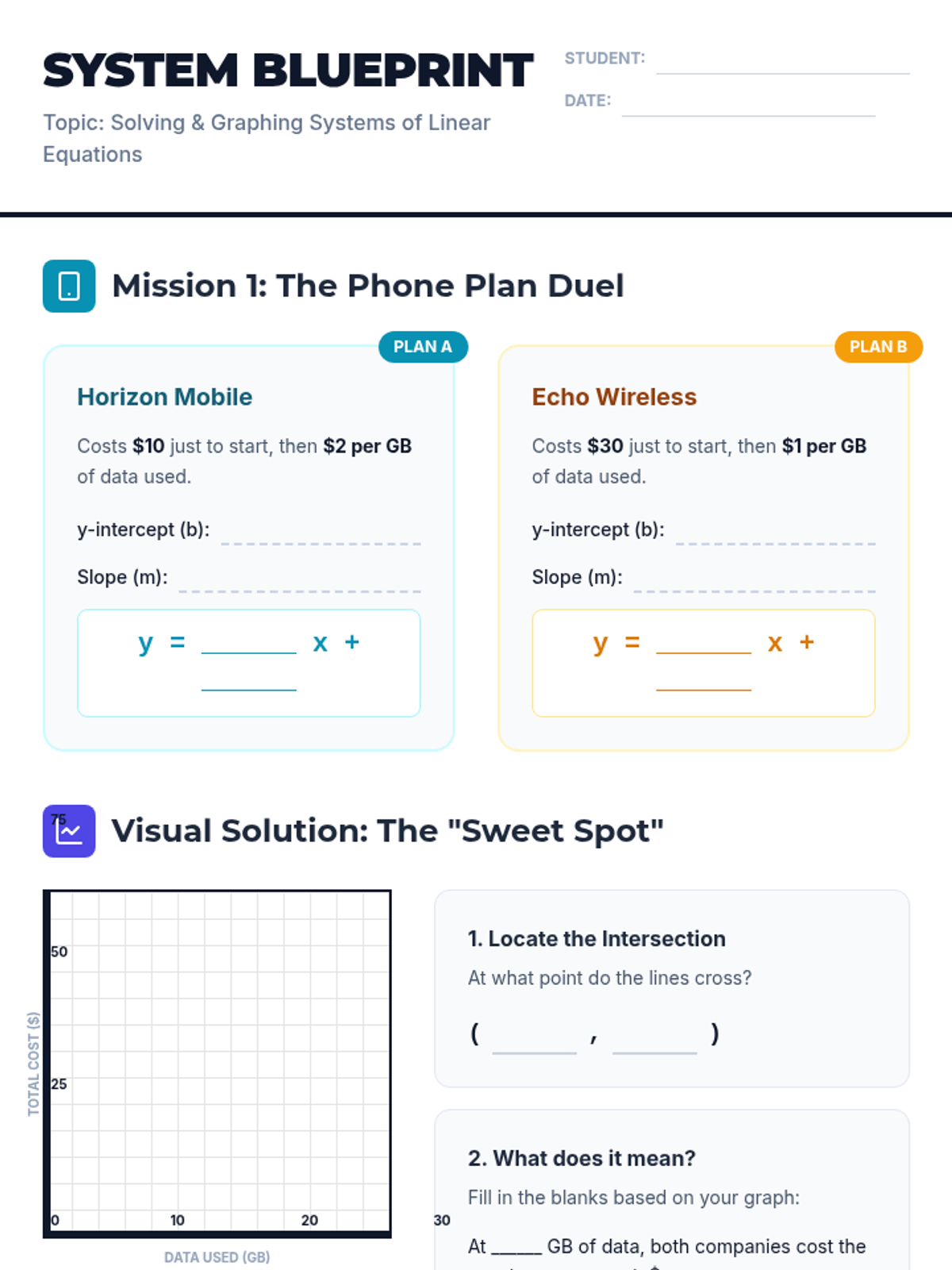 Graph Equations and InequalitiesCoordinate plane representations of linear functions, systems of equations, and inequality solution sets. Builds skills in identifying intercepts, slopes, and feasible regions through visual mapping.
