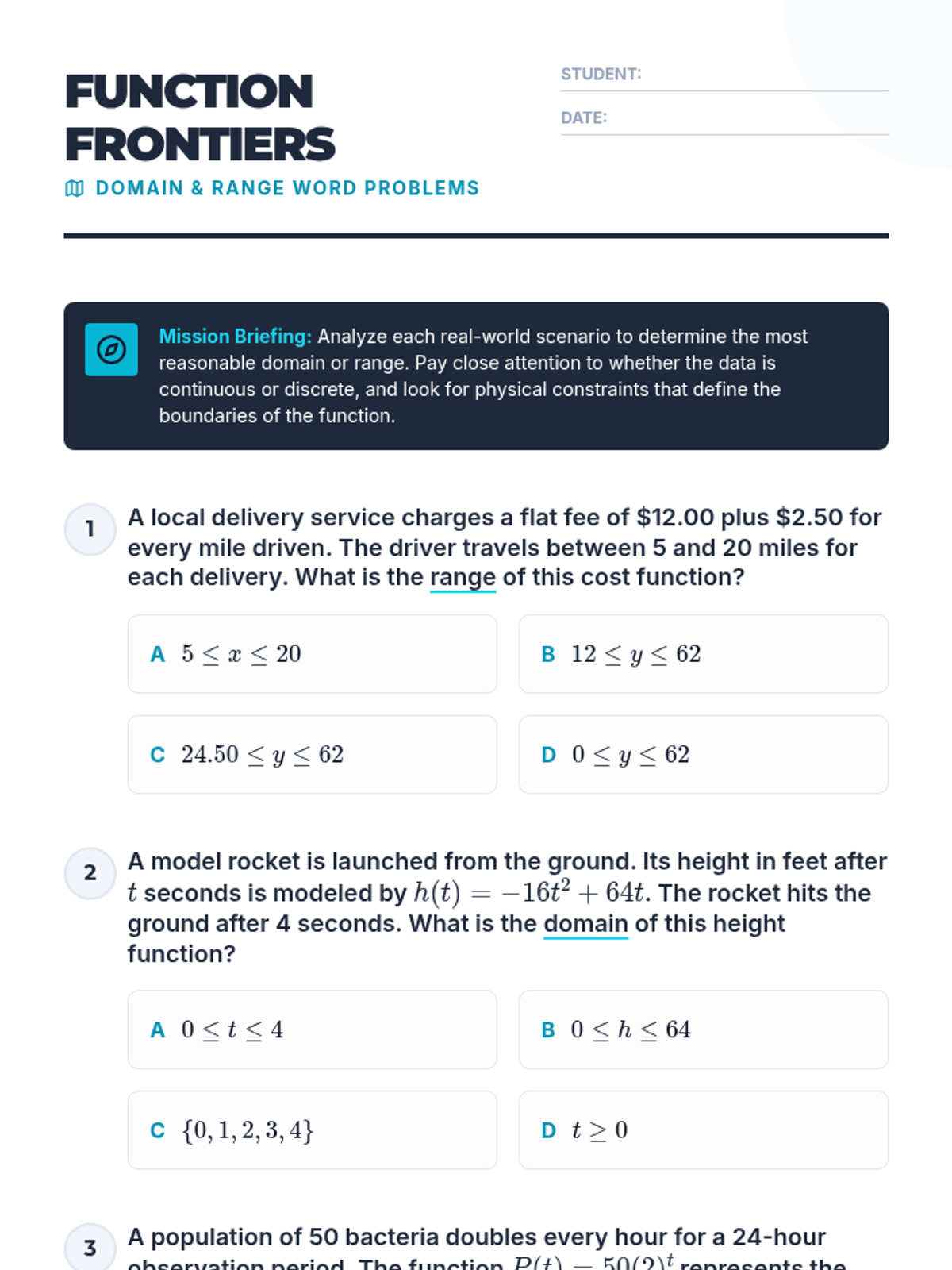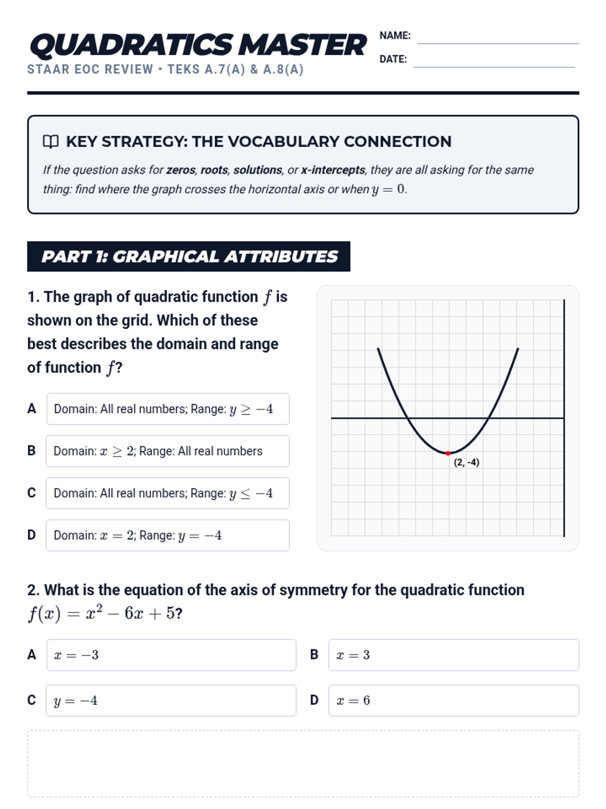 A hands-on card sort activity focused on identifying domain and range from various representations, aligned with Texas STAAR Algebra 1 standards across all performance levels.