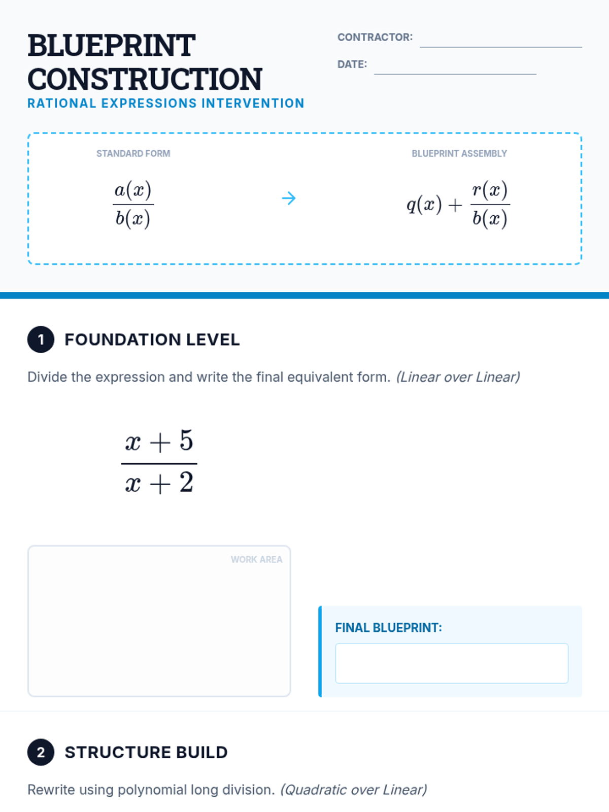 A Tier 2 intervention lesson focused on deconstructing rational expressions using polynomial long division to find equivalent forms. Students learn to transform expressions of the form a(x)/b(x) into q(x) + r(x)/b(x) through scaffolded steps and visual blueprints.