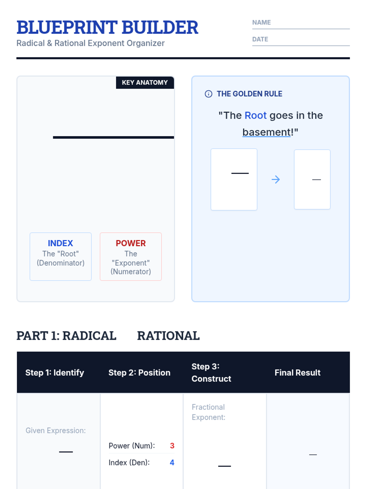 Rational ExponentsRelationship between radical expressions and power notation using fractional exponents. Simplifies complex algebraic expressions by applying exponent properties to rational numbers.