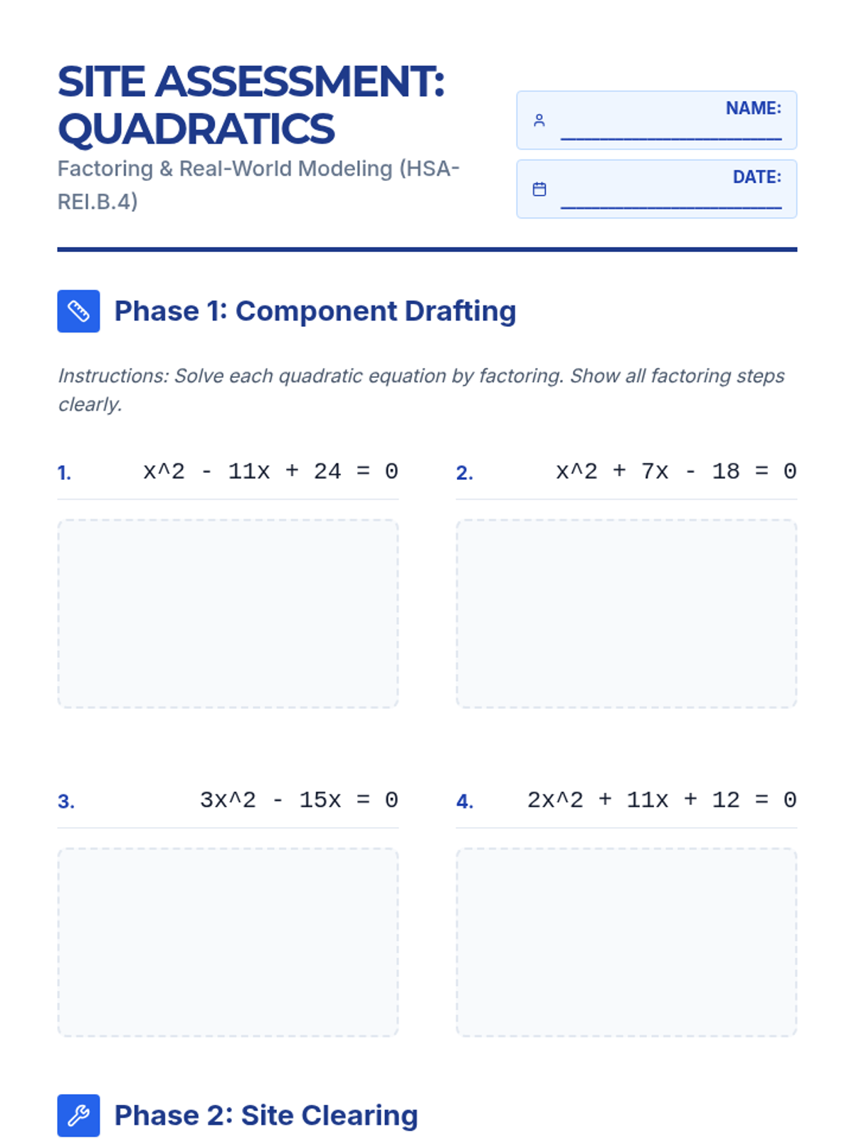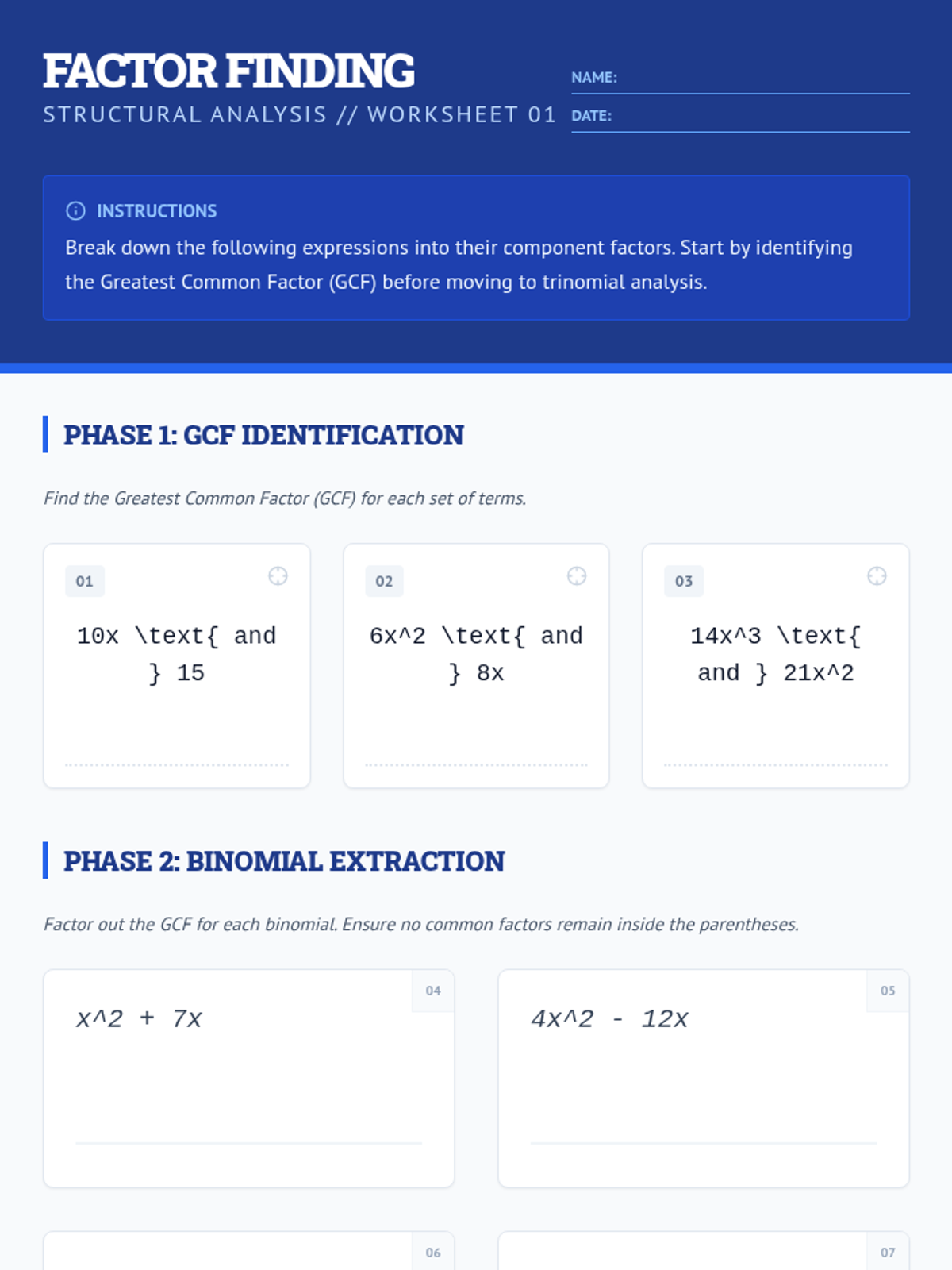 Assess baseline knowledge of linear equations and basic operations while introducing Greatest Common Factor (GCF) and Difference of Squares factoring methods.