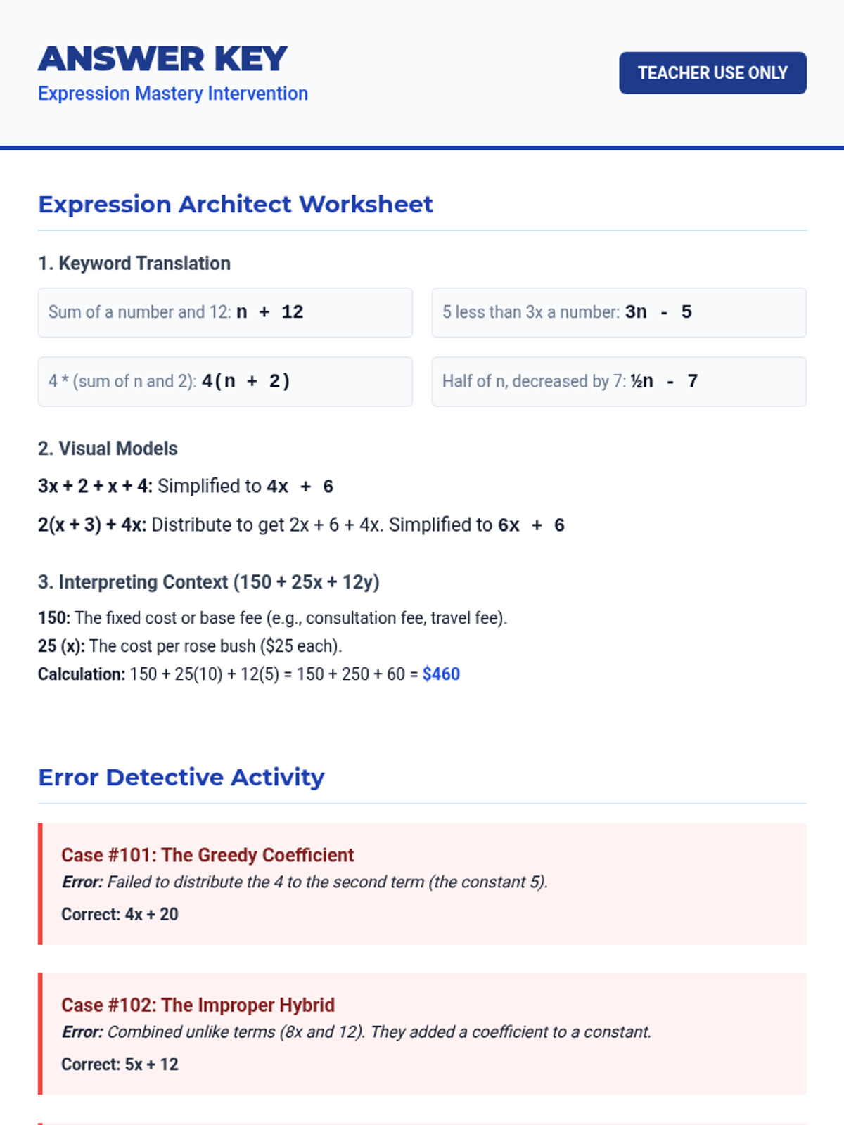 Algebraic ExpressionsSimplifying and evaluating mathematical phrases involving variables, coefficients, and constants. Builds proficiency with the distributive property and combining like terms to solve for unknown values.