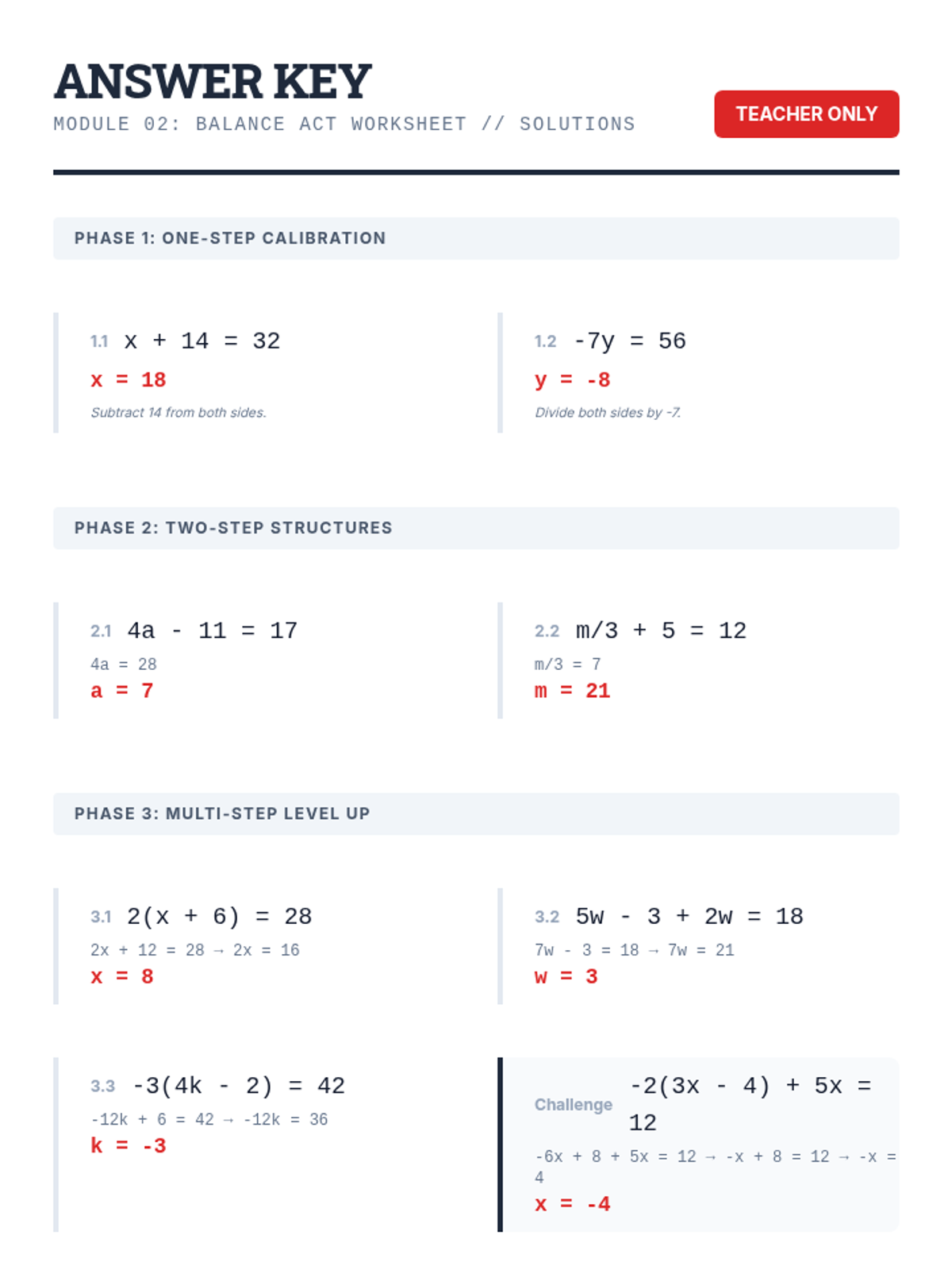 Equation Solving and ReasoningAlgebraic manipulation, inverse operations, and logical justifications for solving linear and multi-step equations. Develops the ability to verify solutions and communicate mathematical steps clearly.
