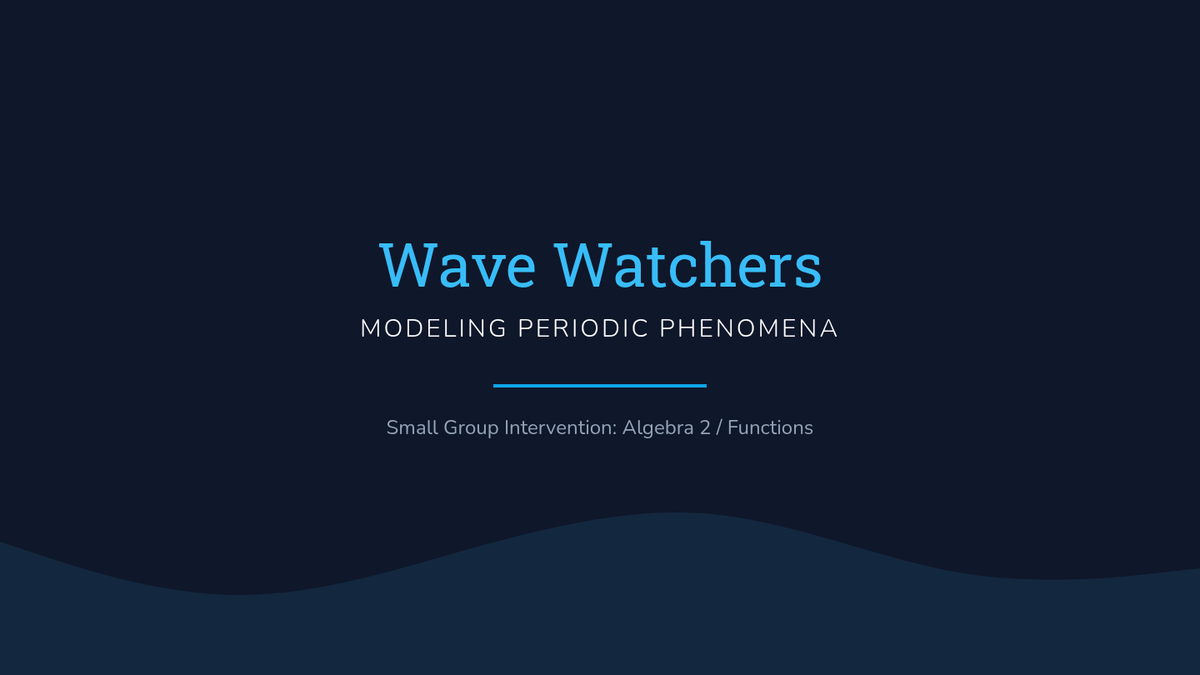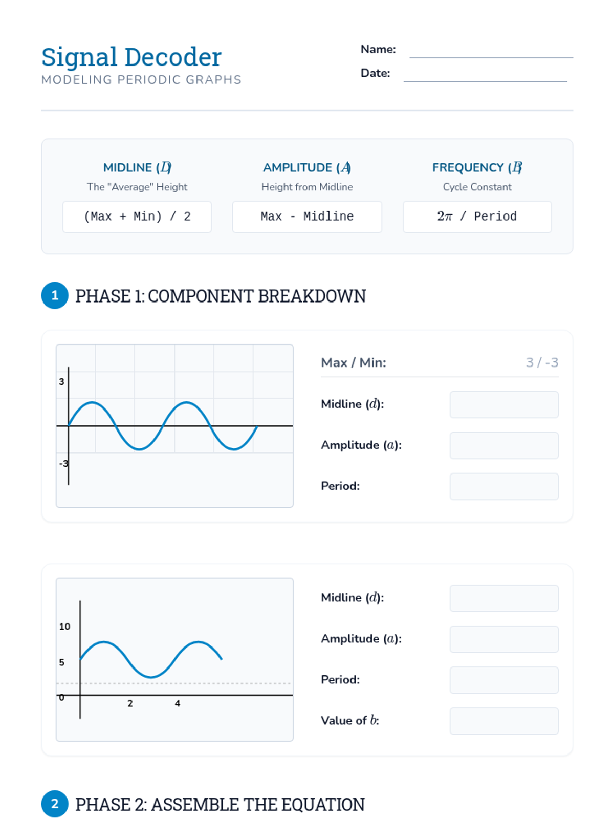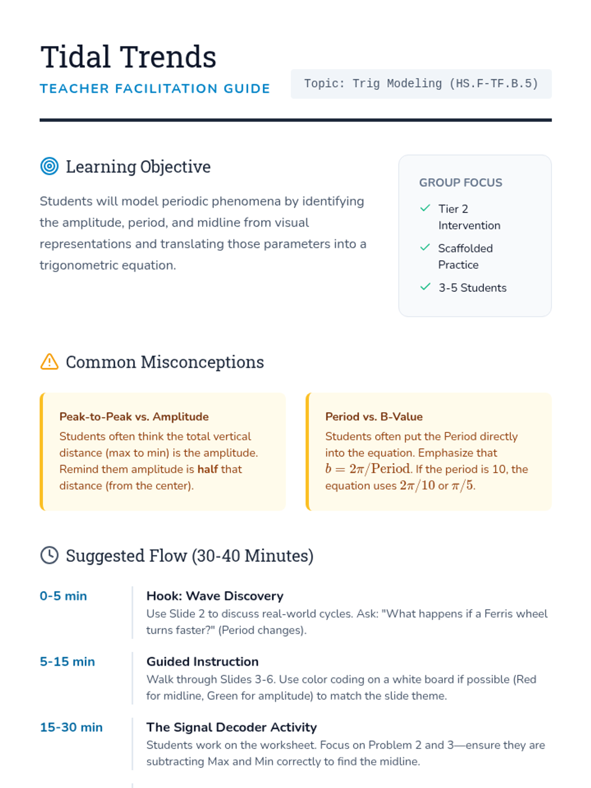 A Tier 2 small group intervention focused on identifying and modeling periodic parameters (amplitude, midline, and period) from graphs to build trigonometric equations. Students progress from visual identification to algebraic representation using a scaffolded approach.