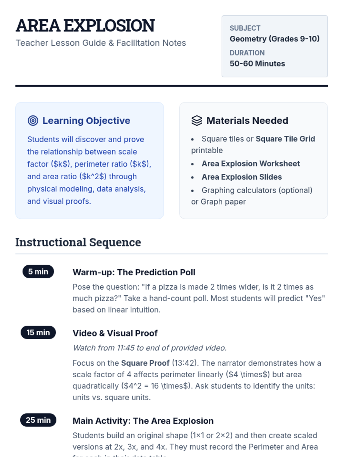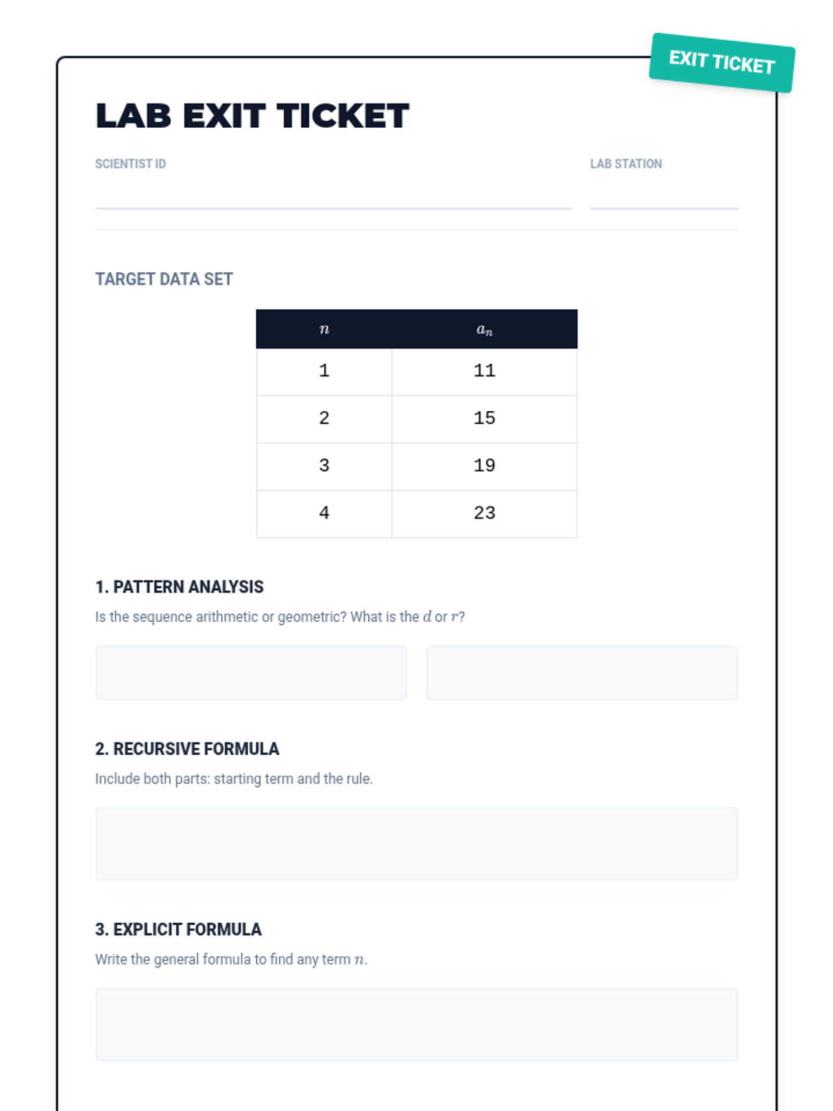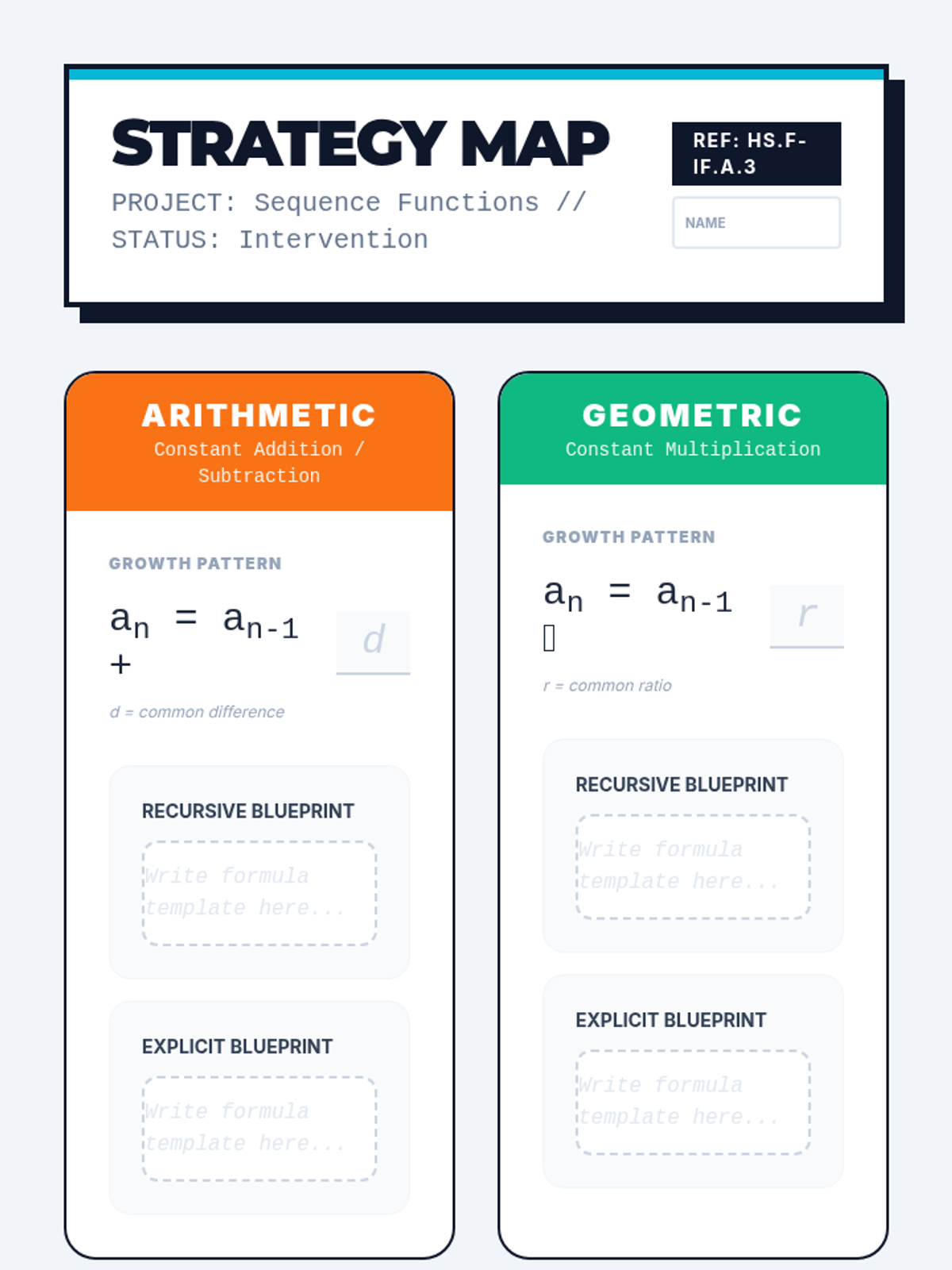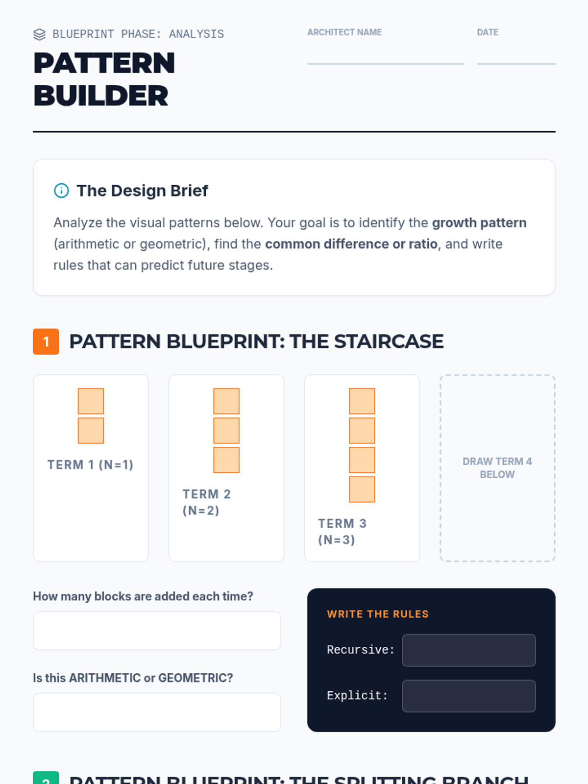 A scaffolded lesson focusing on distinguishing between arithmetic and geometric sequences, writing formulas, and modeling real-world growth and decay. Students use visual scaffolds to bridge the gap between concrete patterns and abstract algebraic formulas.