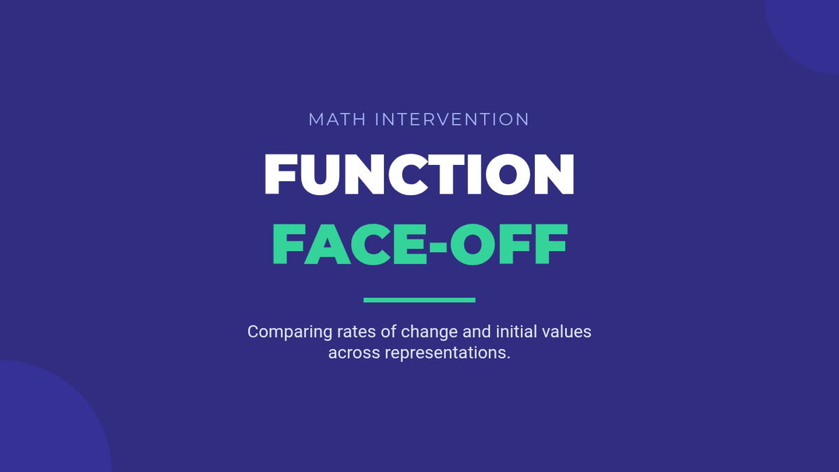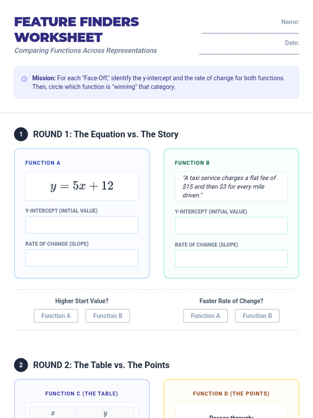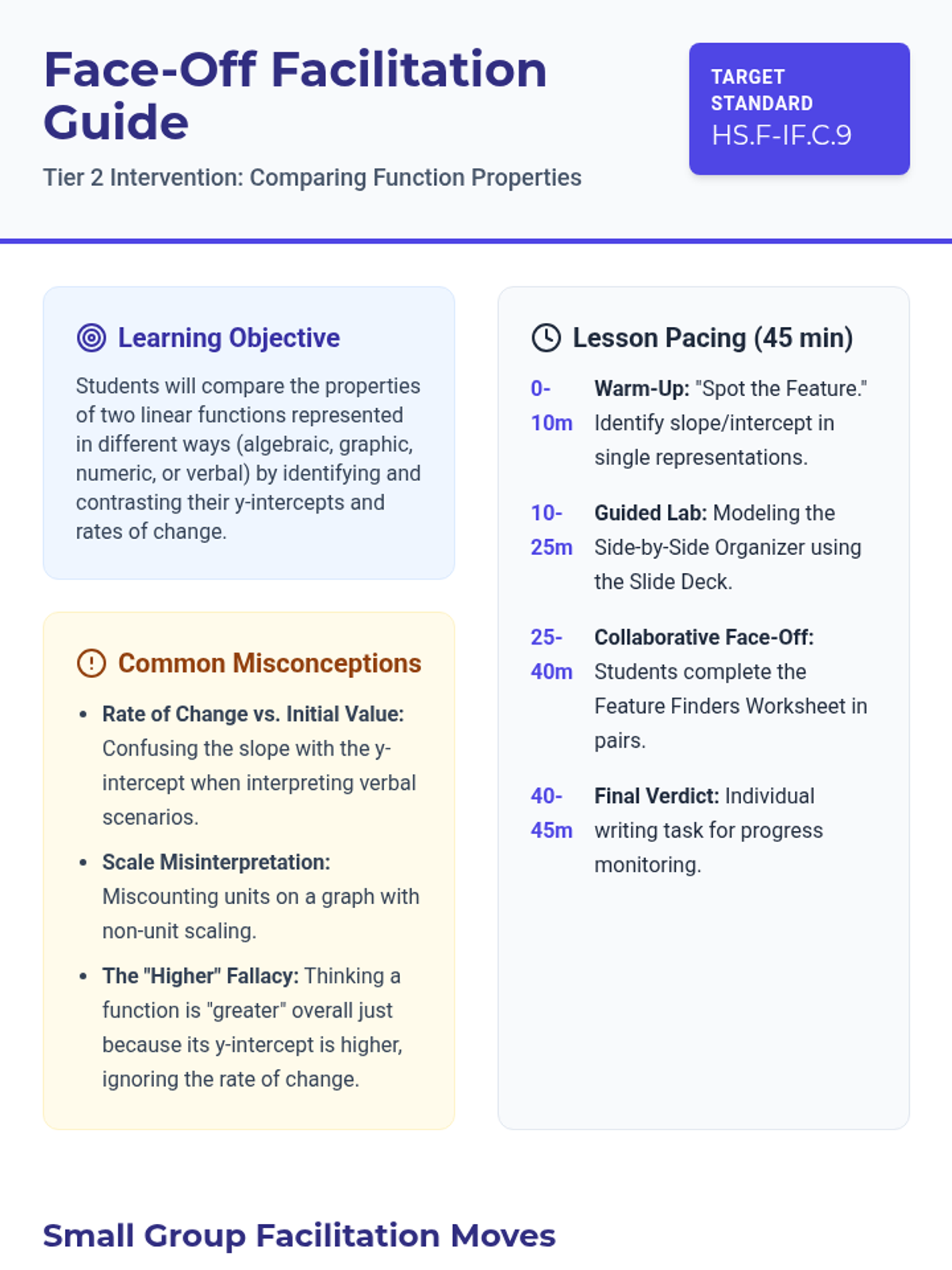 A Tier 2 intervention lesson focusing on comparing properties of functions across multiple representations (algebraic, graphic, numeric, and verbal). Students use scaffolded organizers to identify and compare key features like rate of change and y-intercepts.