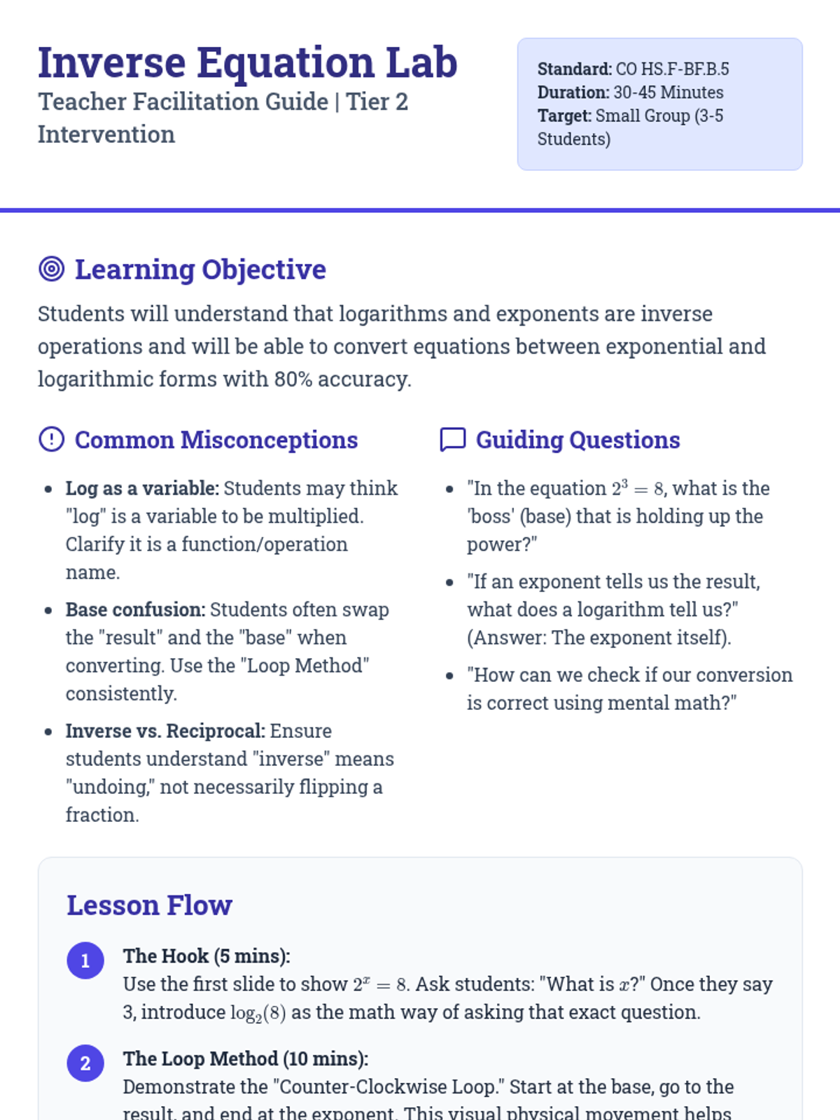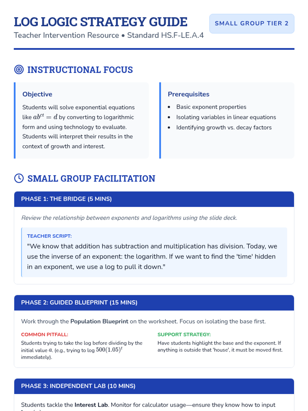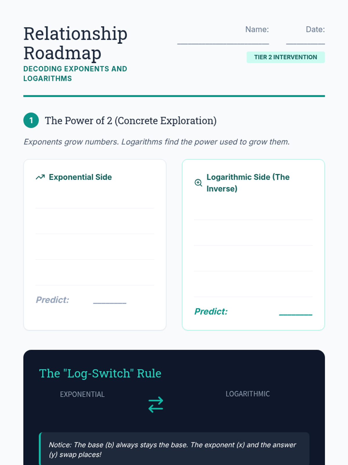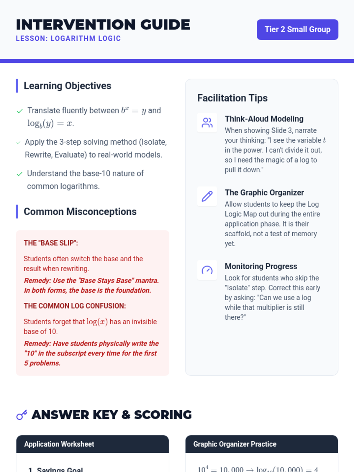 A targeted Tier 2 small group intervention focused on the inverse relationship between exponential and logarithmic forms, designed to help students master conversion and foundational problem-solving.