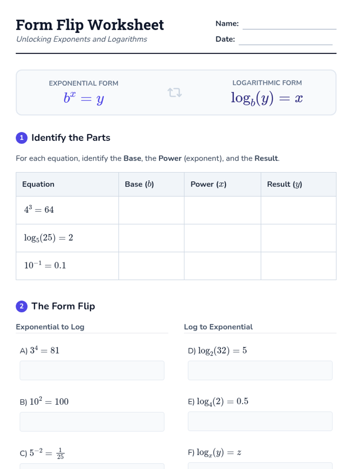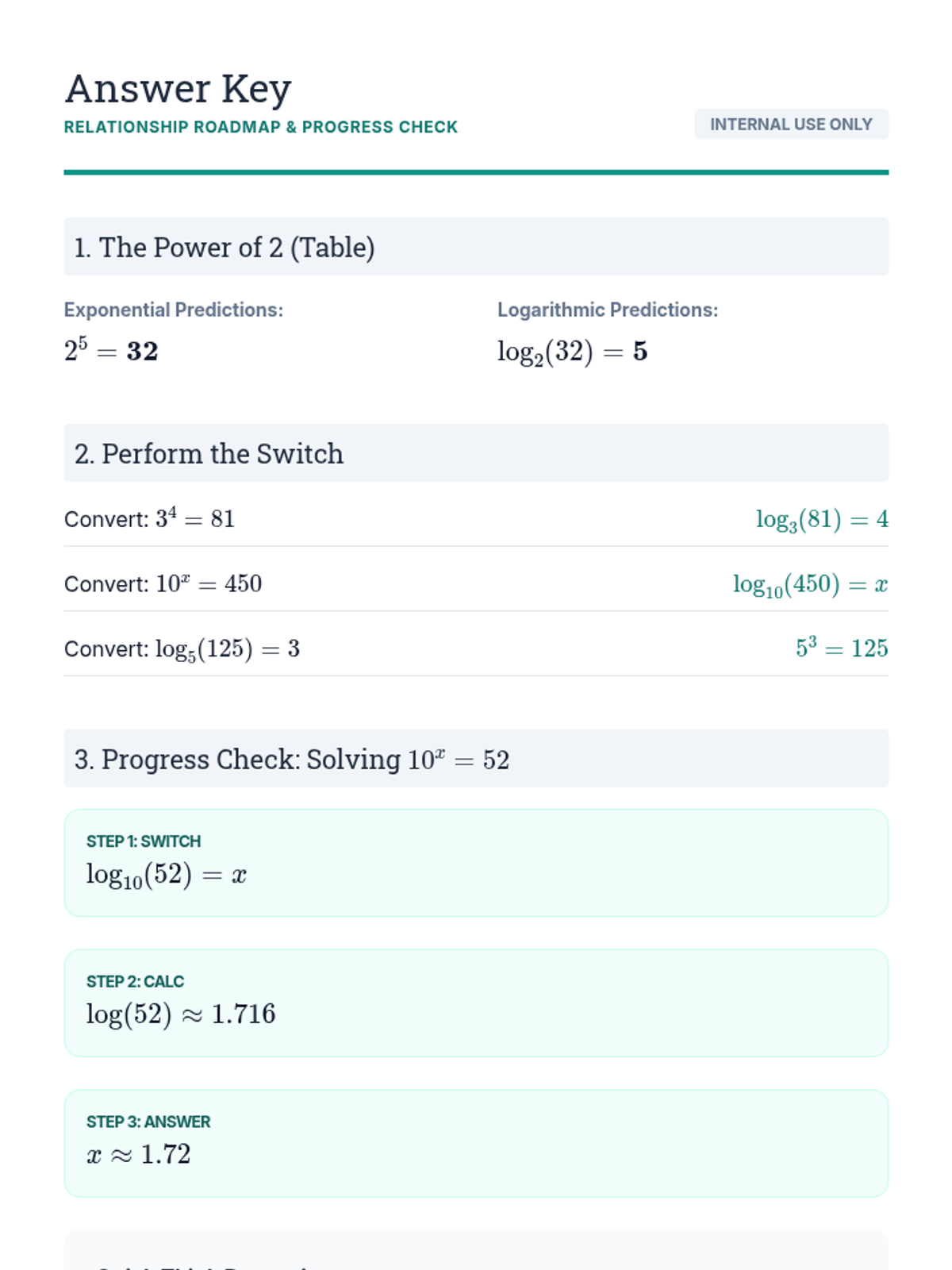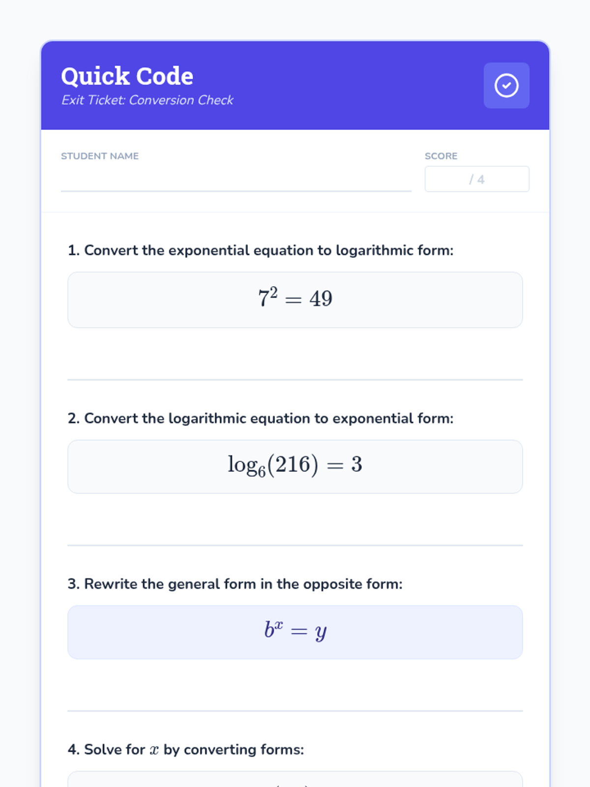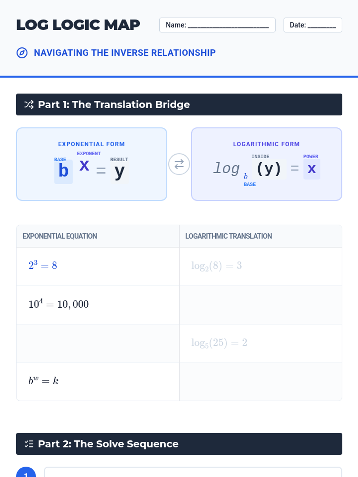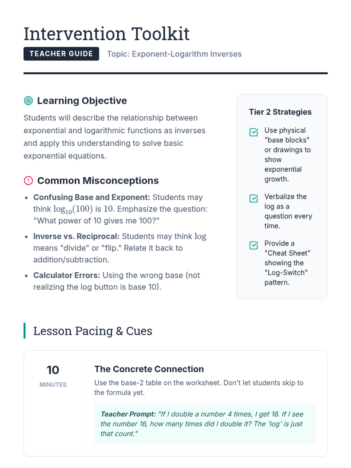 A targeted Tier 2 small group intervention focused on the inverse relationship between exponential and logarithmic forms, designed to help students master conversion and foundational problem-solving.