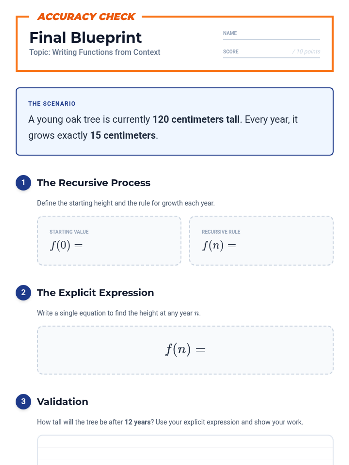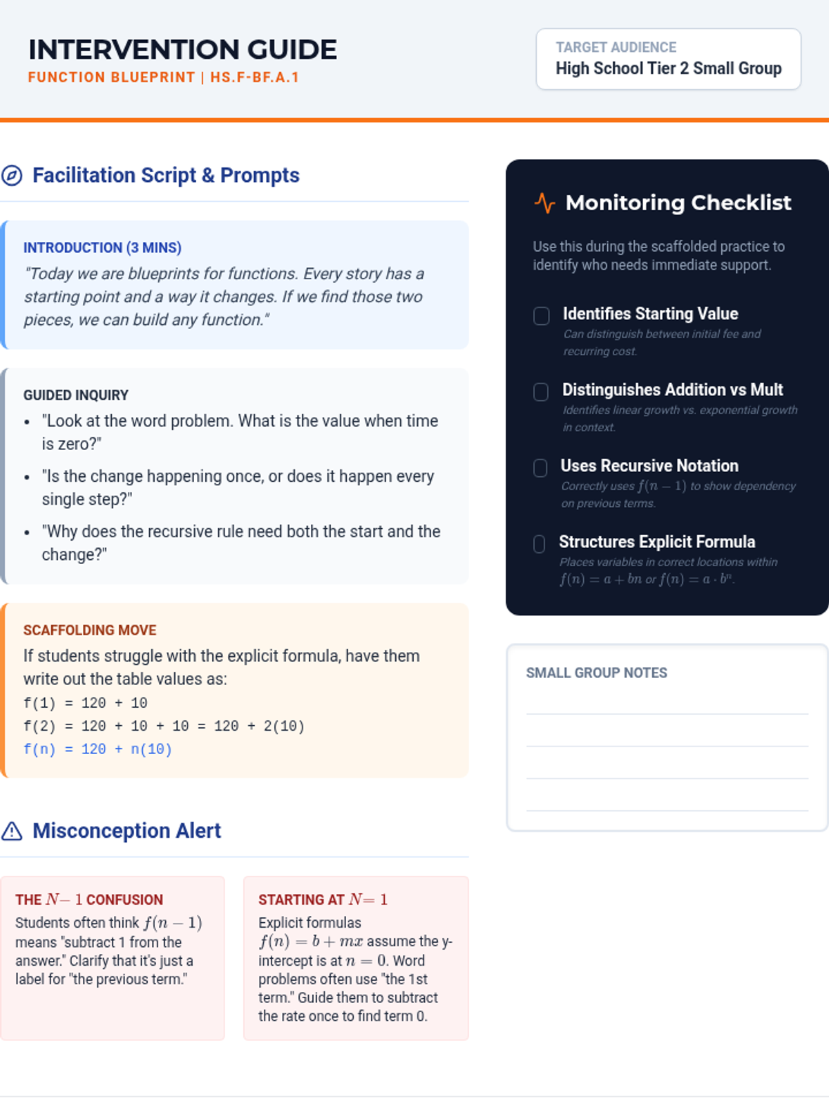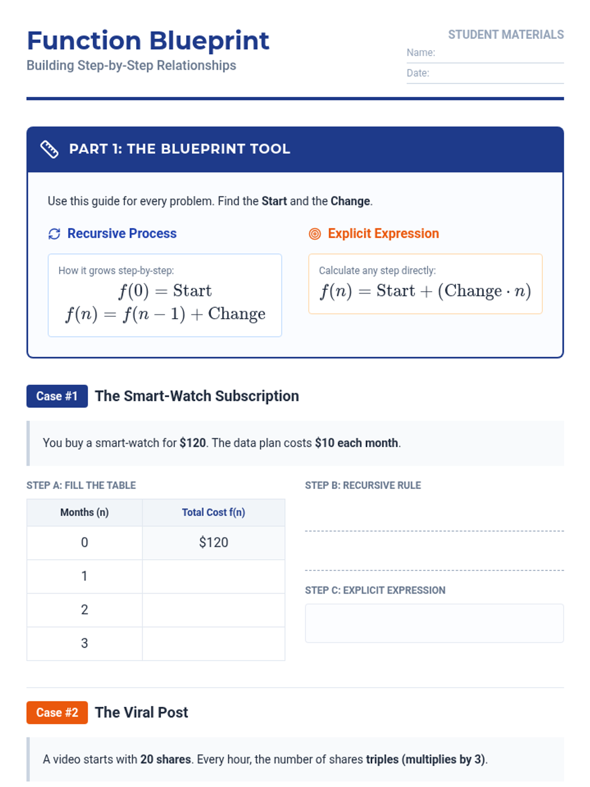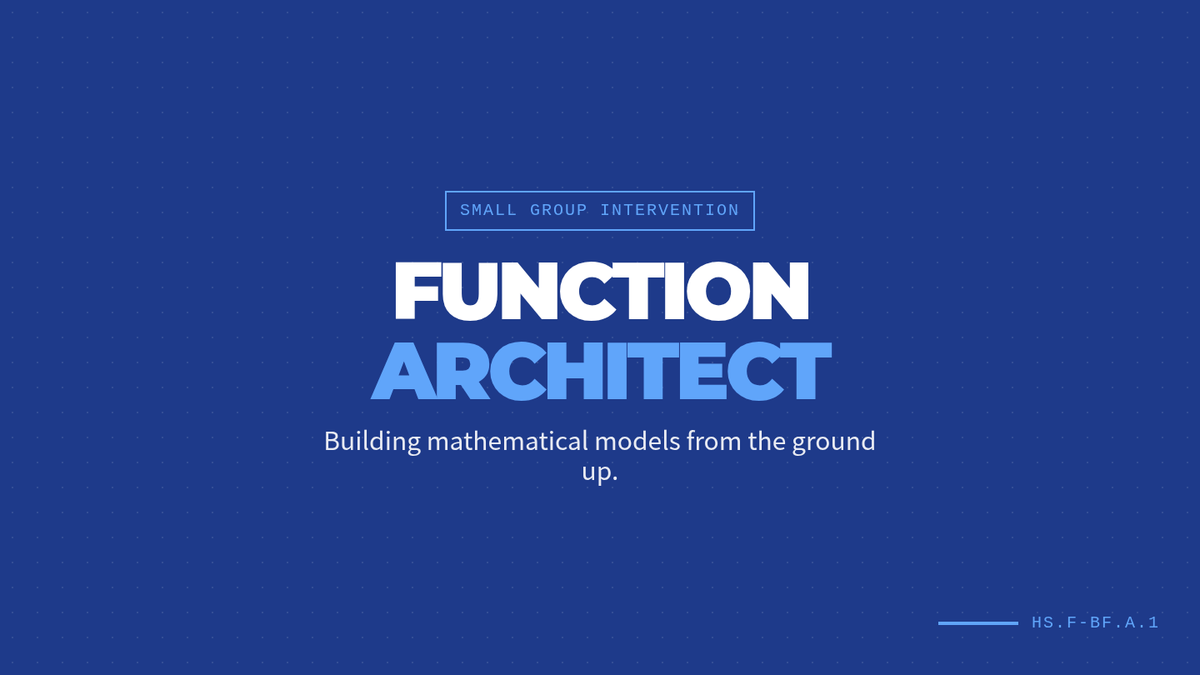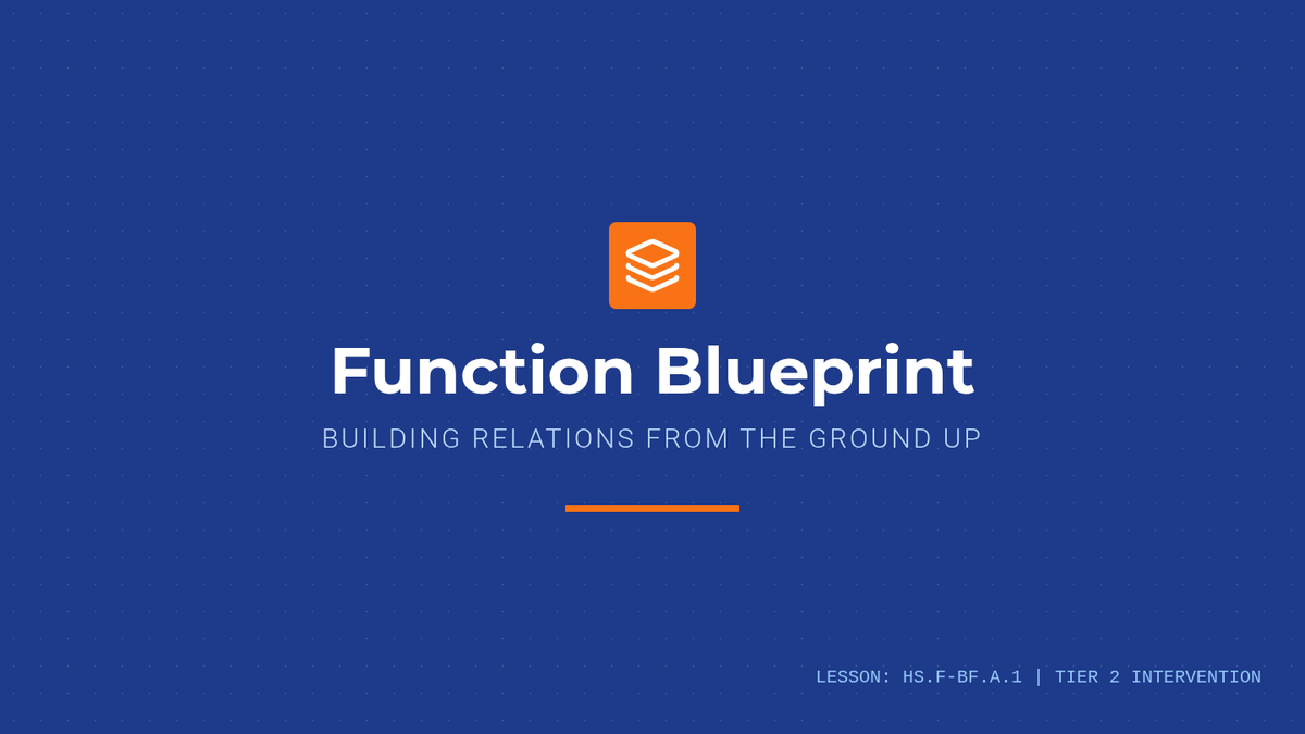 A targeted intervention lesson for high school students to master building functions from context using a scaffolded, 'blueprint' approach. Students move from identifying patterns in tables to writing recursive and explicit equations.
