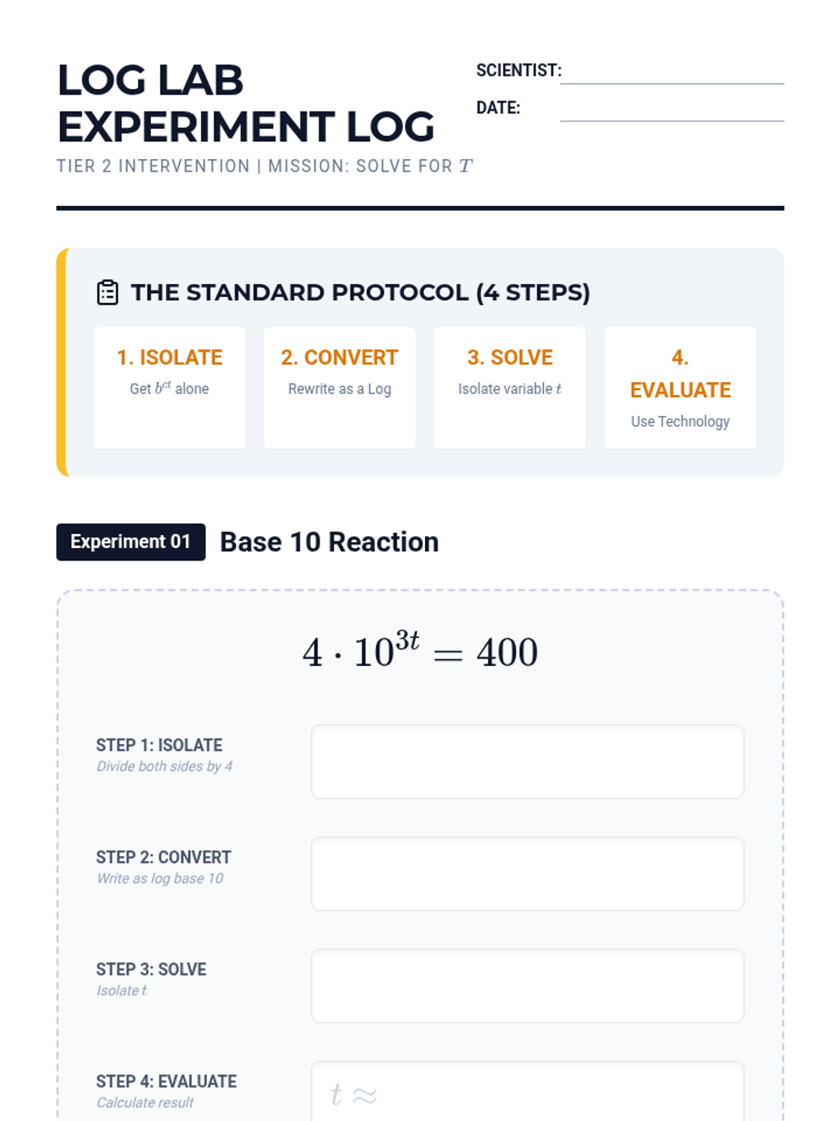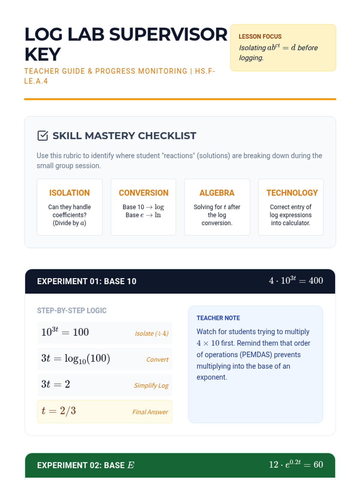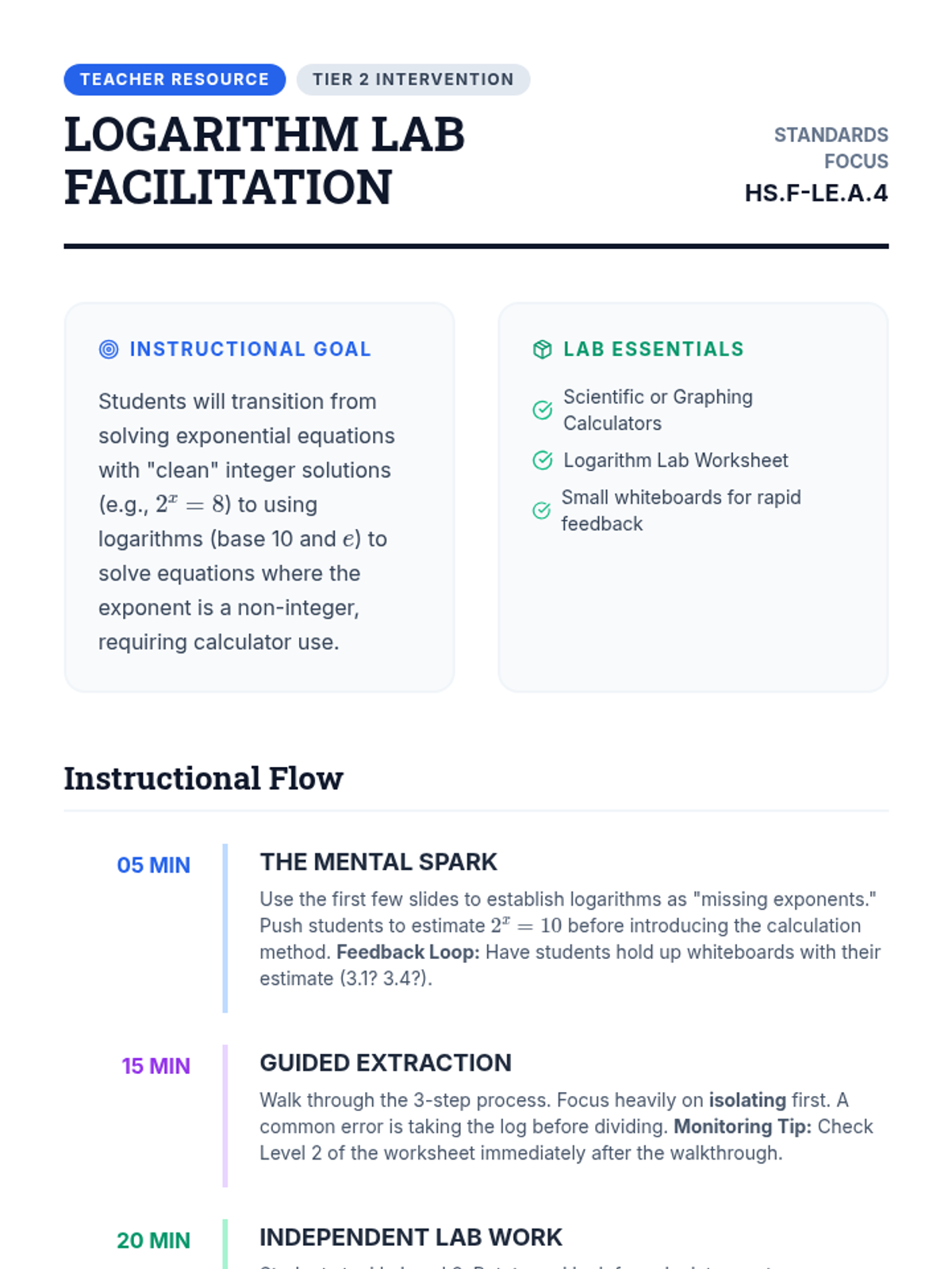A targeted Tier 2 small group intervention focused on solving exponential equations using logarithms with bases 2, 10, and e. This lesson scaffolds from simple integer powers to calculator-based non-integer solutions.