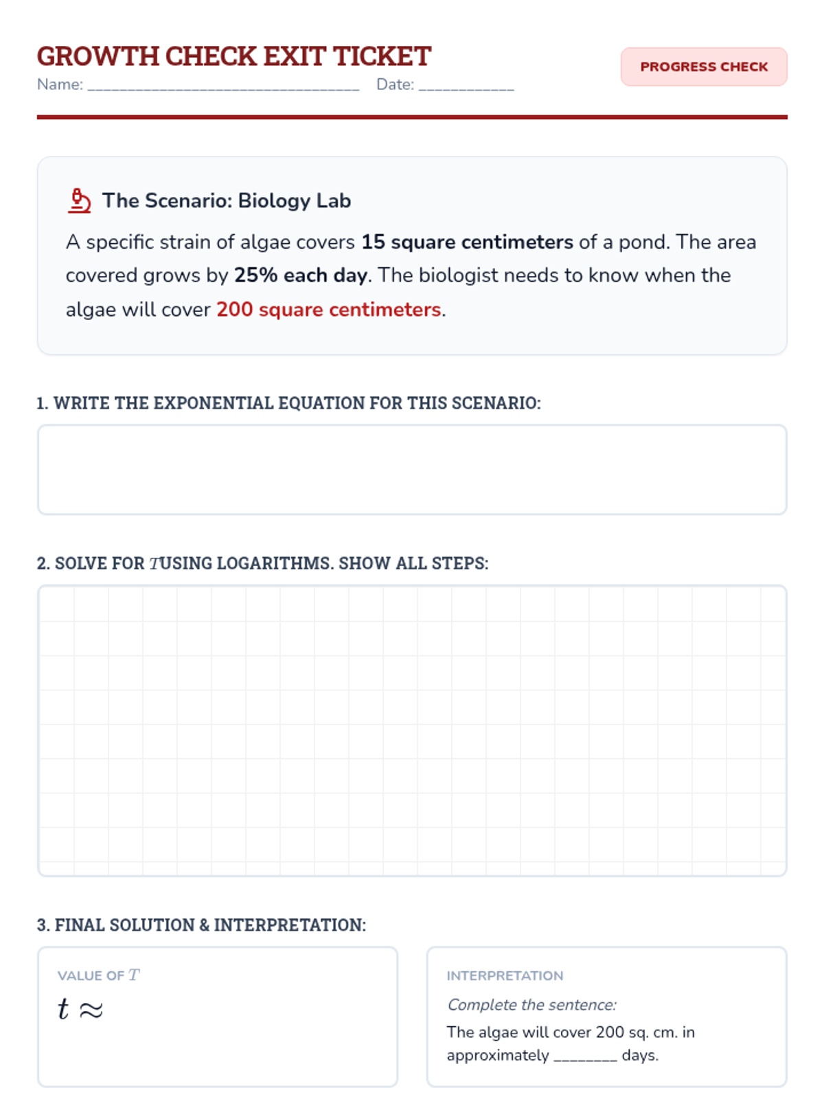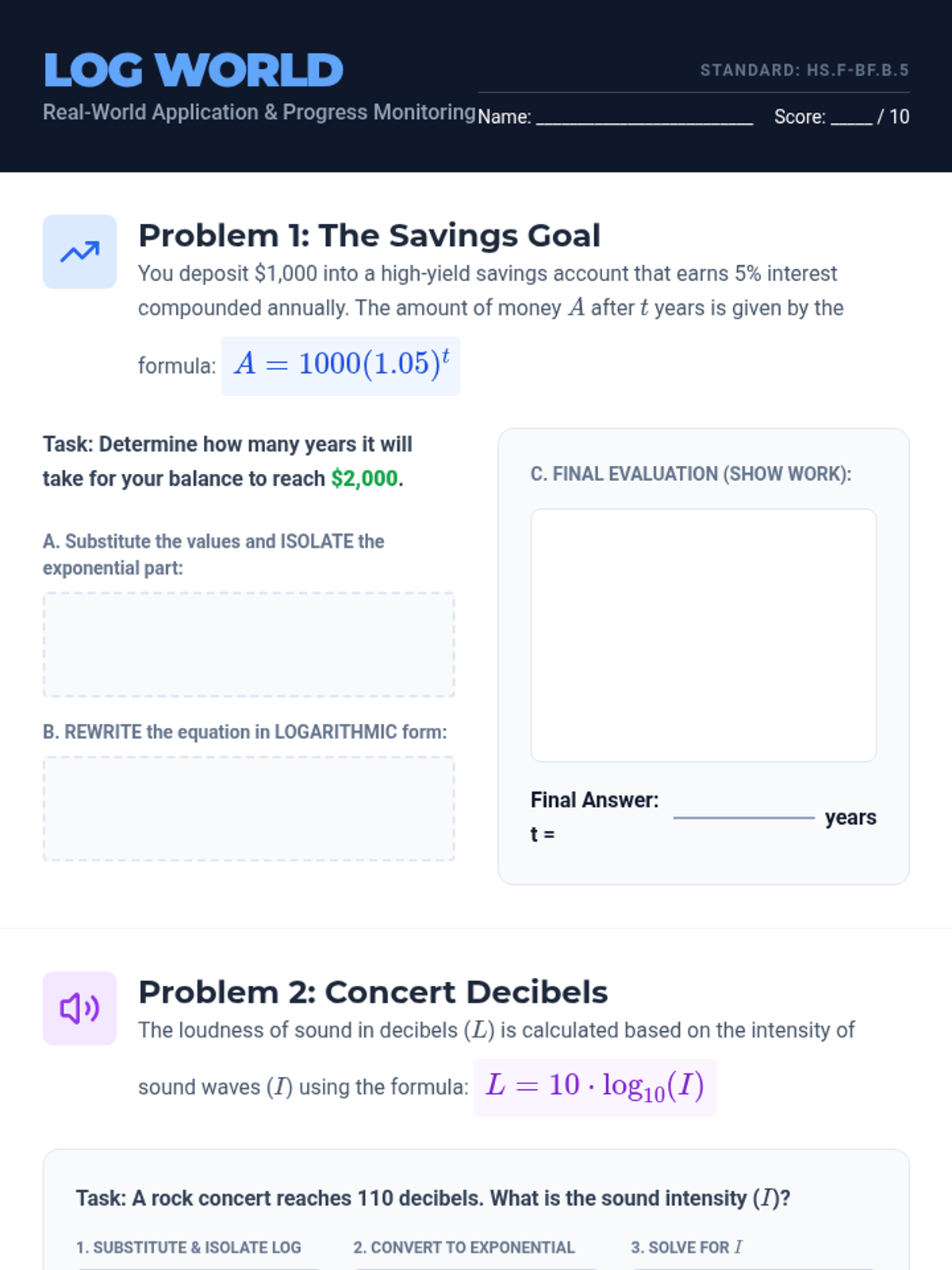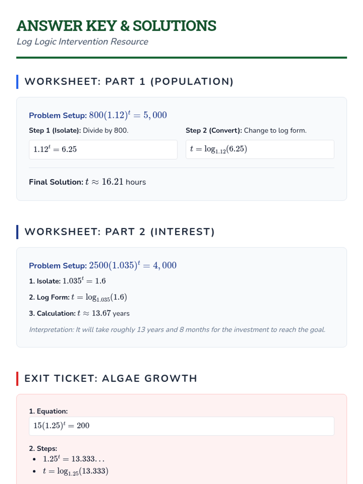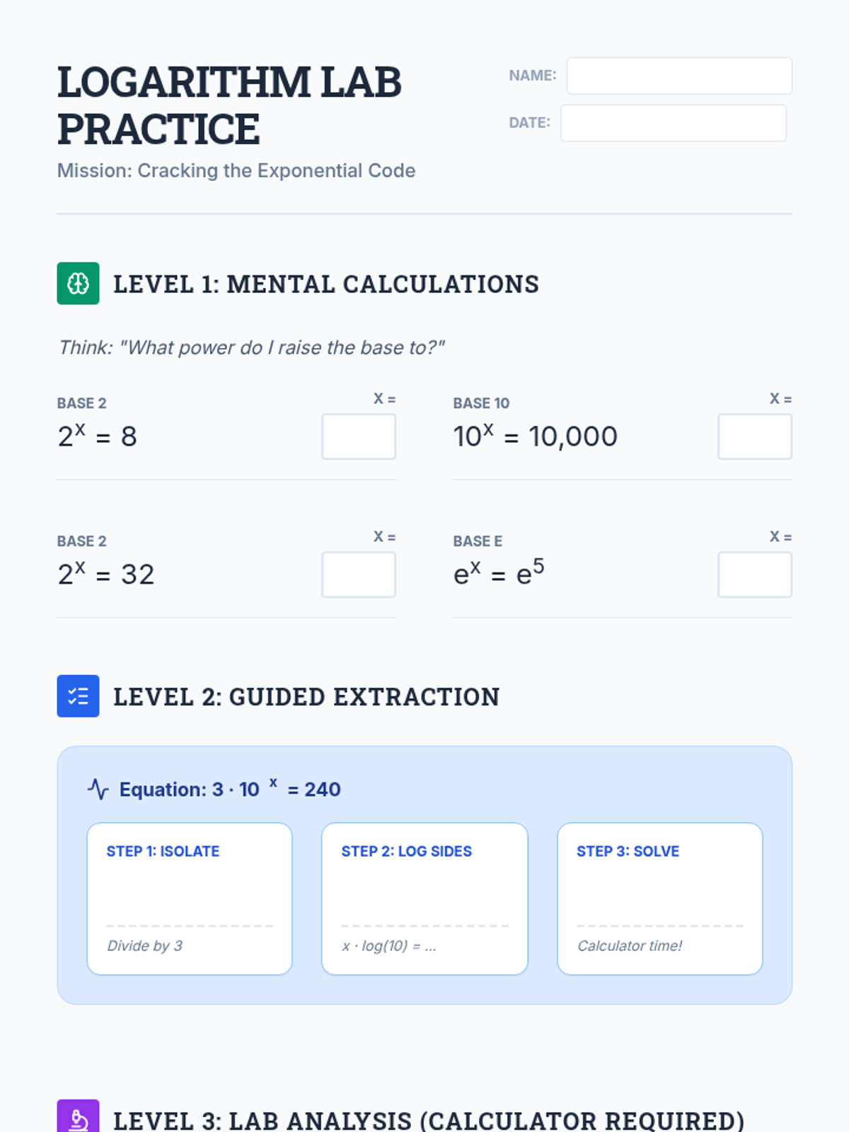 A targeted Tier 2 small group intervention focused on solving exponential equations using logarithms with bases 2, 10, and e. This lesson scaffolds from simple integer powers to calculator-based non-integer solutions.